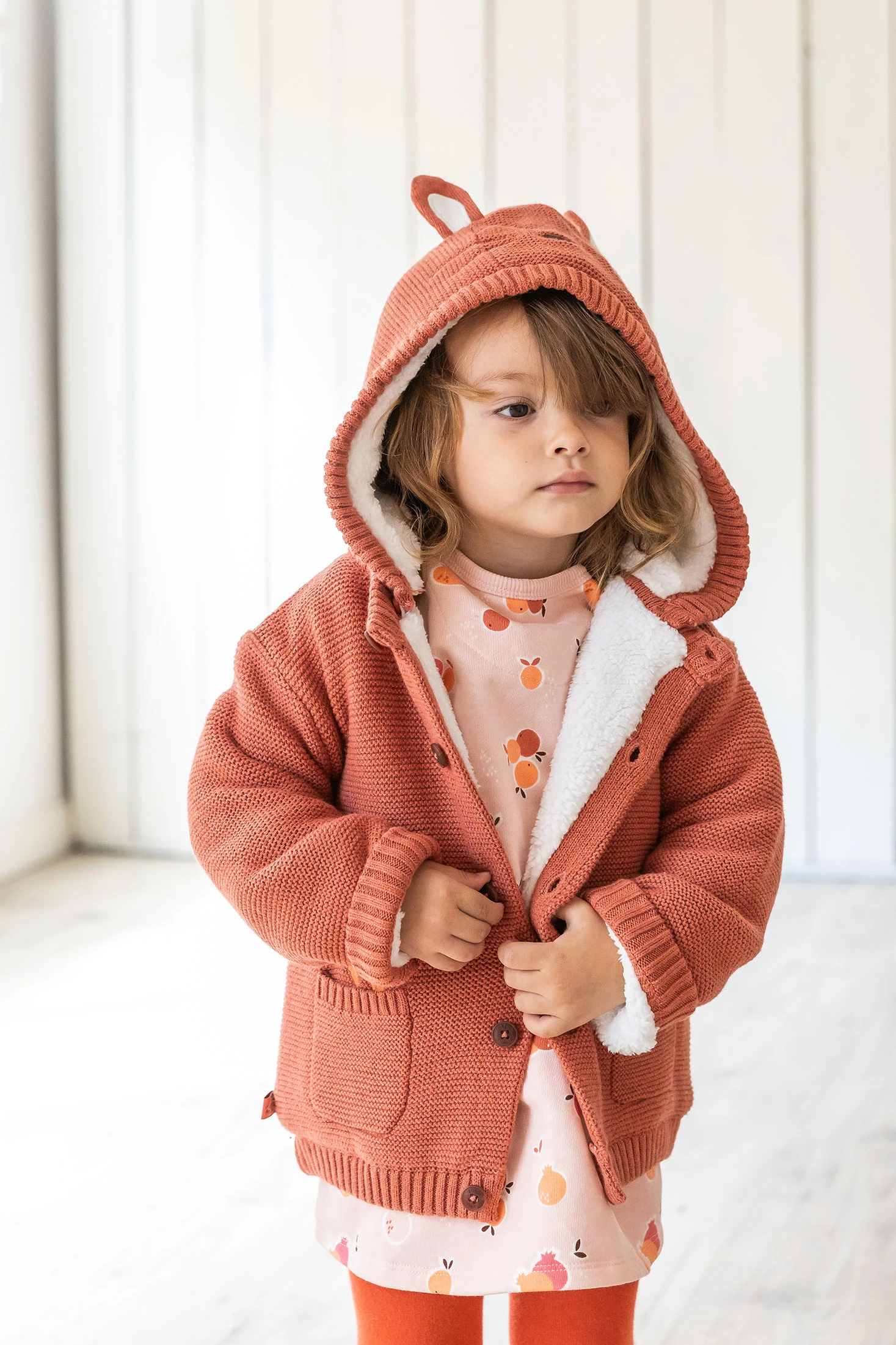 Baby jacket in a vibrant orange colour, adorned with adorable carrot motifs that add a cheerful touch to your little one's wardrobe. Ideal for the winter season, it is crafted from a soft and warm fabric that provides maximum comfort and warmth. The button closure allows for easy dressing of the baby, simplifying the daily routine for parents. Available in sizes from 1 month to 24 months, it is a versatile garment perfect for both everyday wear and special occasions. Pair it with neutral or patterned trousers to achieve a harmonious and charming look.