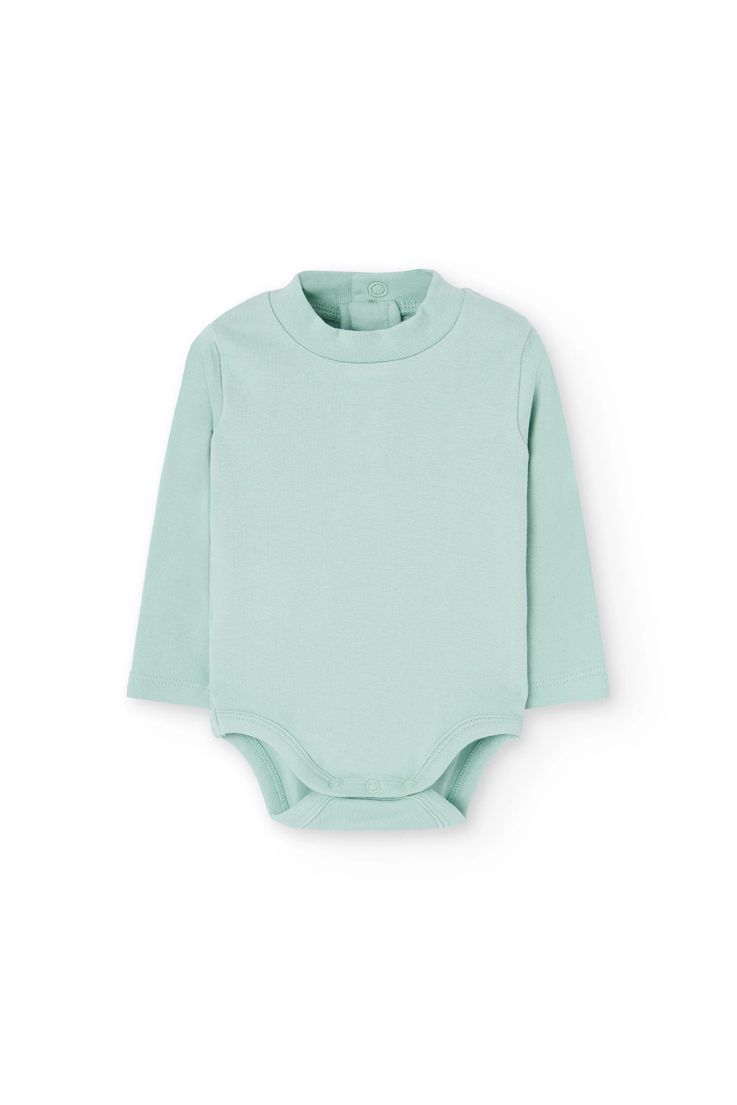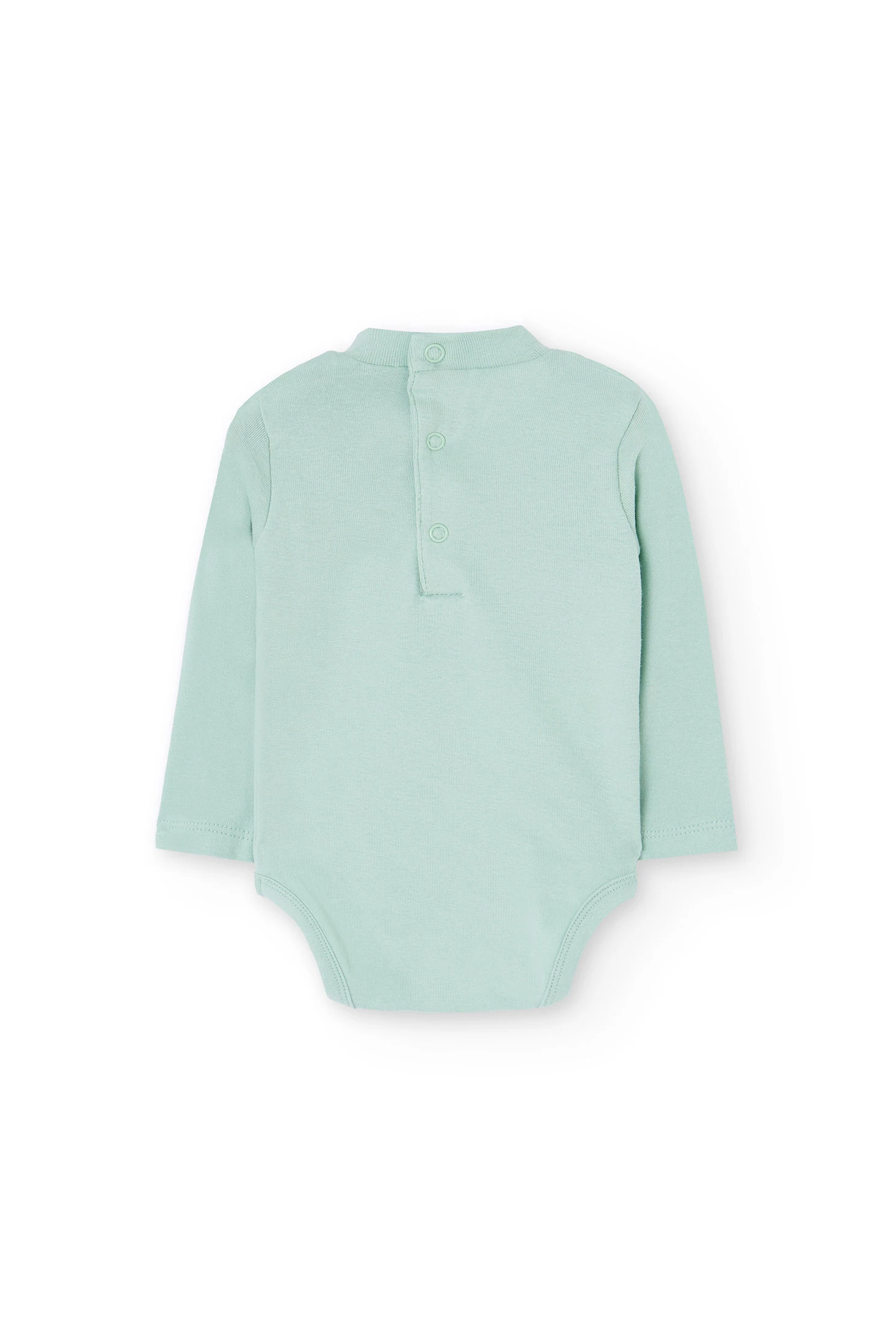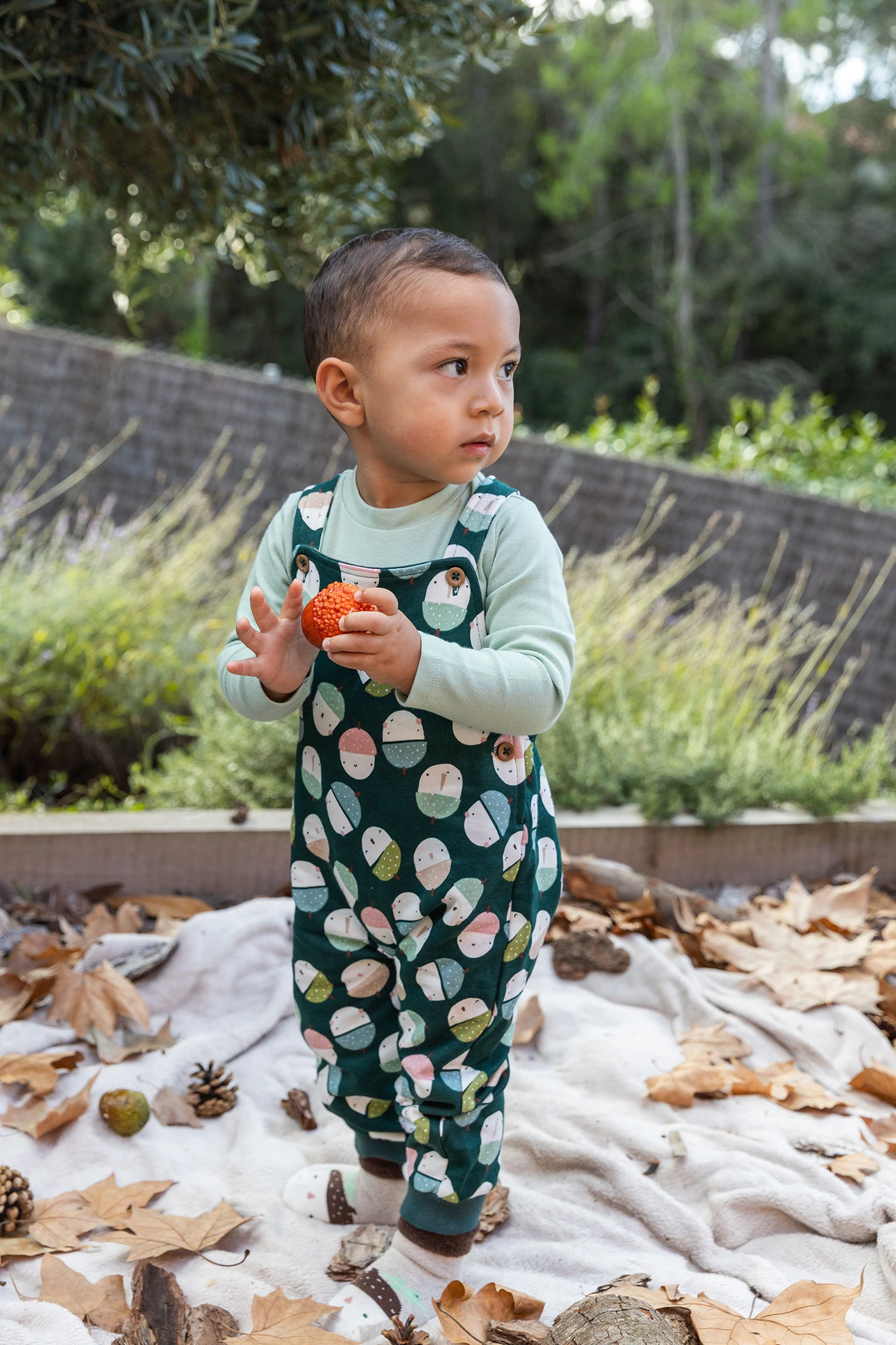 Light green knit set for baby, consisting of a long-sleeved bodysuit and dungarees with a smiling acorn print. Made from soft cotton, it's ideal for keeping your baby comfortable and warm during cooler seasons. The decorative buttons on the dungaree straps add a charming and practical detail, making it easy to put on. Available in various sizes, it easily pairs with knitted booties or lightweight jackets for a complete and adorable look.