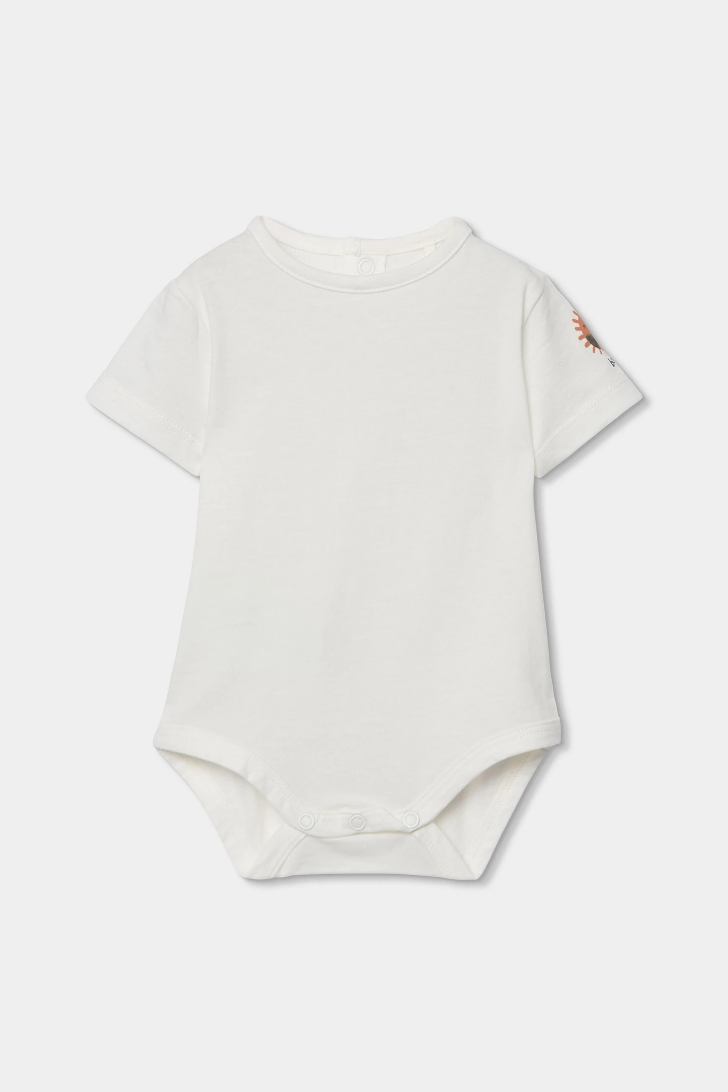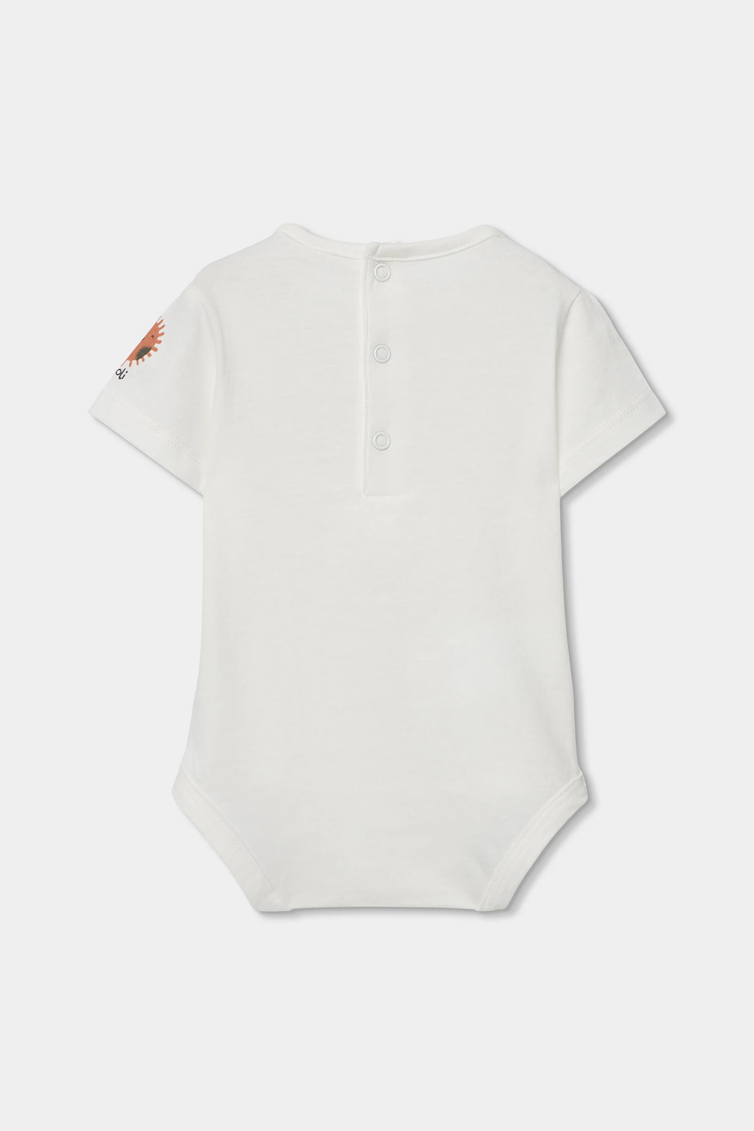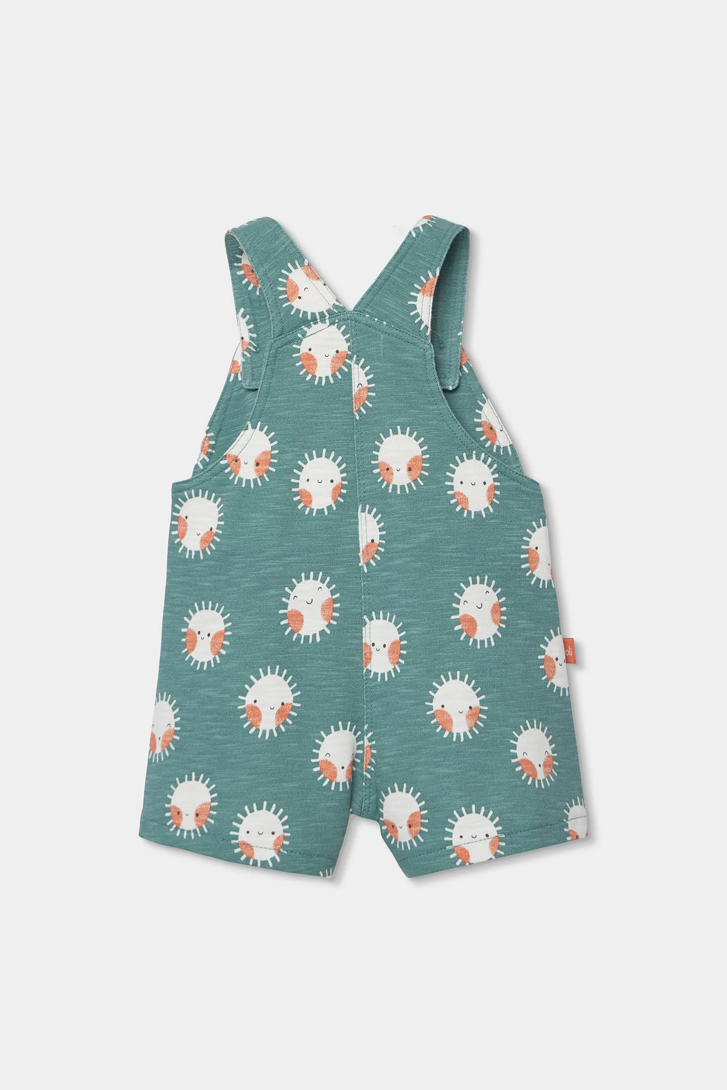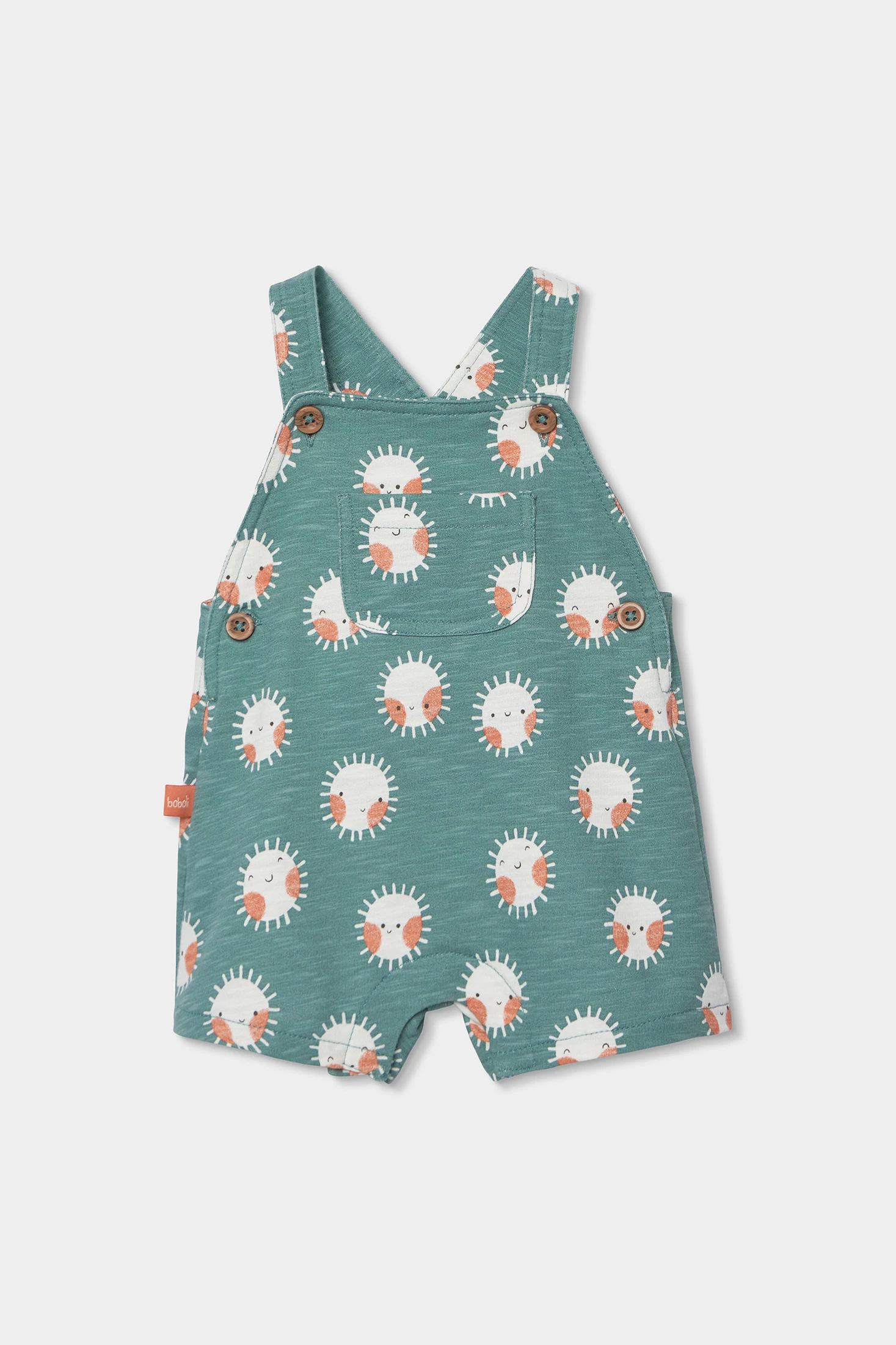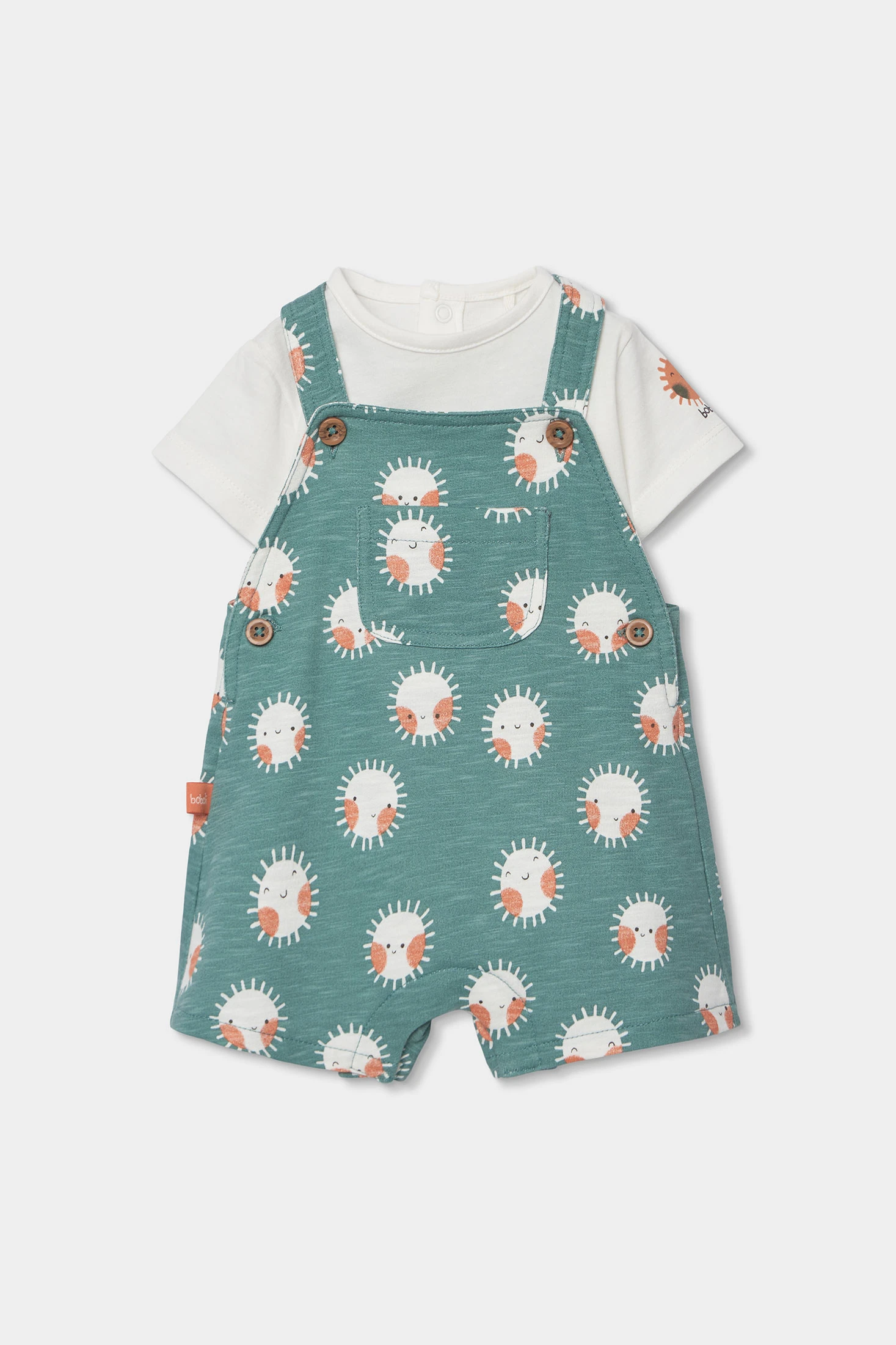 Soft set for a boy. It includes a white short-sleeved bodysuit and green dungarees with an adorable sun print. Perfect for daily wear, combining comfort and style. Sizes range from 1 month to 24 months, accommodating the child's growth. The buttons on the dungaree straps make changing clothes easy. Its cheerful and colourful design makes it ideal for any occasion.