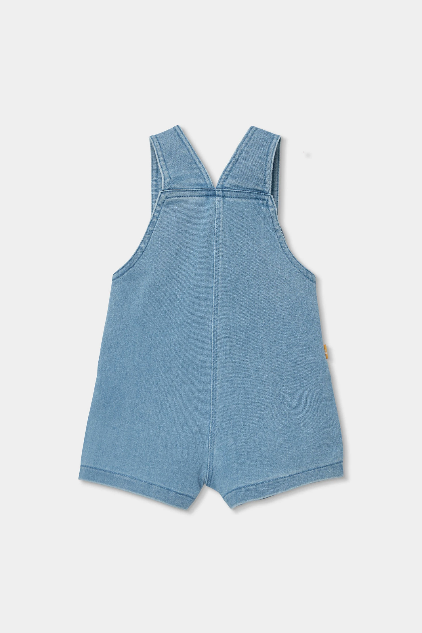 Baby boy outfit that combines a printed cotton t-shirt with denim dungaree shorts. The t-shirt features colourful prints on a white background, while the dungarees have a fun embroidered crab design. Made for comfort, it is ideal for ages 1M to 24M. Perfect for everyday wear, combining style and functionality, it stands out with its fresh and soft fabric for babies.