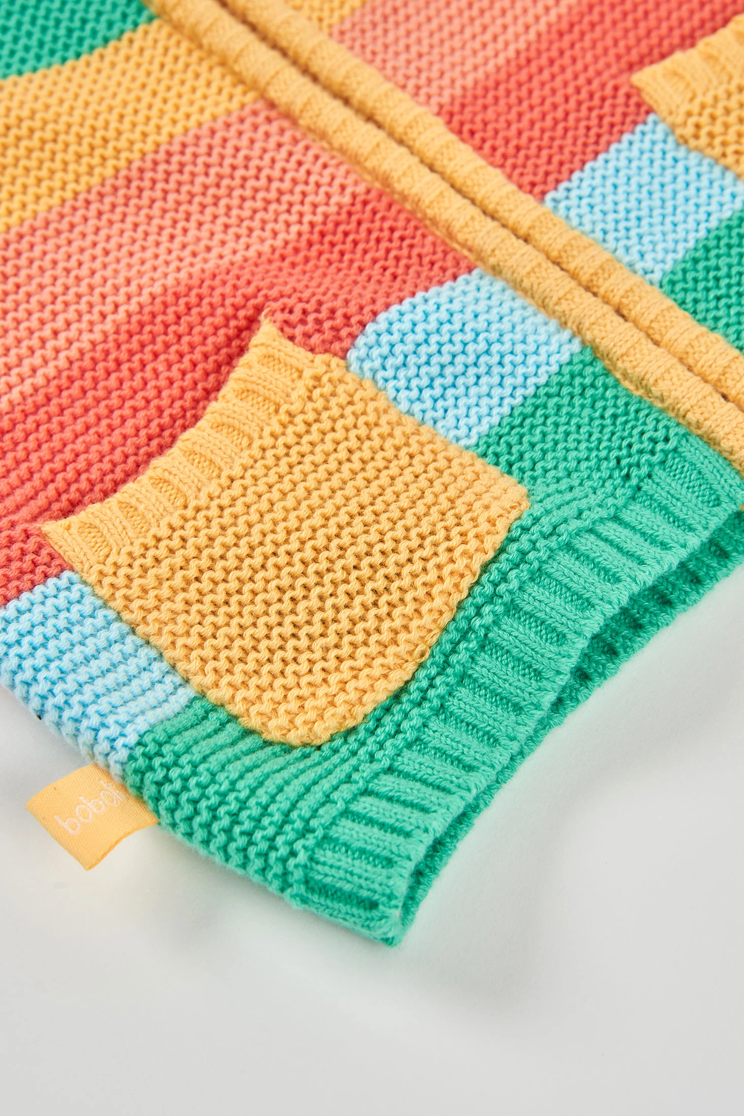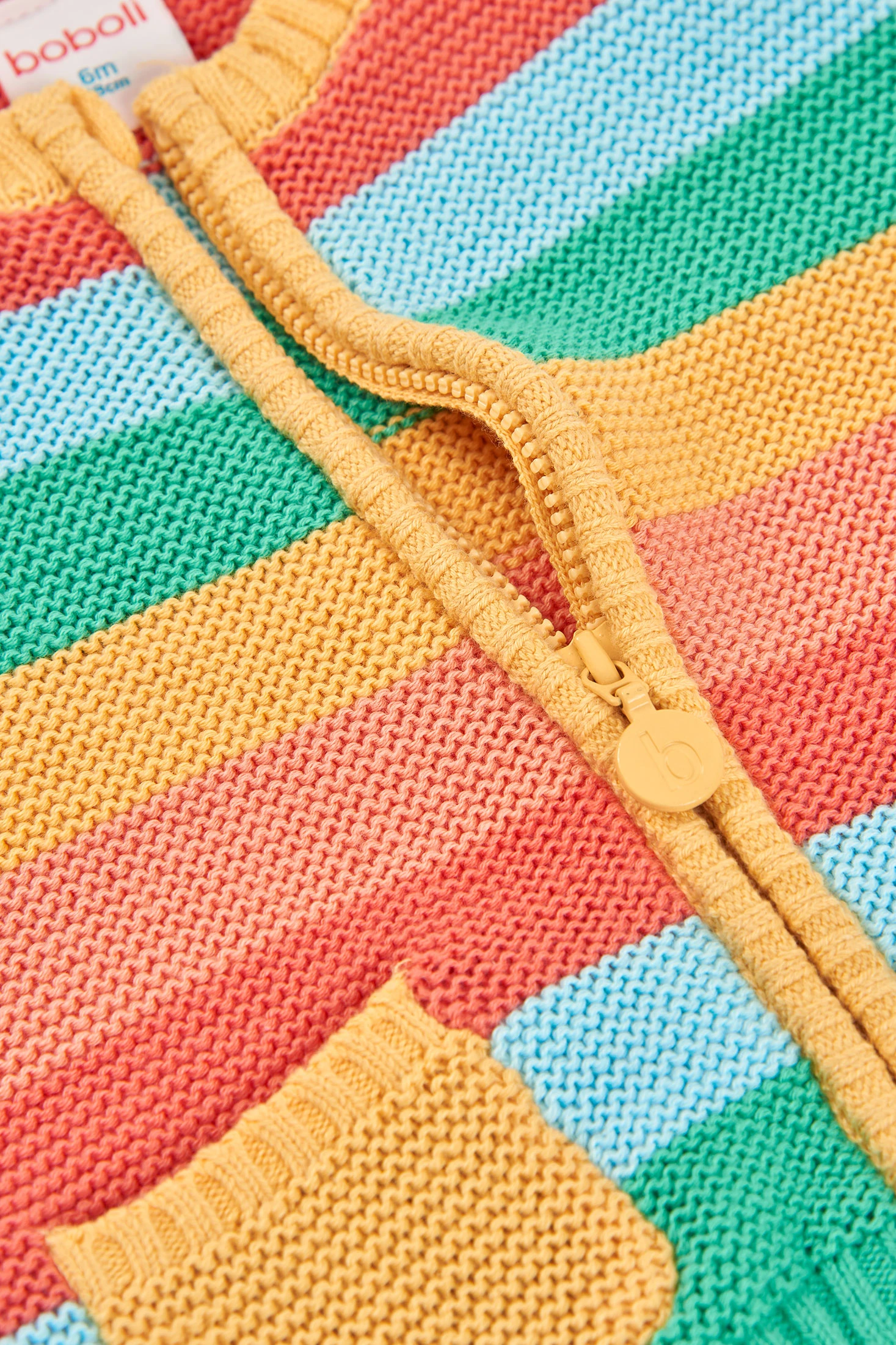 Striped knitted jacket in shades of yellow, blue, green, and coral, ideal for babies. Its soft fabric provides warmth and comfort. With a vibrant stripe design and a practical zip closure, it's perfect for adding a splash of colour to any outfit. Includes cute front pocket details. Suitable for ages 1 to 24 months. A modern and functional garment to keep your baby warm and stylish on the cooler days of summer and spring.