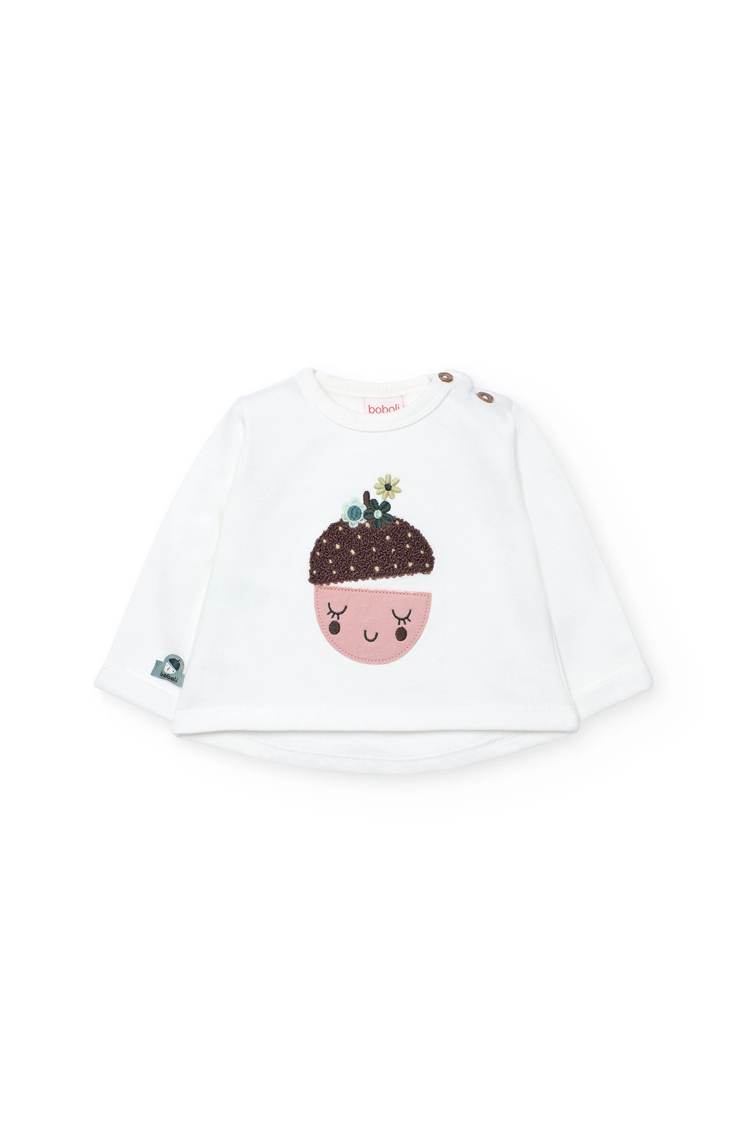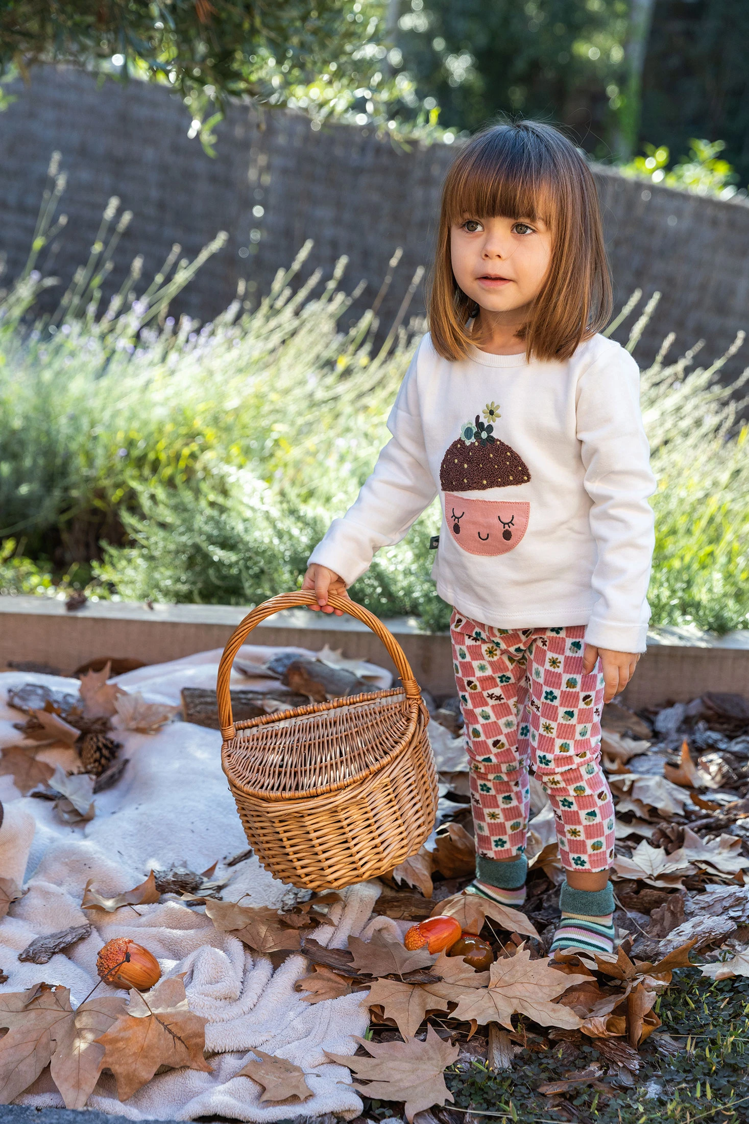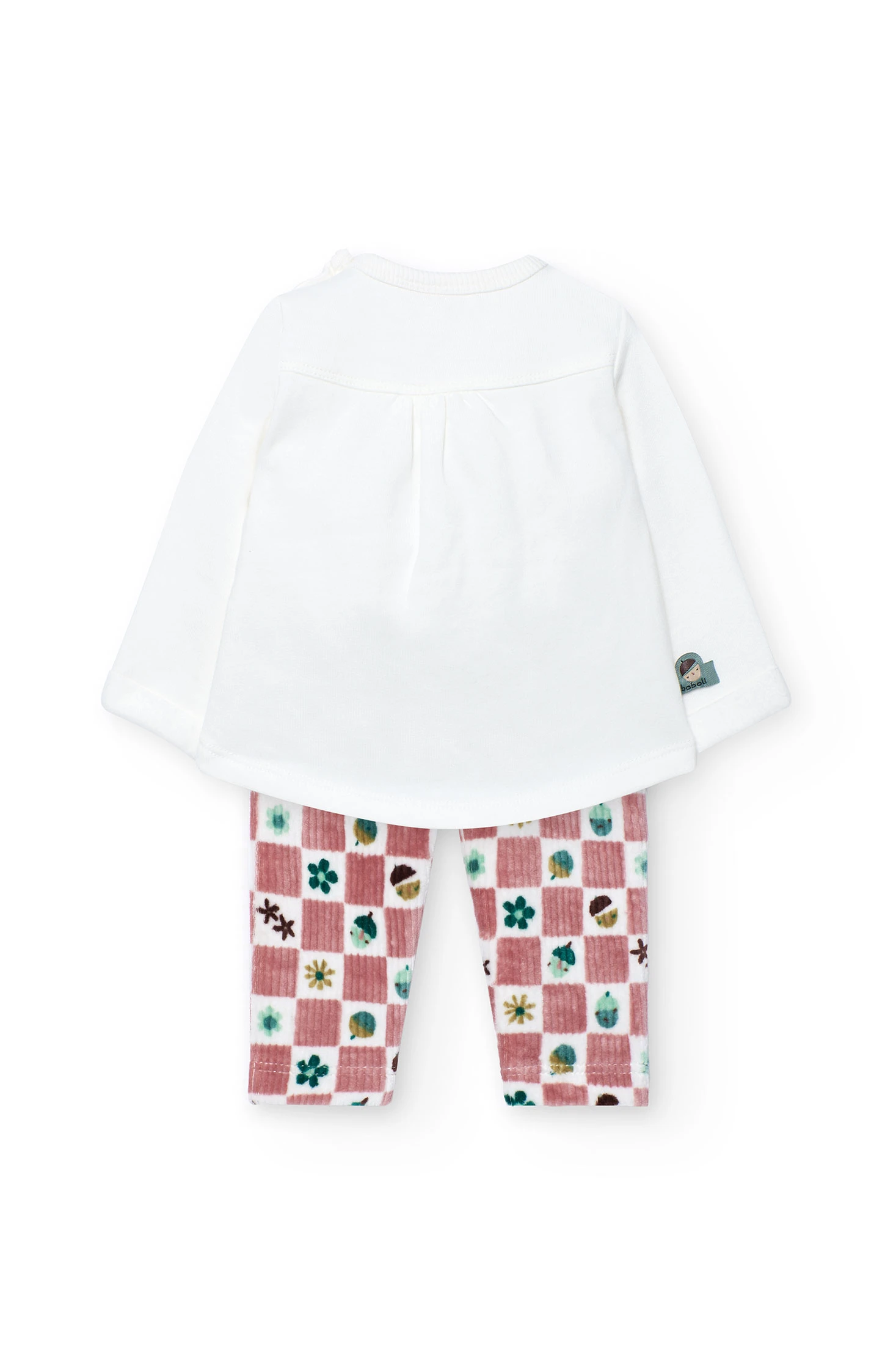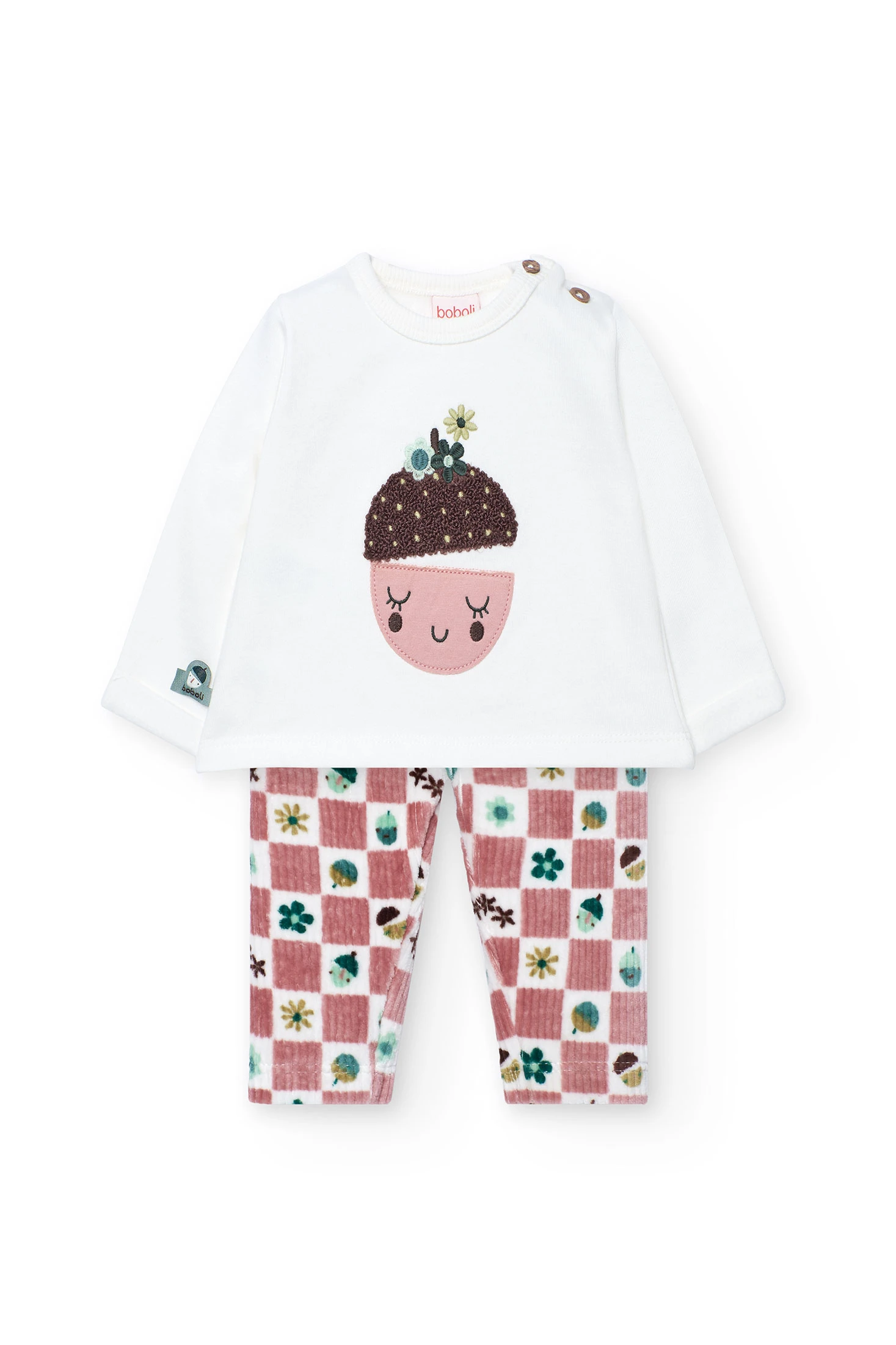 Baby set available in sizes from 1 month to 2 years. The top, in white colour, features a cheerful design of a smiling face and floral details, crafted from soft and comfortable fabric. Trousers with a checkered print in shades of pink and brown, embellished with floral and leaf motifs, add a playful touch. Made from warm materials and equipped with long sleeves, it is perfect to keep your little one warm during autumn and winter. Ideal for everyday wear, it combines style with functionality for any occasion.