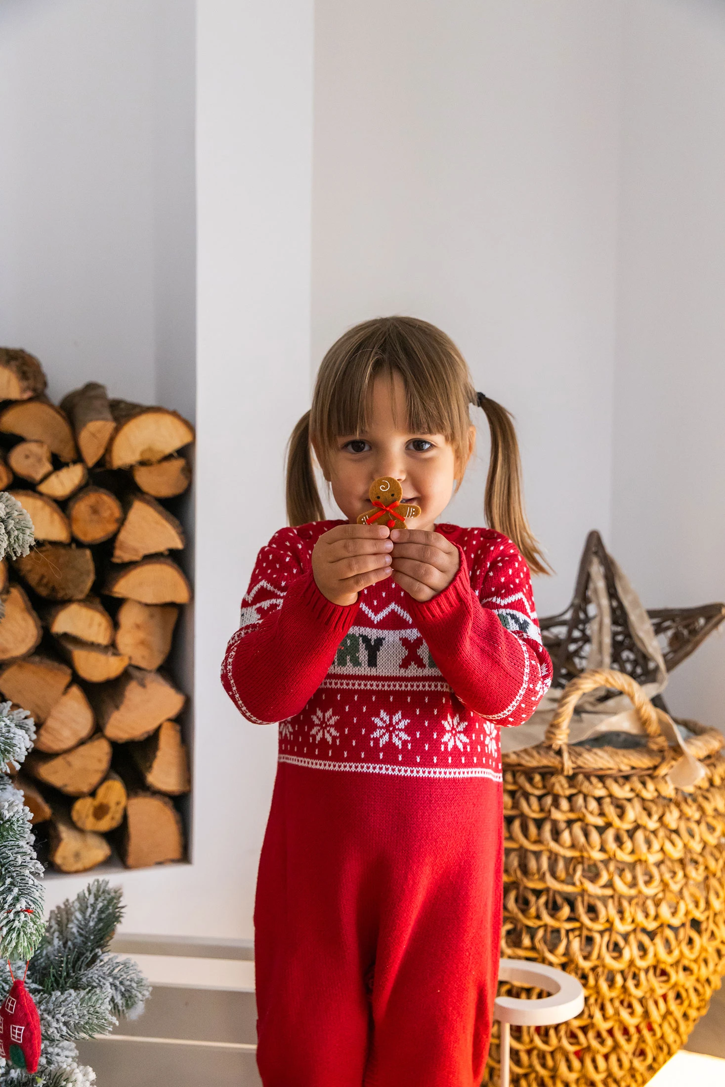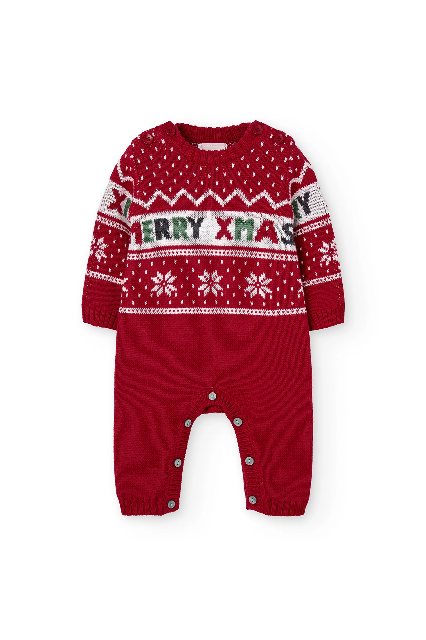 Red knitted babygrow for baby, perfect for the Christmas season, combining warmth and festive style with its charming design. Crafted from soft knit fabric, it offers comfort during winter and features the phrase "MERRY XMAS" alongside attractive winter motifs. Buttons on the shoulders and legs allow for efficient nappy changes, ensuring practicality for parents. Available in sizes from 1 month to 2 years, it is perfect for making your baby look adorable at Christmas celebrations.