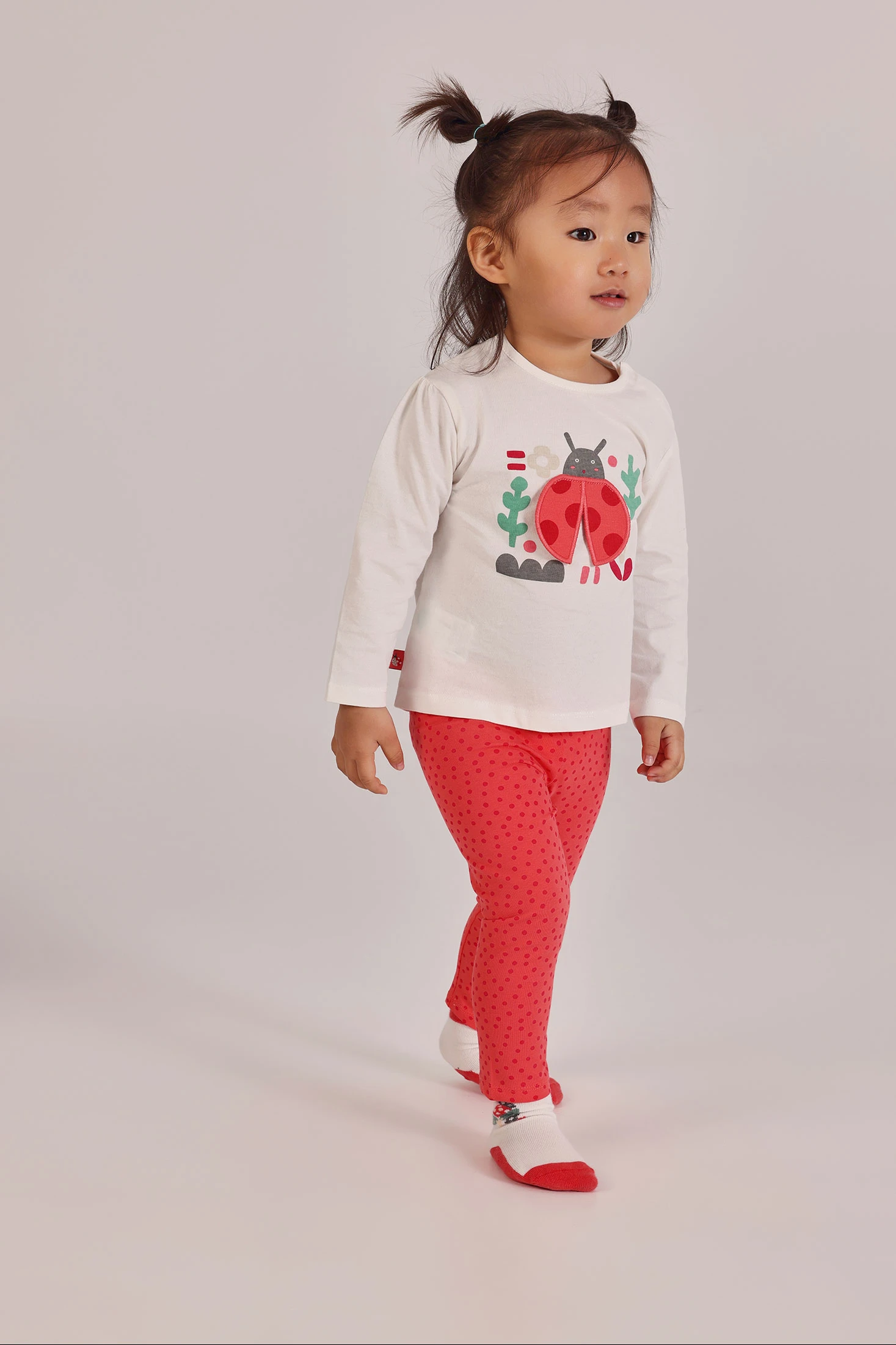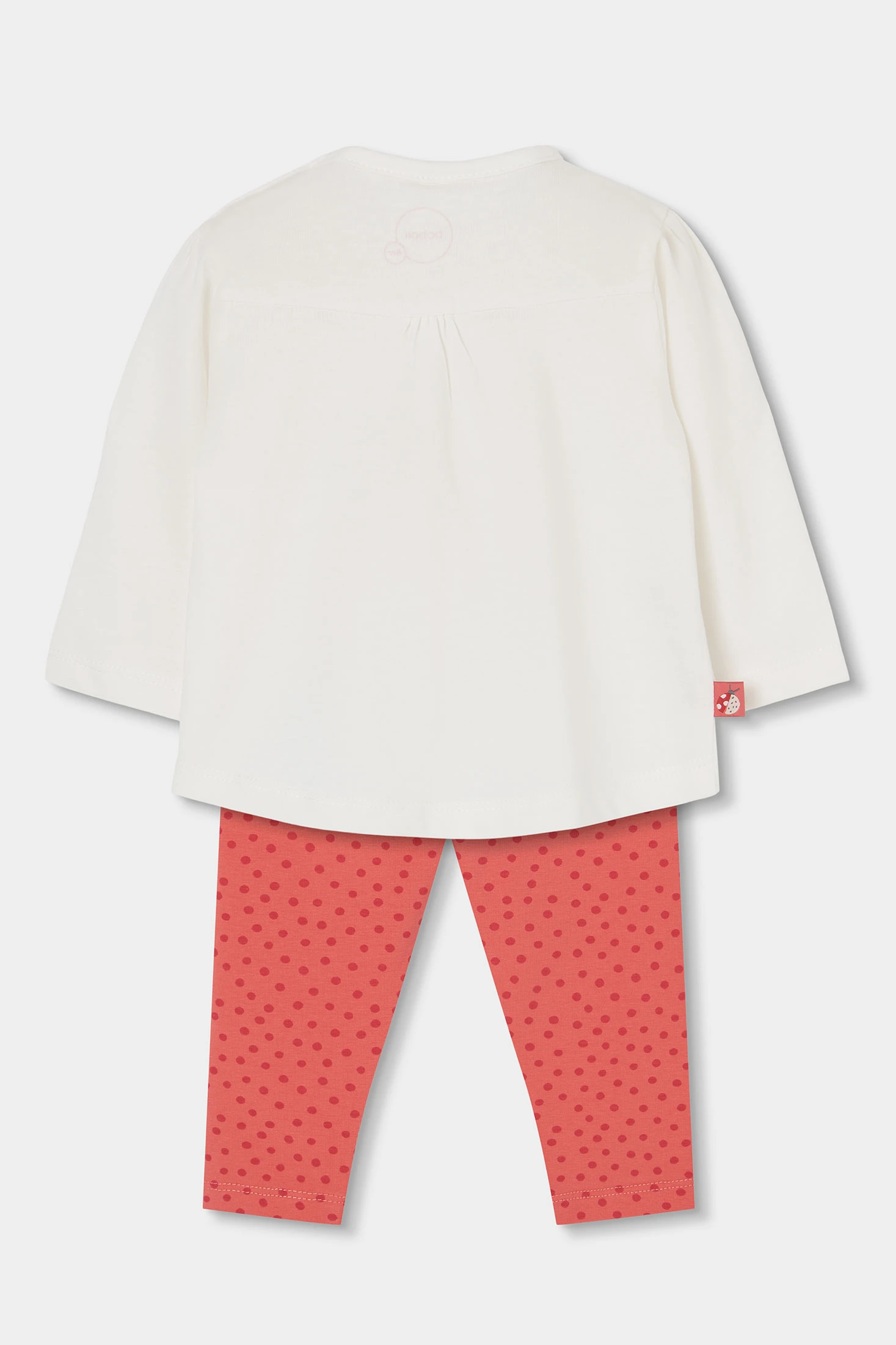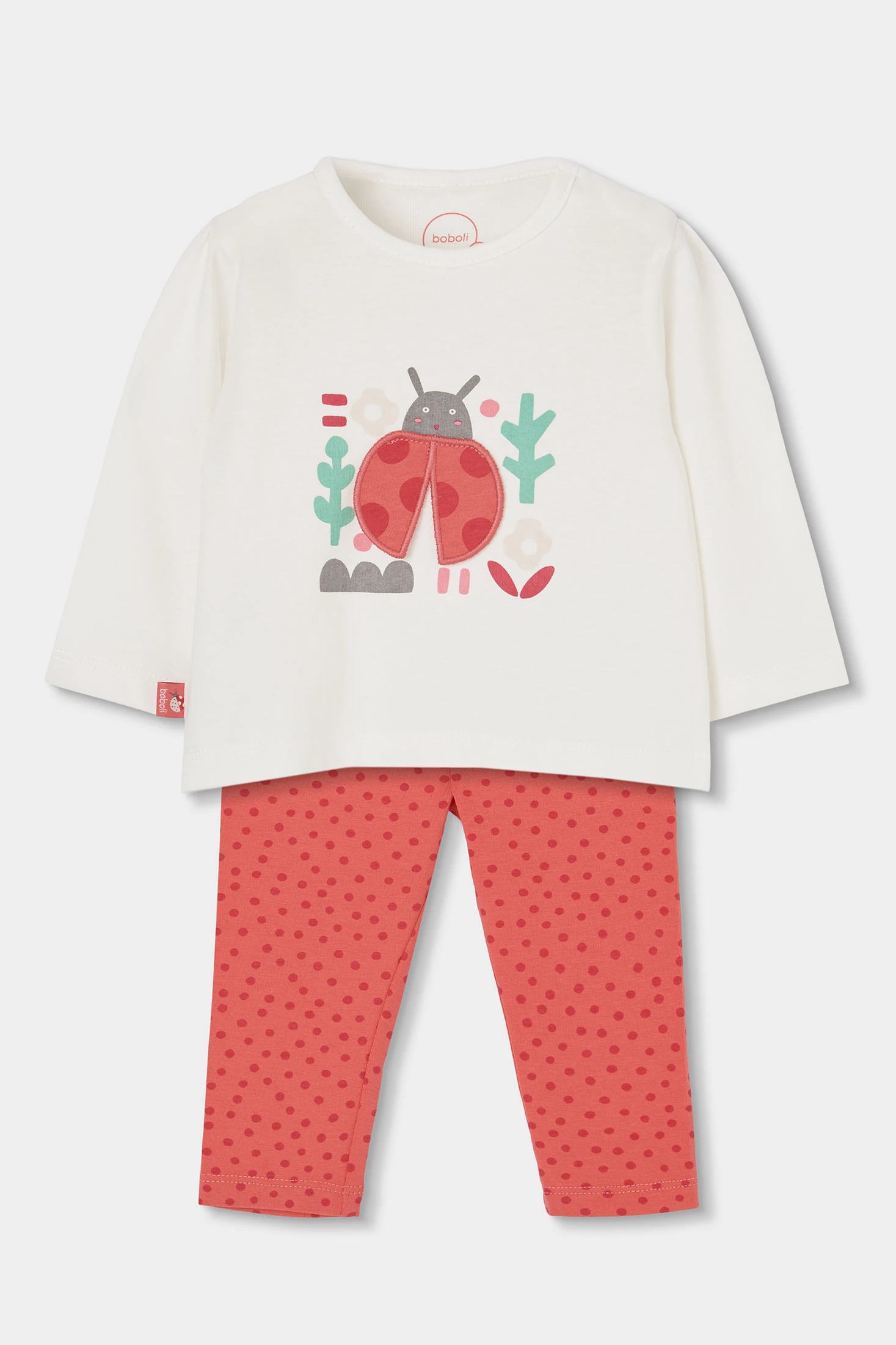 Cotton set for girls, available in sizes from 1 month to 24 months. The top garment is white with a charming ladybird and floral print, adding a fun touch. The long sleeves provide warmth, while the cotton fabric ensures comfort. The trousers are red with a polka dot design, perfectly complementing the shirt. A versatile and comfortable set, perfect for keeping your baby stylish throughout the day.