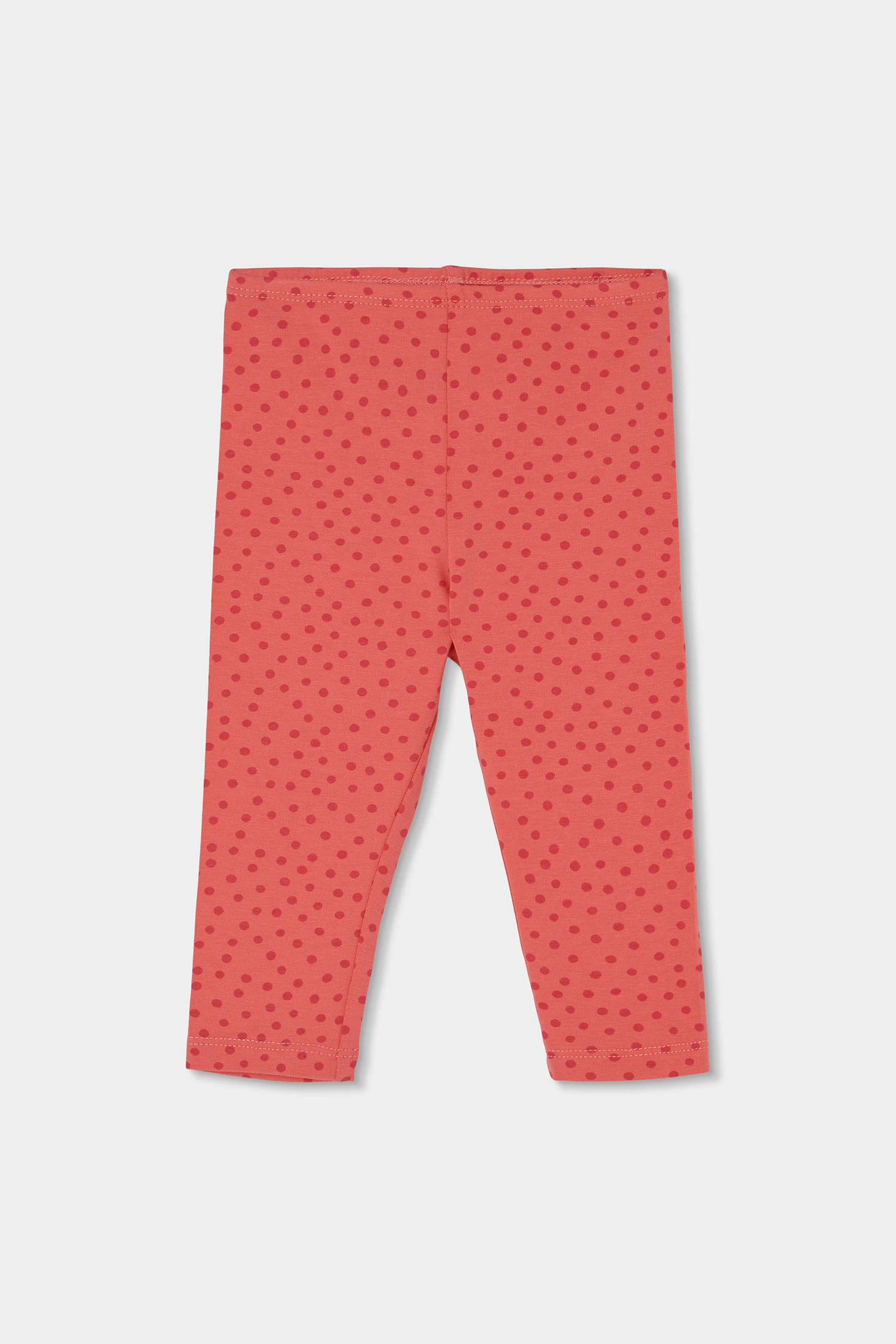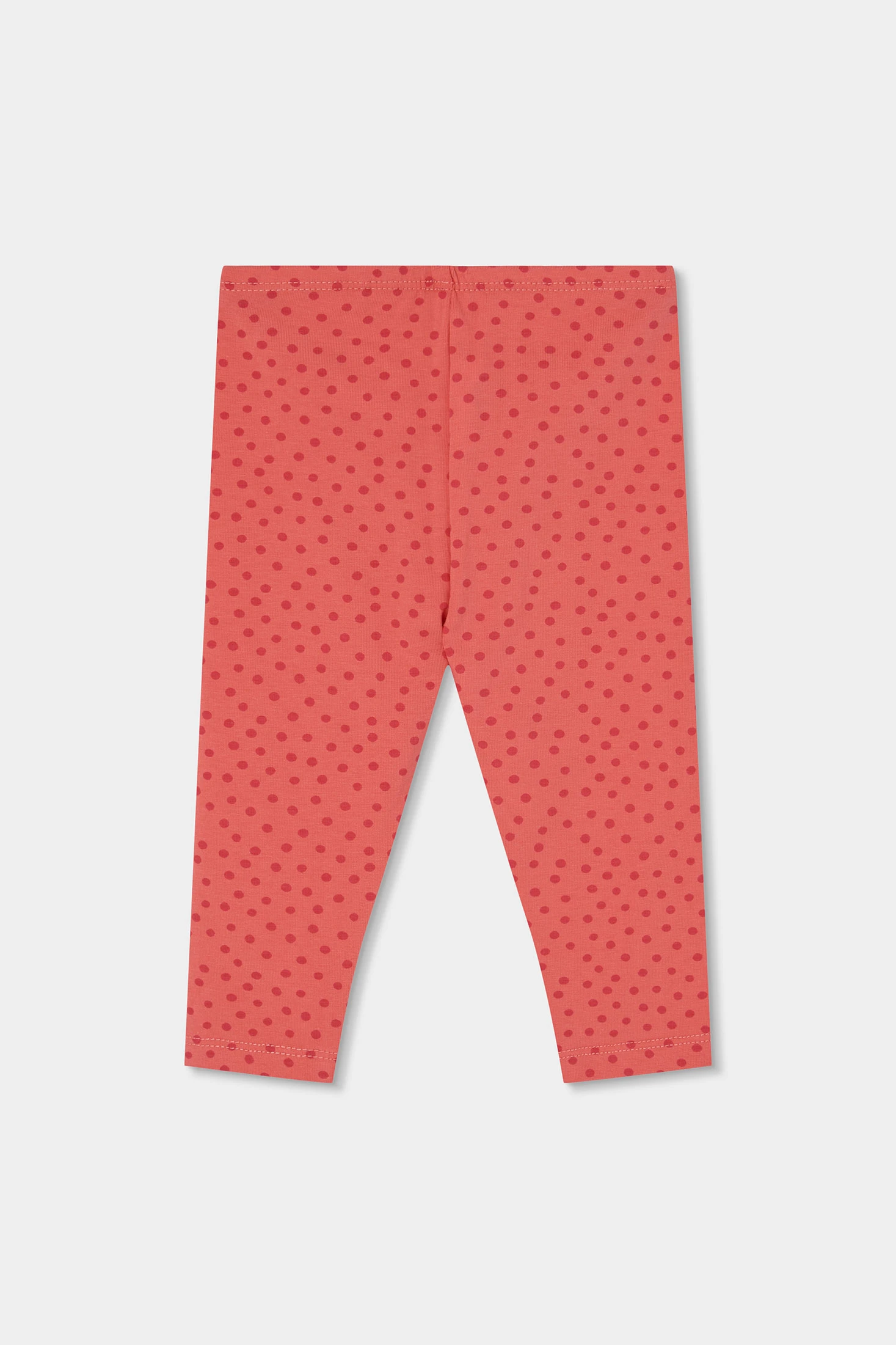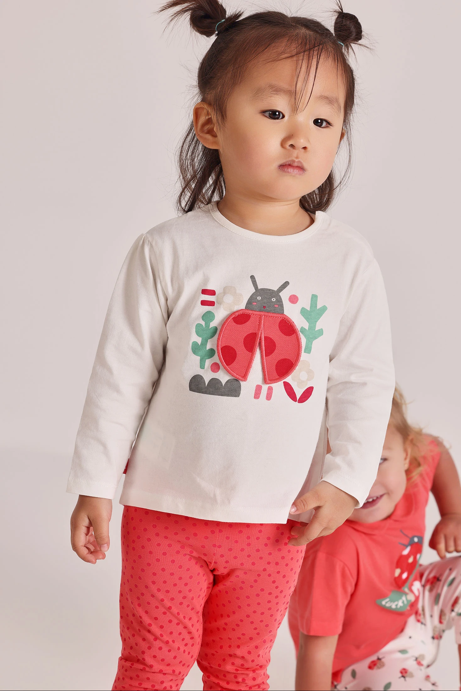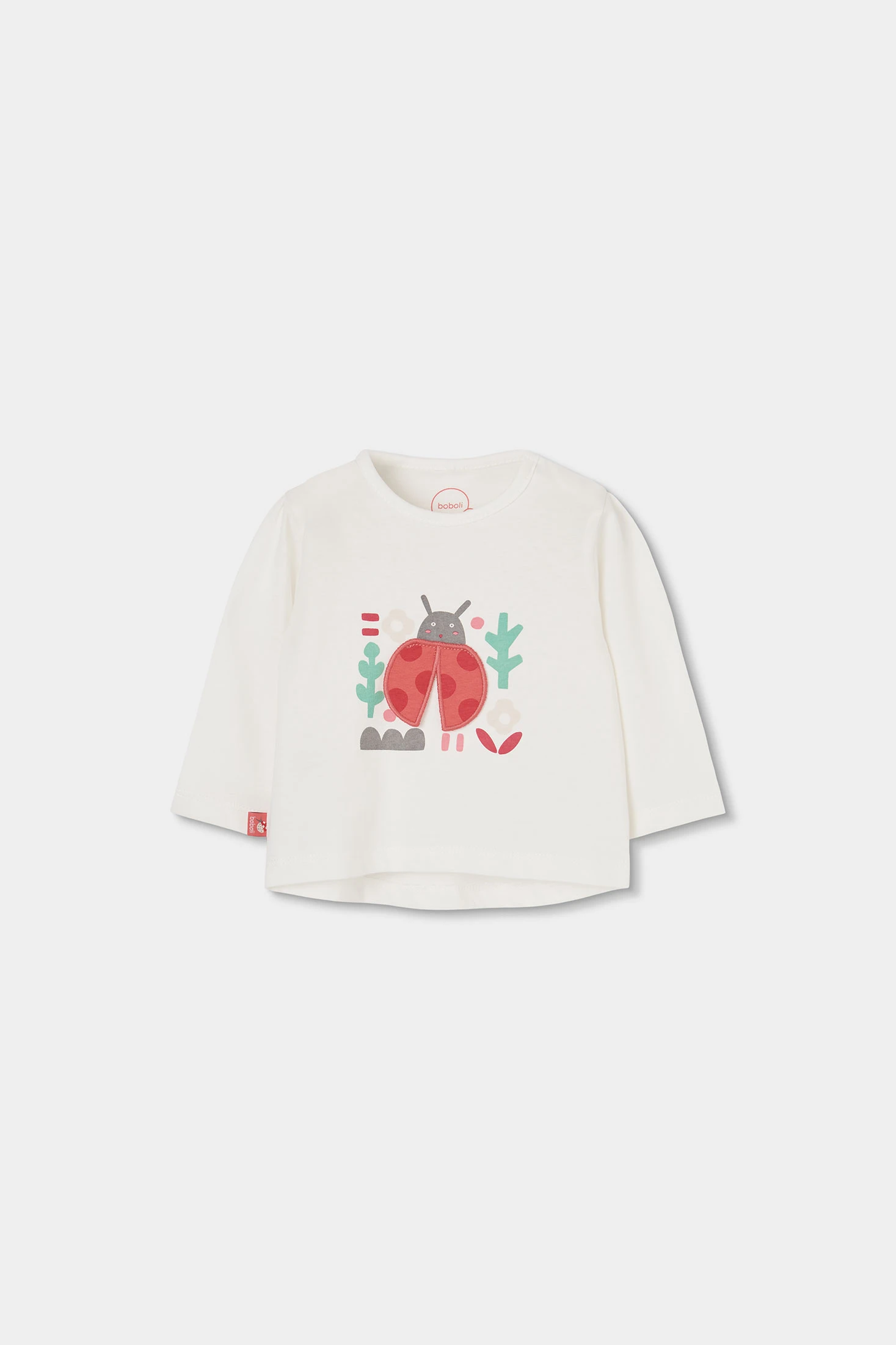 Cotton set for girls, available in sizes from 1 month to 24 months. The top garment is white with a charming ladybird and floral print, adding a fun touch. The long sleeves provide warmth, while the cotton fabric ensures comfort. The trousers are red with a polka dot design, perfectly complementing the shirt. A versatile and comfortable set, perfect for keeping your baby stylish throughout the day.