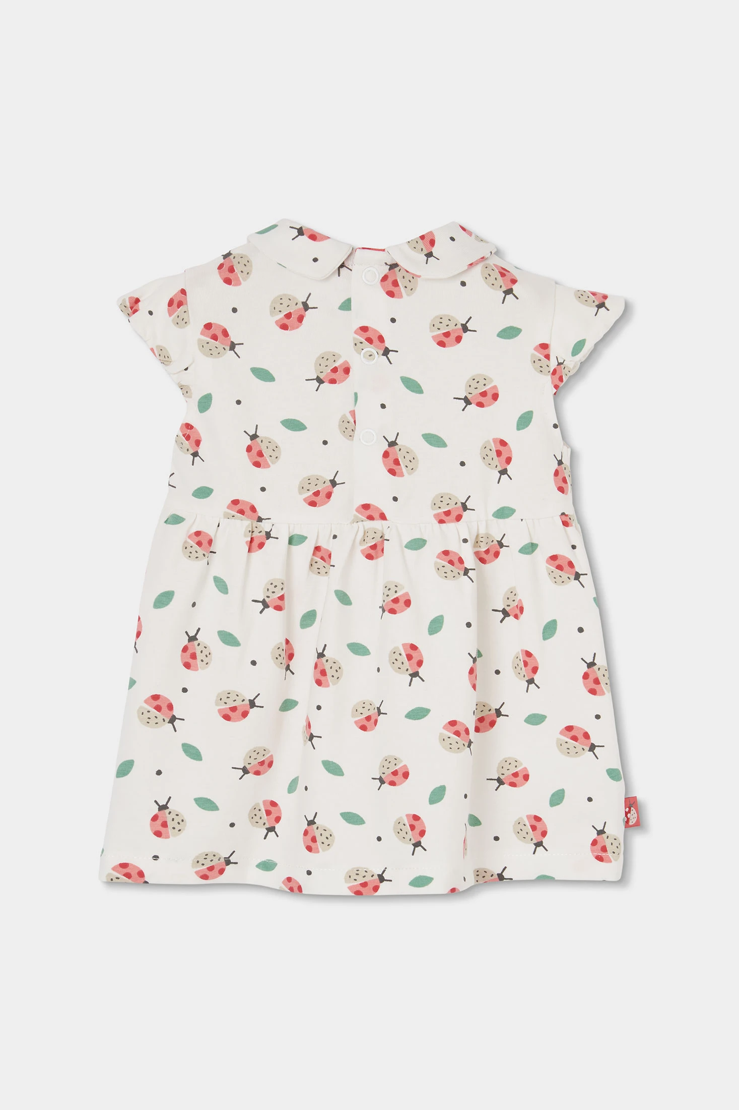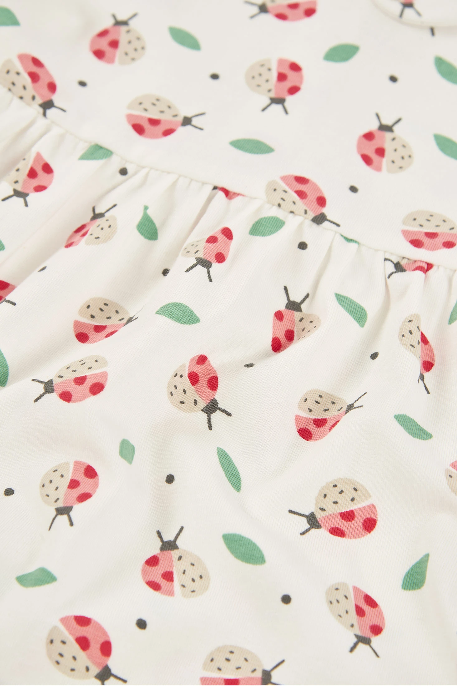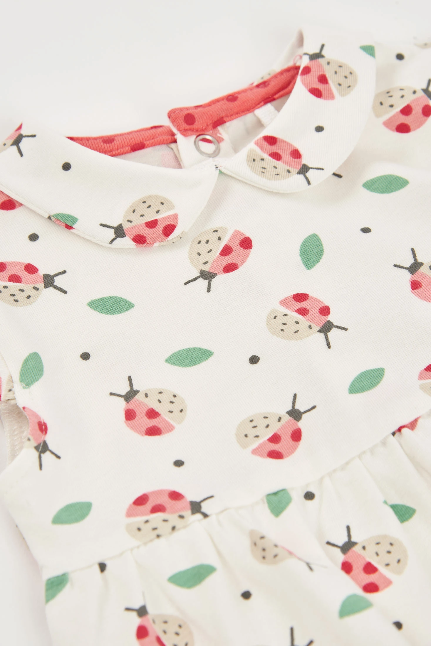 Printed stretch cotton dress with knickers, for baby girl, ideal for the first months of life. With a white background and ladybird and leaf print, it offers a cheerful touch. Featuring a round neck, back poppers that make changing easy, and short sleeves, it is perfect for a fresh and comfortable look. Available in sizes from 1 month to 2 months, it's an adorable and practical option for any occasion, providing style and comfort.