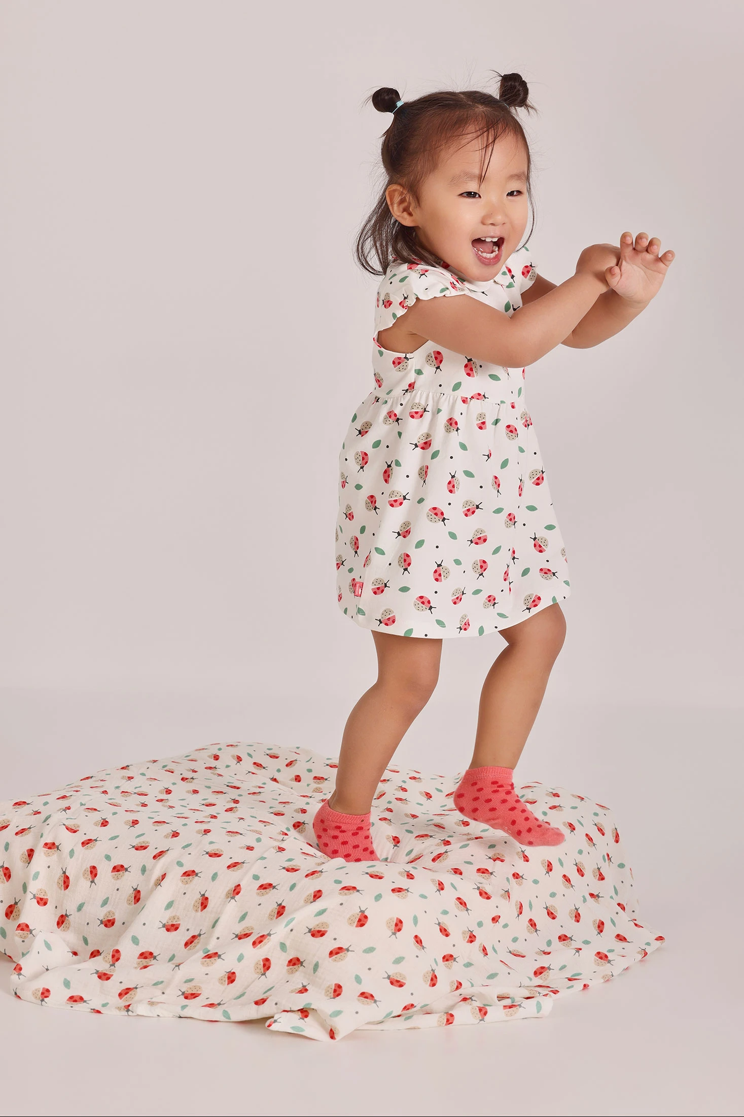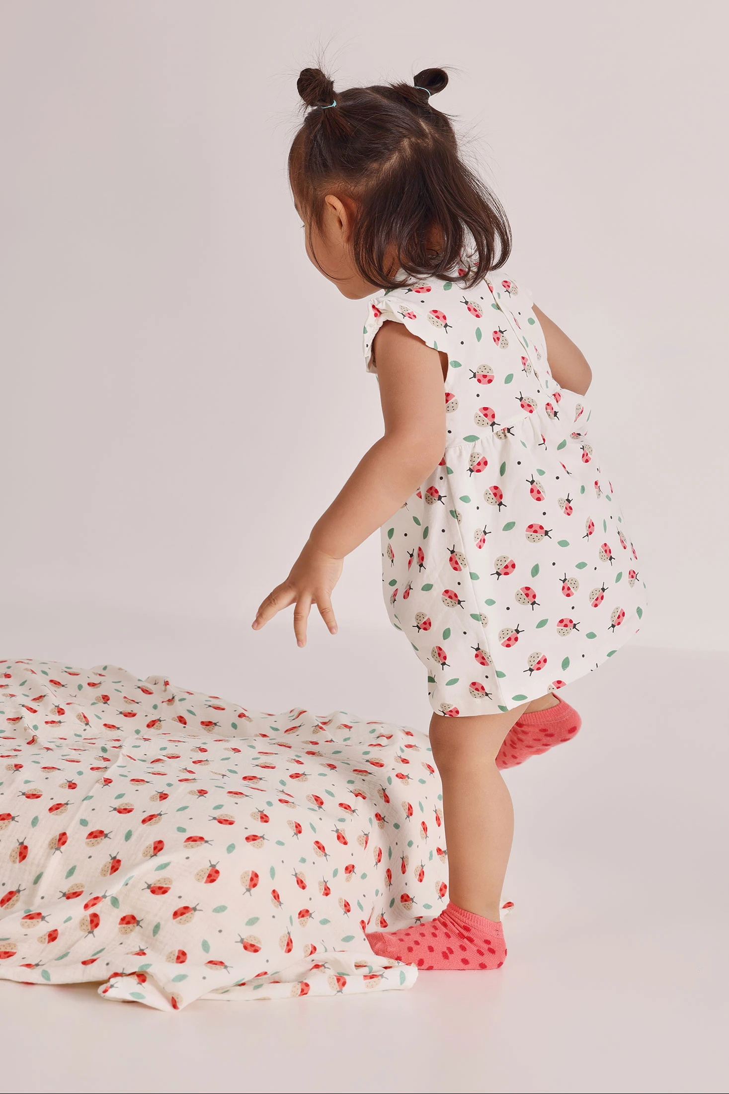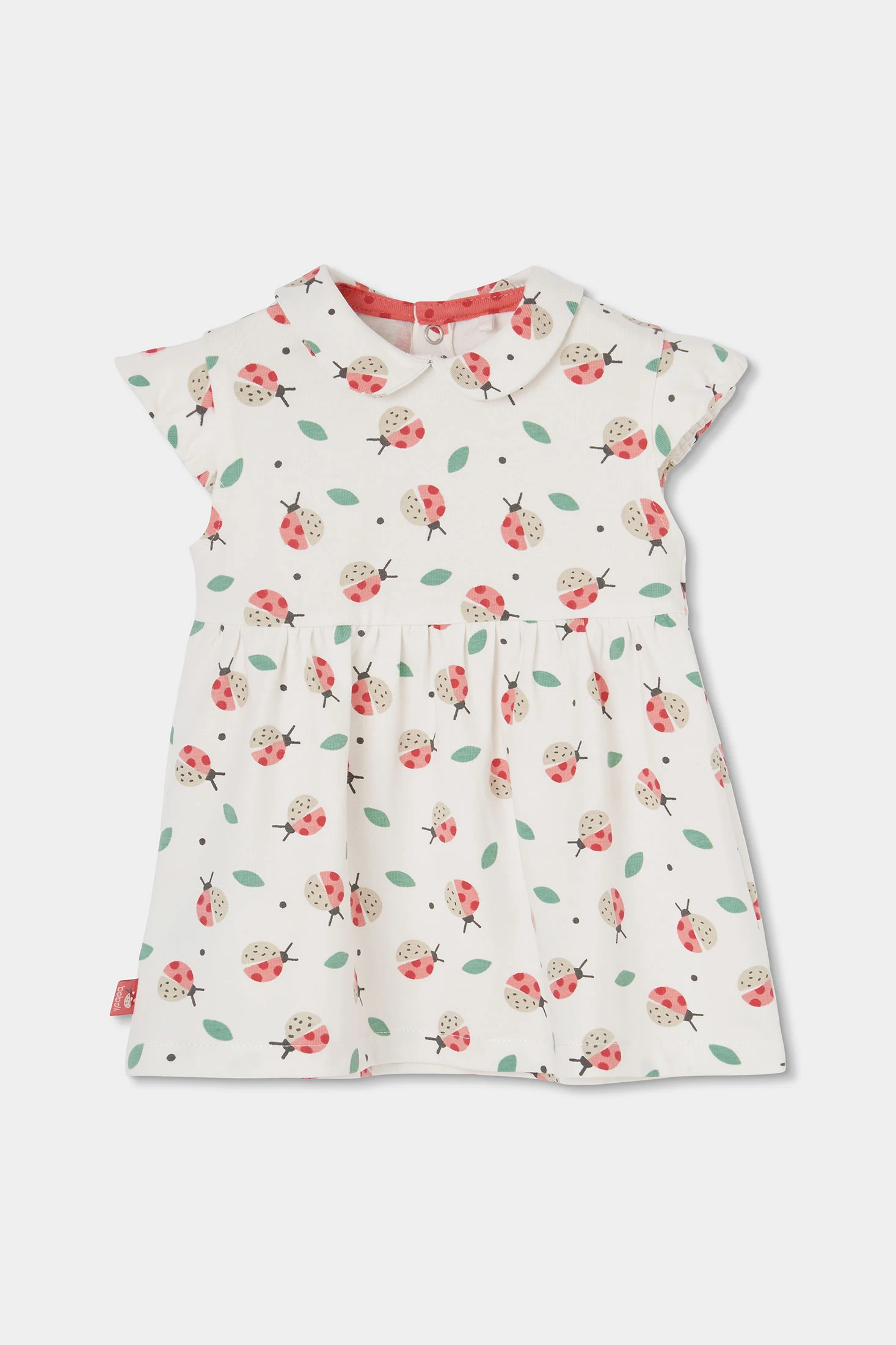 Printed stretch cotton dress with knickers, for baby girl, ideal for the first months of life. With a white background and ladybird and leaf print, it offers a cheerful touch. Featuring a round neck, back poppers that make changing easy, and short sleeves, it is perfect for a fresh and comfortable look. Available in sizes from 1 month to 2 months, it's an adorable and practical option for any occasion, providing style and comfort.