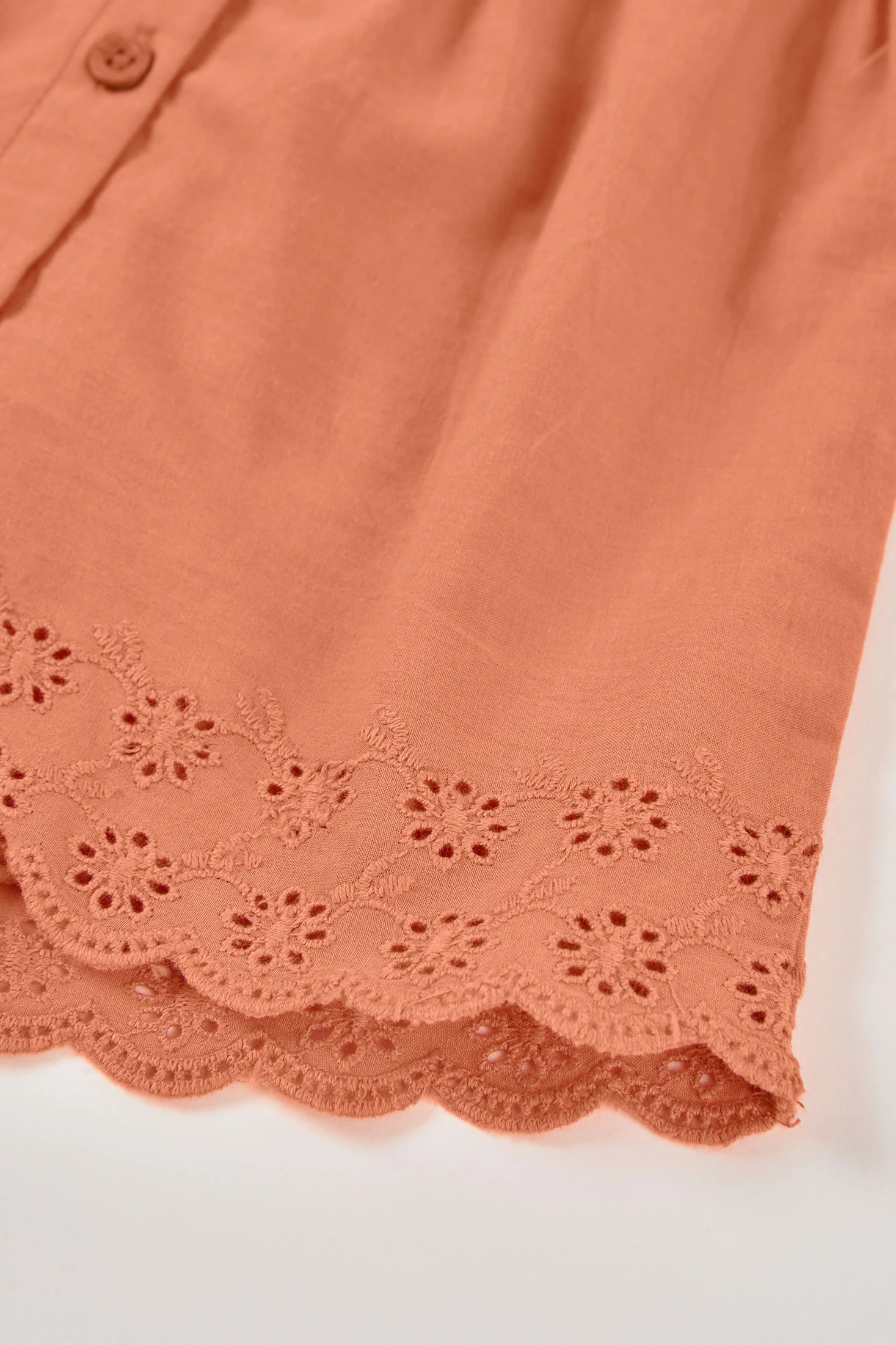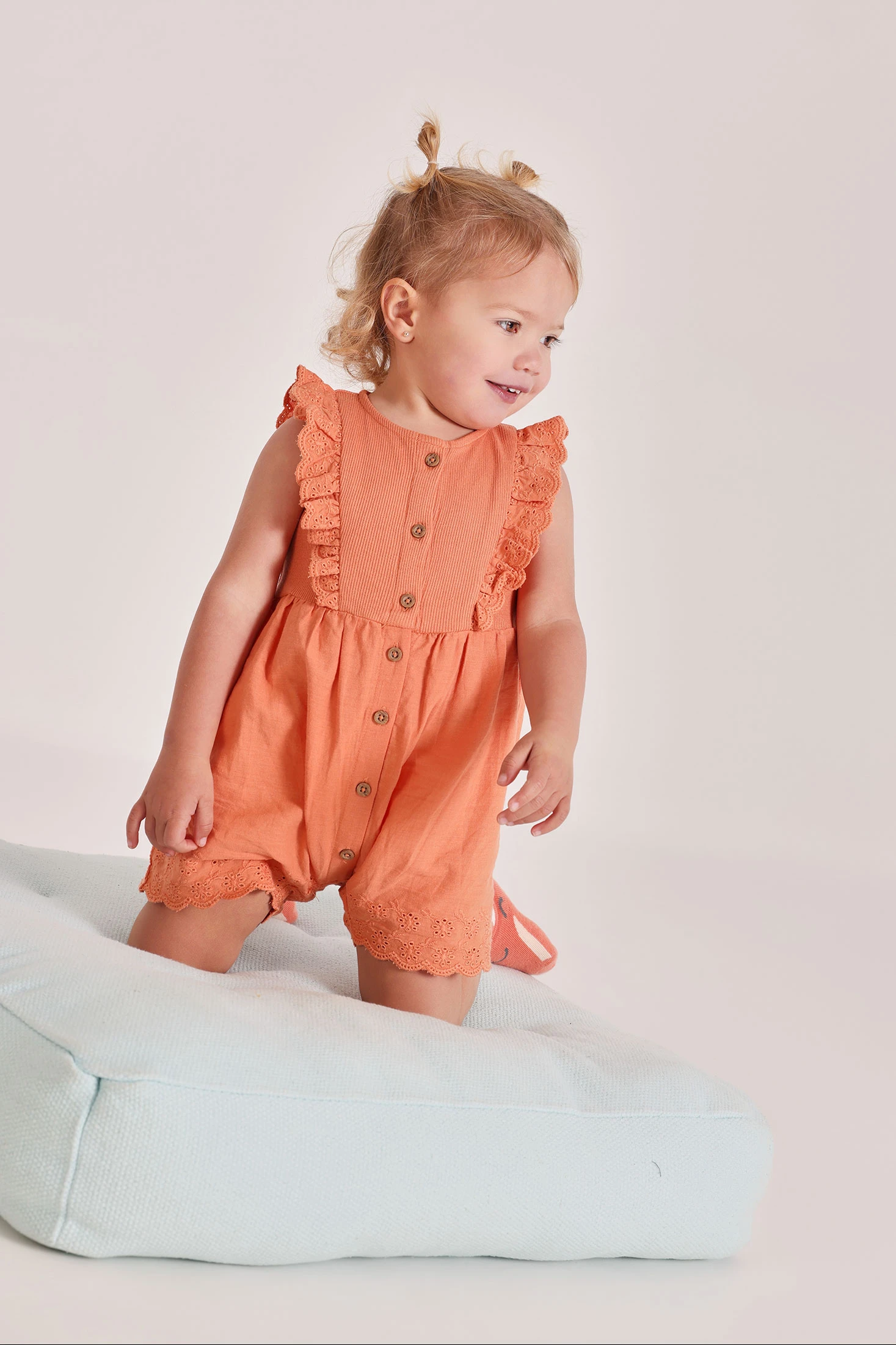 Embroidered jumpsuit that combines two fabrics in orange, perfect for newborns, available in sizes from 1 month to 24 months. Its design includes delicate embroidery on the ruffles and the lower edge, providing an elegant style. The fabric is soft and comfortable, ideal for babies' sensitive skin. The front buttons make changing clothes easy. Its warm colour and detailed design make it a sweet and practical choice for any occasion.