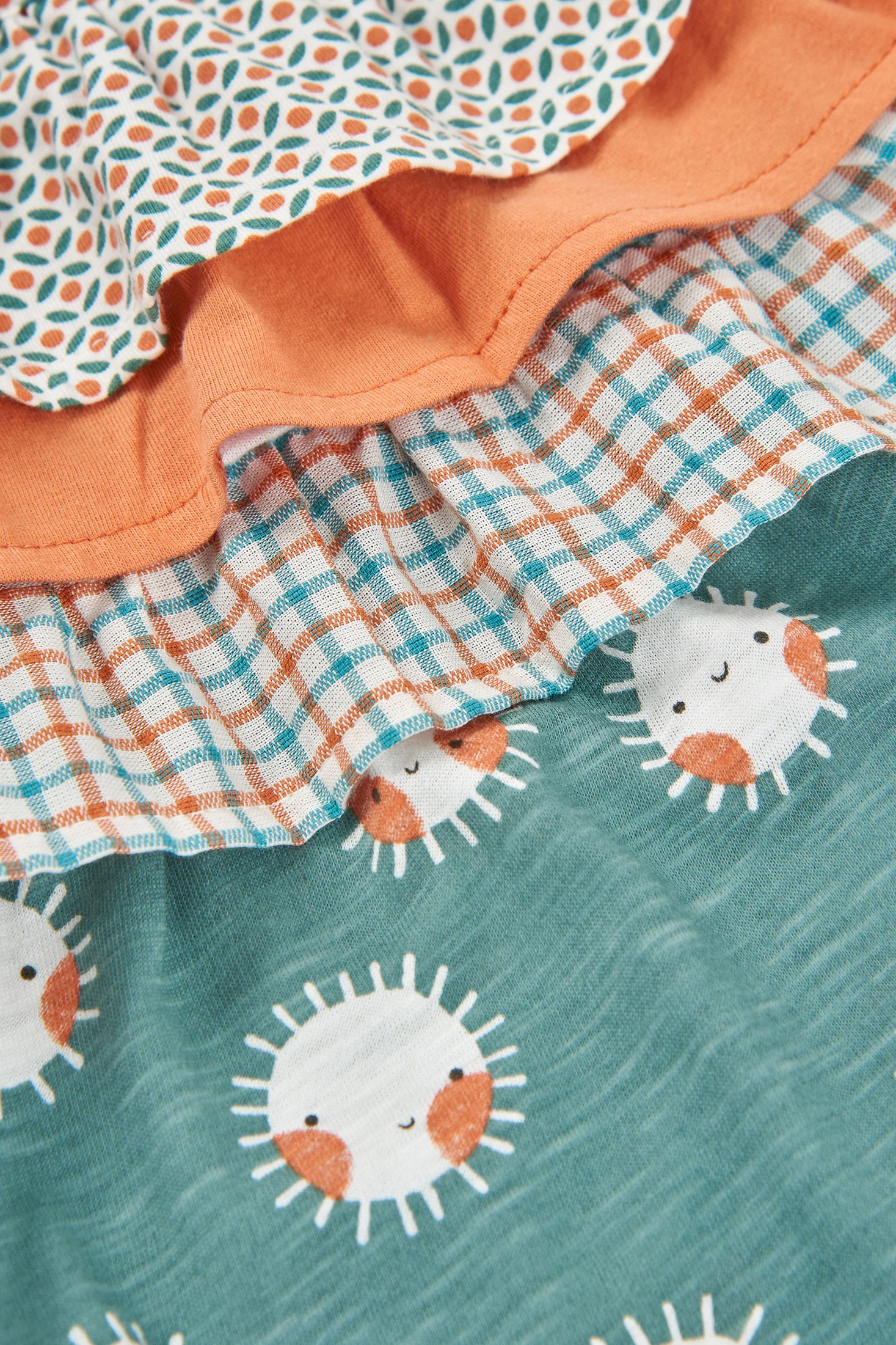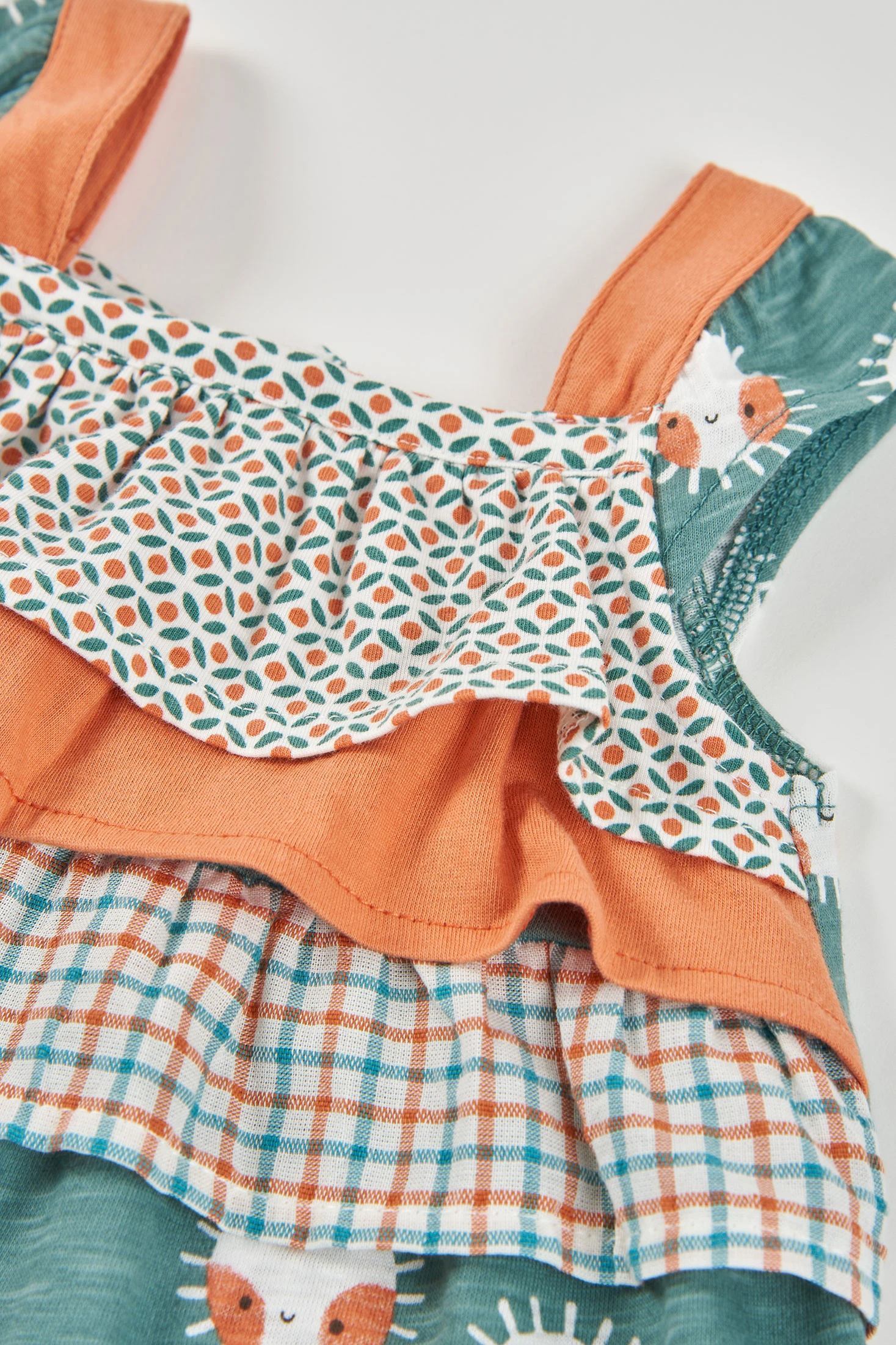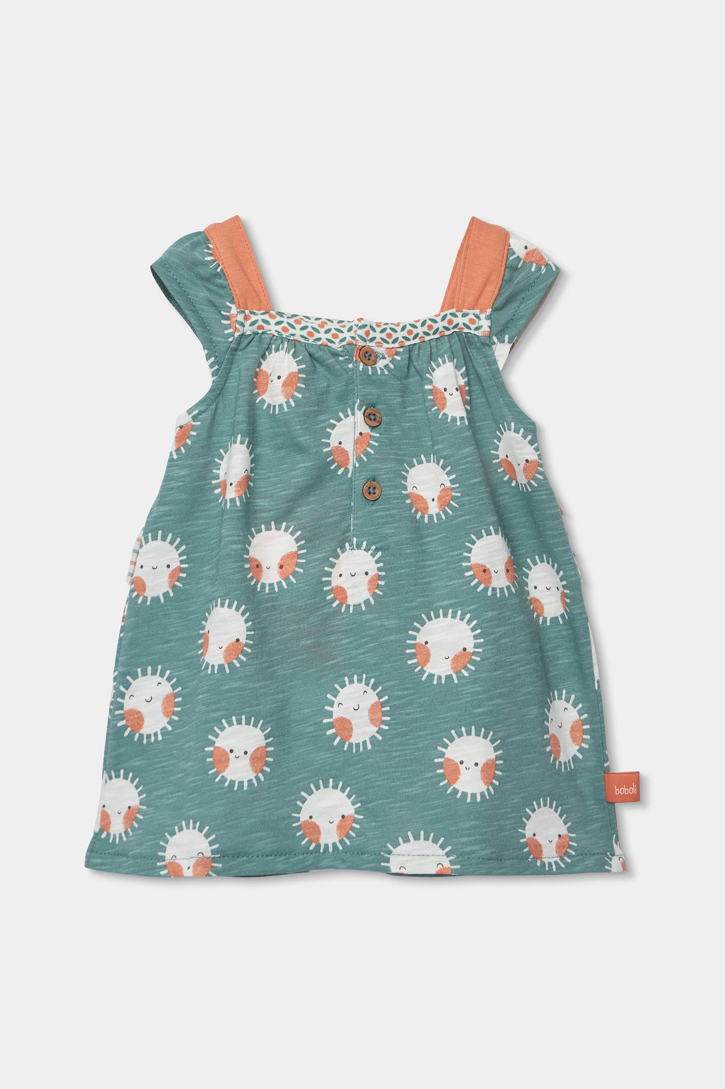 Dress made from a combination of different fabrics with straps and matching briefs for baby girls, perfect for the little ones, available in sizes from 1 month to 24 months. Its knitted fabric offers softness and comfort, with button closure at the back. It features a delightful design, combining sun prints on an aqua green background, checks, and geometric patterns. This versatile garment is suitable for any occasion, keeping your baby stylish while providing freedom of movement and warmth.