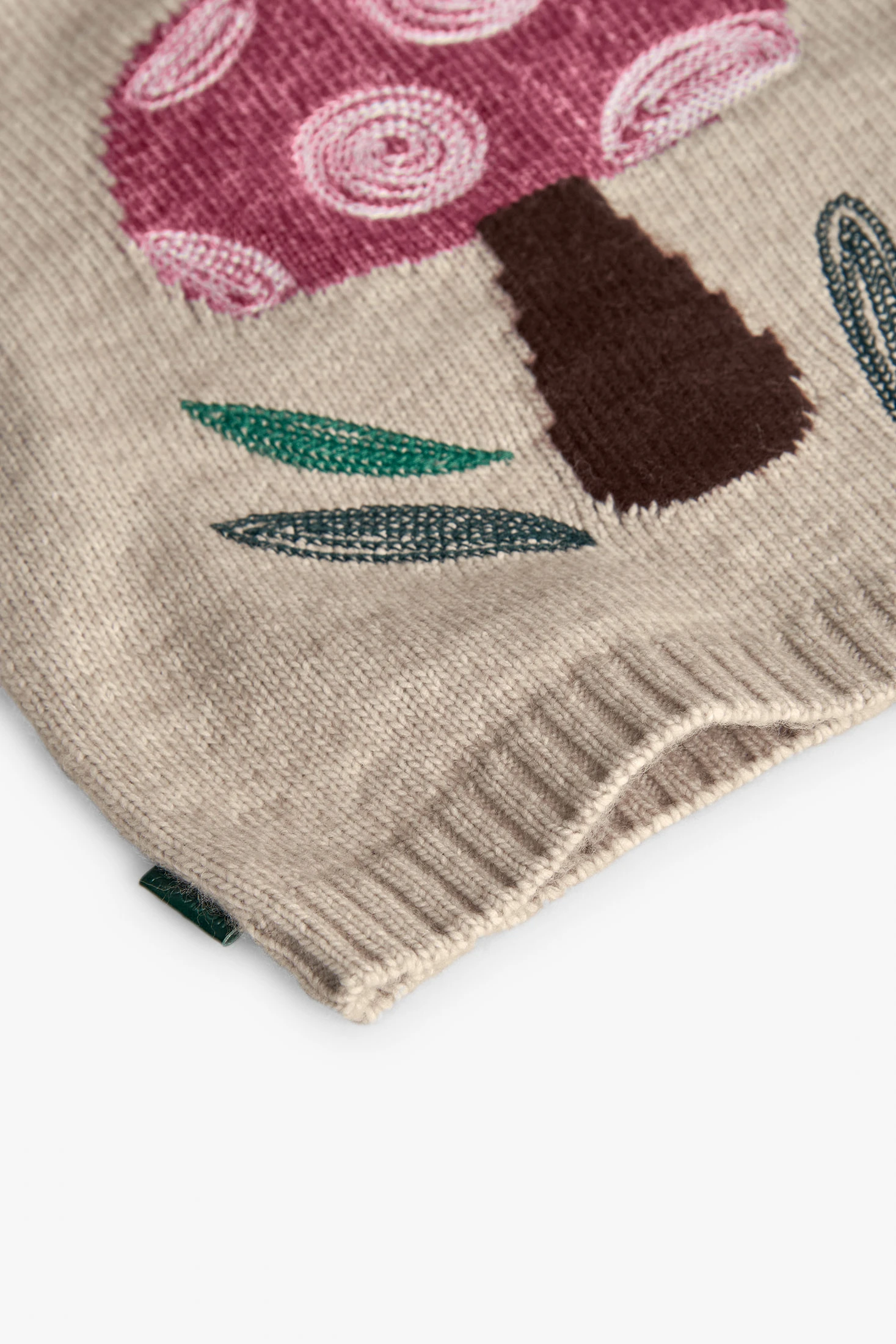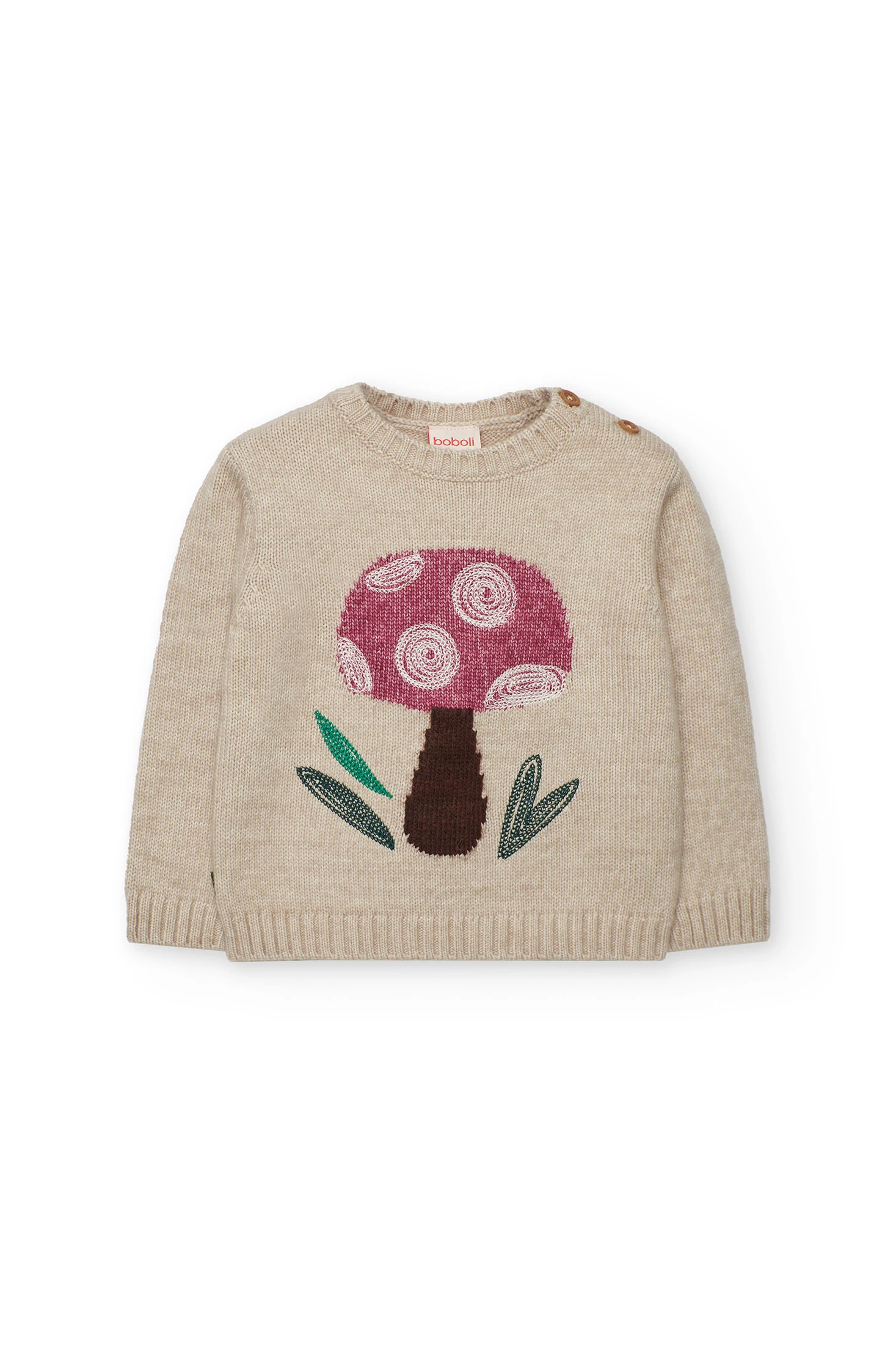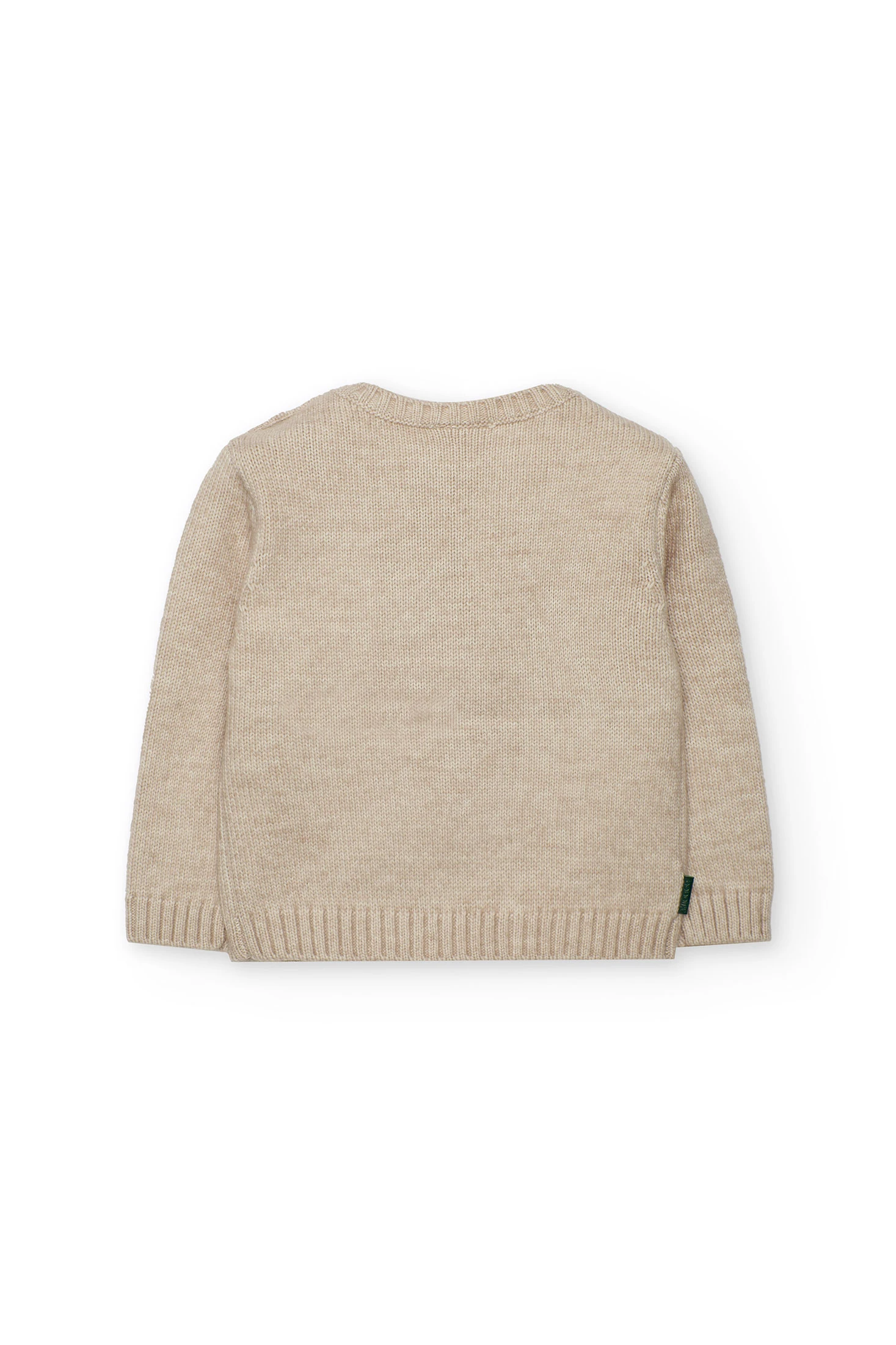 Knitted jumper in mottled beige for girls, ideal for the autumn and winter season. Made from a soft fabric that provides warmth and comfort, it's perfect for colder days. Its design includes a round neckline and long sleeves, ensuring a comfortable and cosy fit. The beige colour makes it easy to pair with skirts, trousers, and leggings. Available in sizes from 12 months to 10 years, this garment is essential for adding a touch of elegance and sweetness to children's wardrobe.