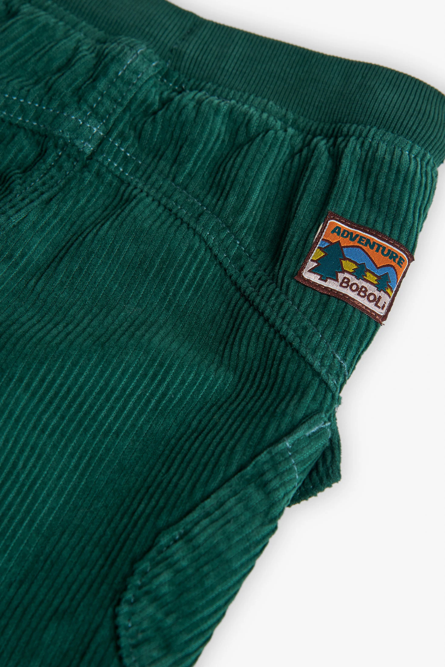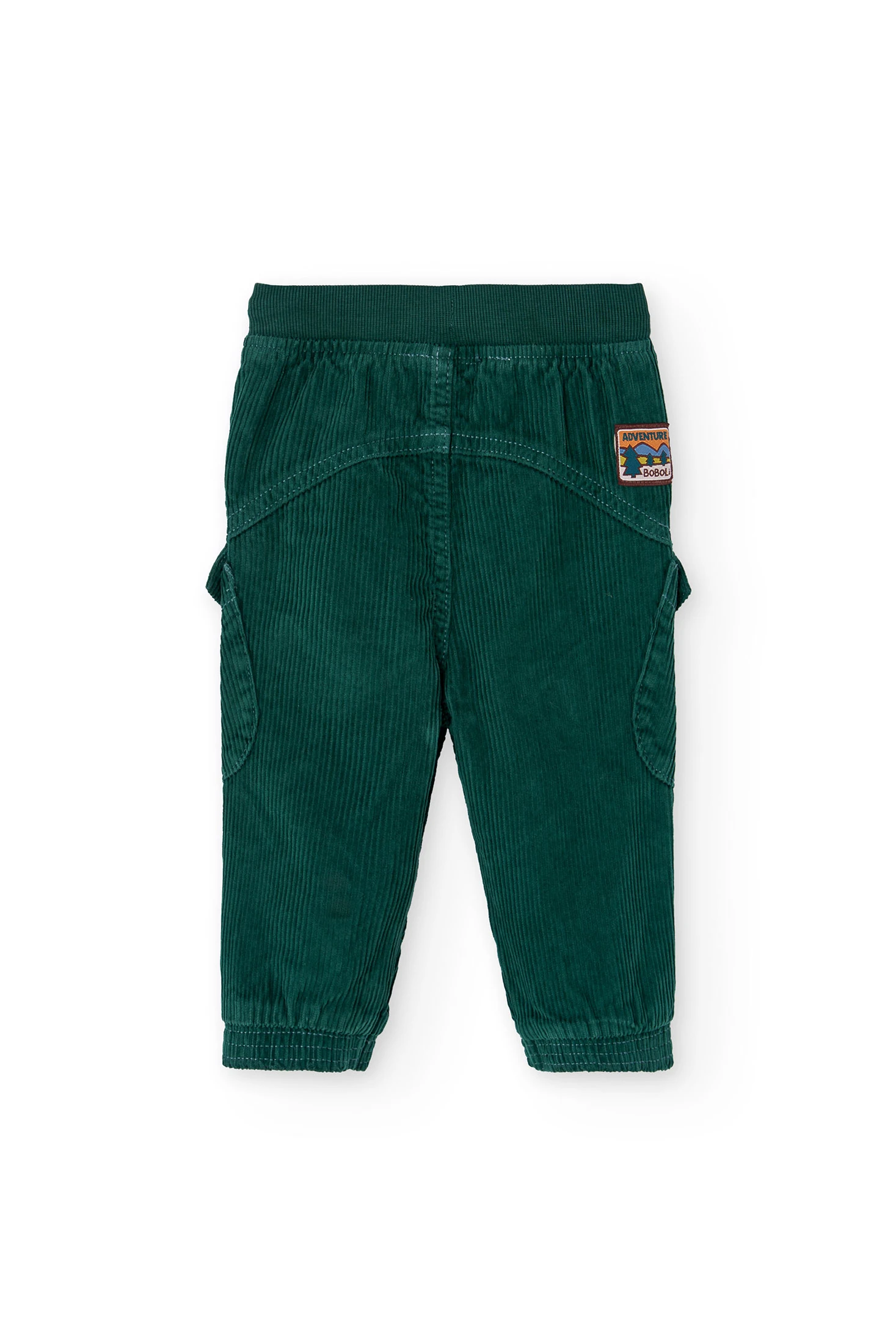 Green corduroy trousers for boys, ideal for the autumn and winter seasons thanks to their soft cotton construction that provides warmth and comfort. In a vibrant green colour, these trousers offer a modern and versatile style, working well in outfits with T-shirts, jumpers, or jackets. The adjustable elastic waistband ensures a precise and comfortable fit, allowing freedom of movement. Practical side pockets make it a functional and sophisticated choice for little ones. Available in sizes from 12 months to 10 years, it is an essential piece in any children's wardrobe.