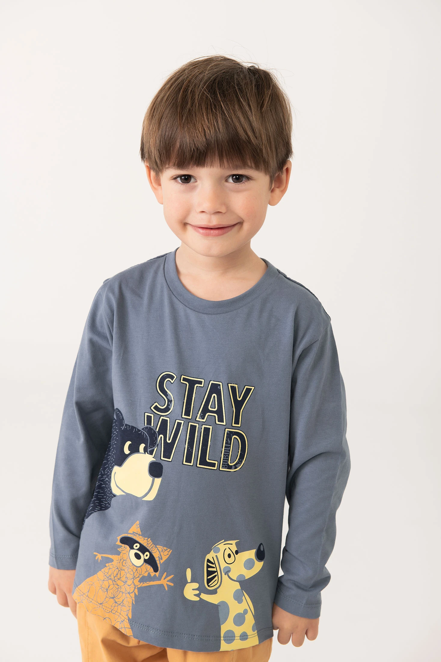 Cotton T-shirt for boys, ideal for the autumn and winter seasons, providing comfort and warmth with its soft fabric. Its animal print and the phrase "STAY WILD" on the chest add a touch of fun and adventure. The dark blue colour is versatile, allowing for easy pairing with different outfits. Available in sizes from 12 months to 8 years, it is perfect for everyday wear. Its round neck design makes it easy to put on and ensures the little ones are always in style.