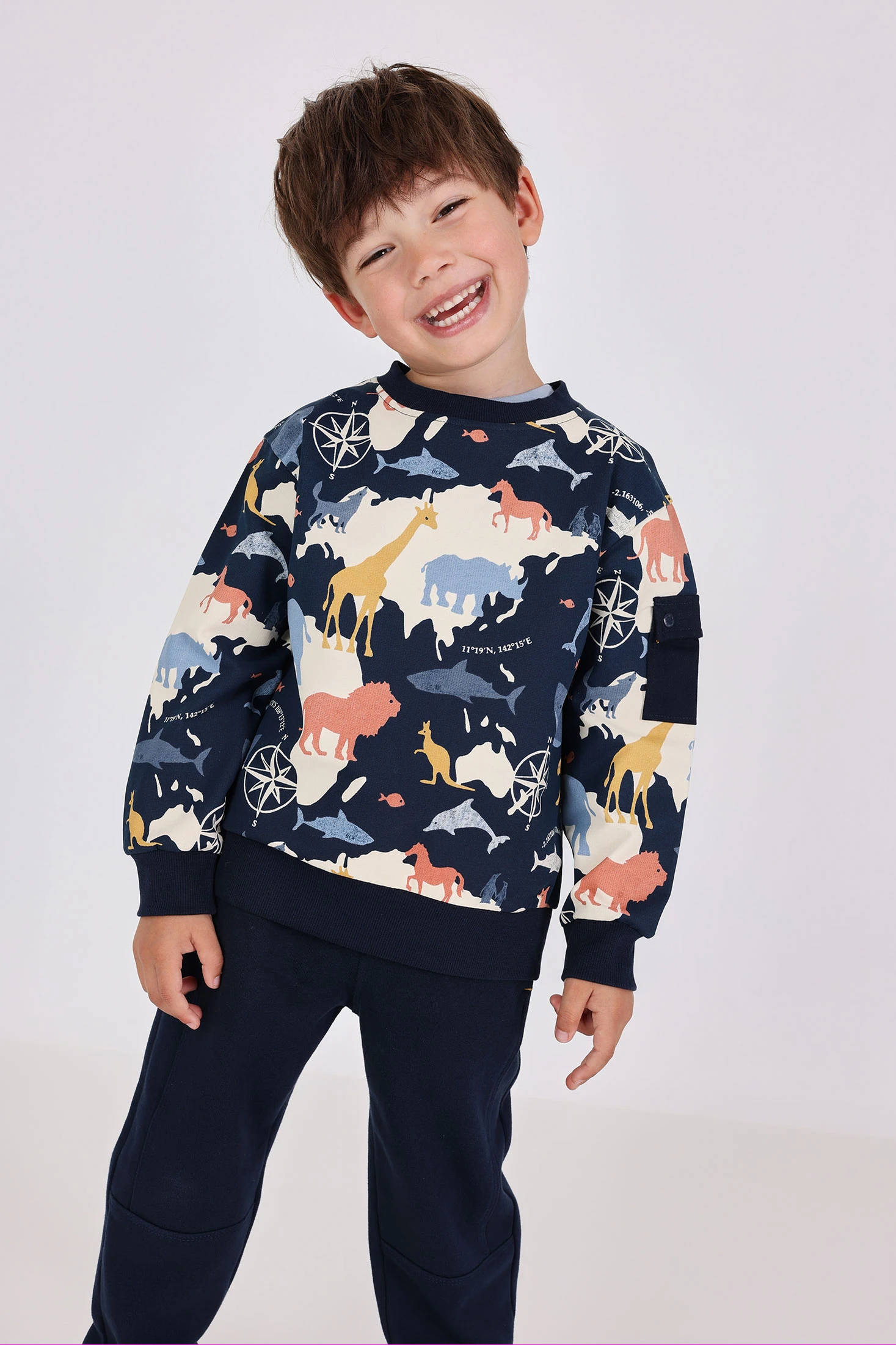 Navy blue fleece sweatshirt for boys, ideal for keeping little ones warm and comfortable during the colder seasons. Made from soft cotton, it is suitable for children aged 12 months to 10 years. It features a charming animal print in shades of blue, mustard and terracotta on a navy blue background. The design includes a round neckline, long sleeves and practical snap buttons on the shoulder for easy changing.