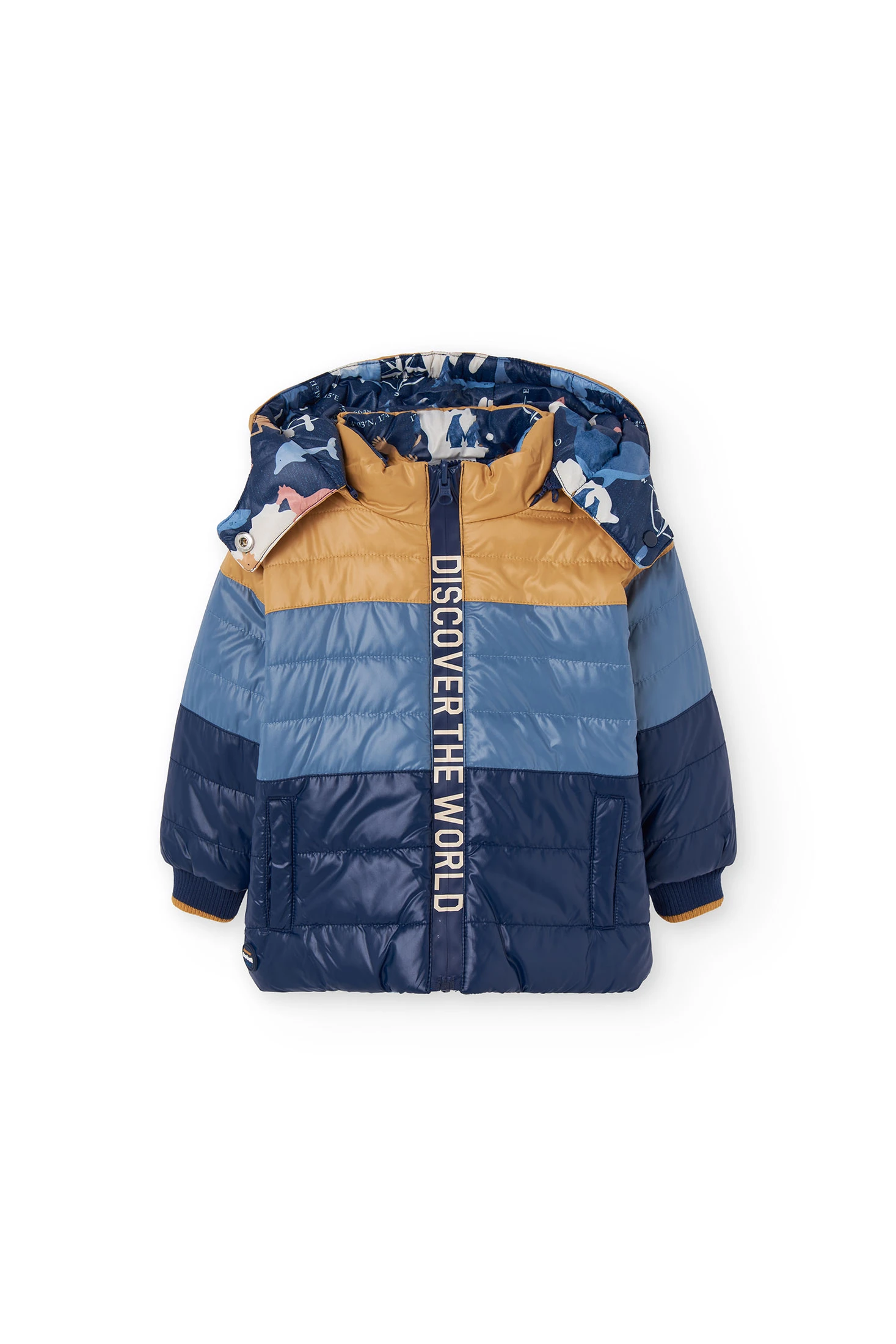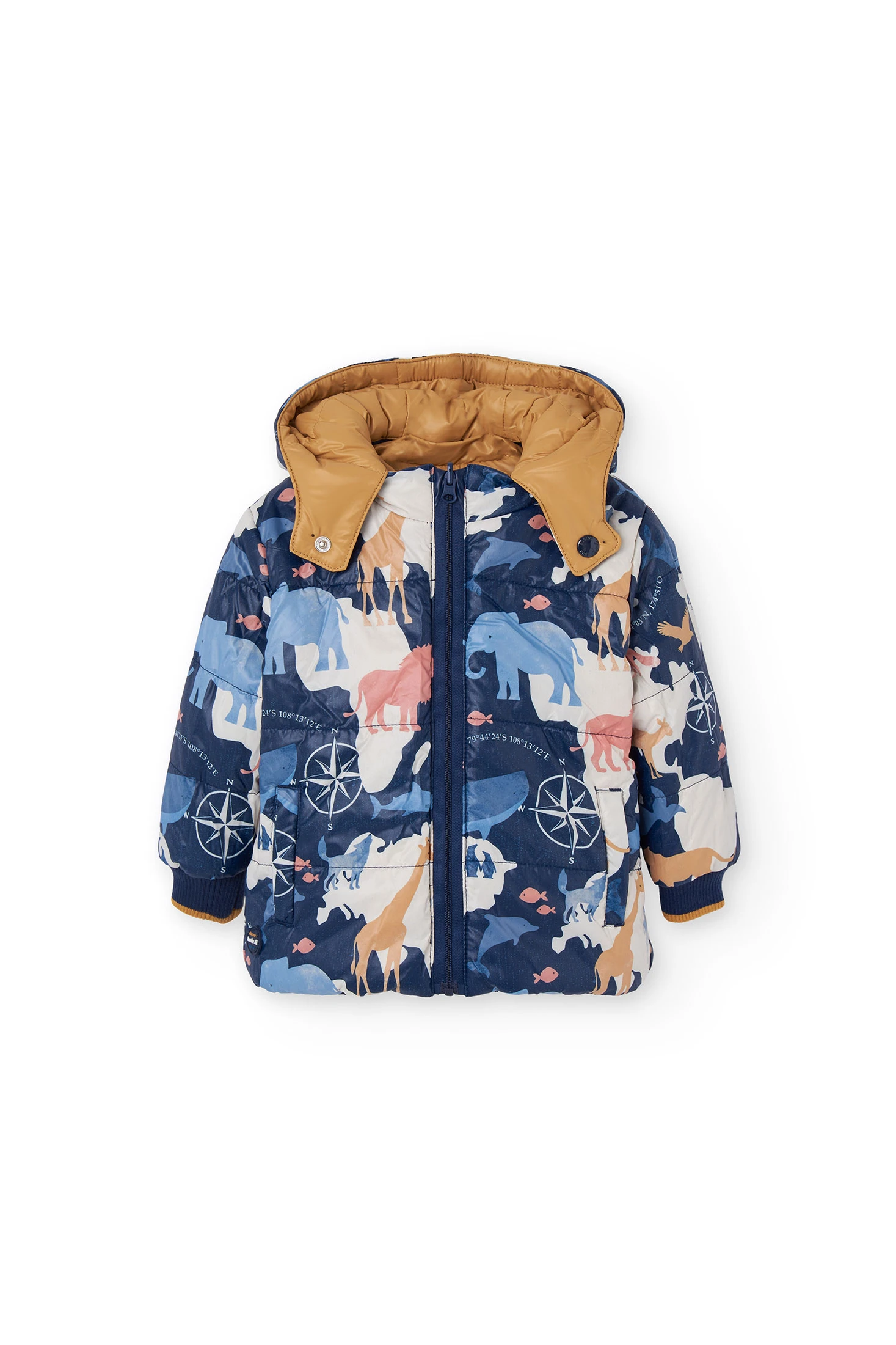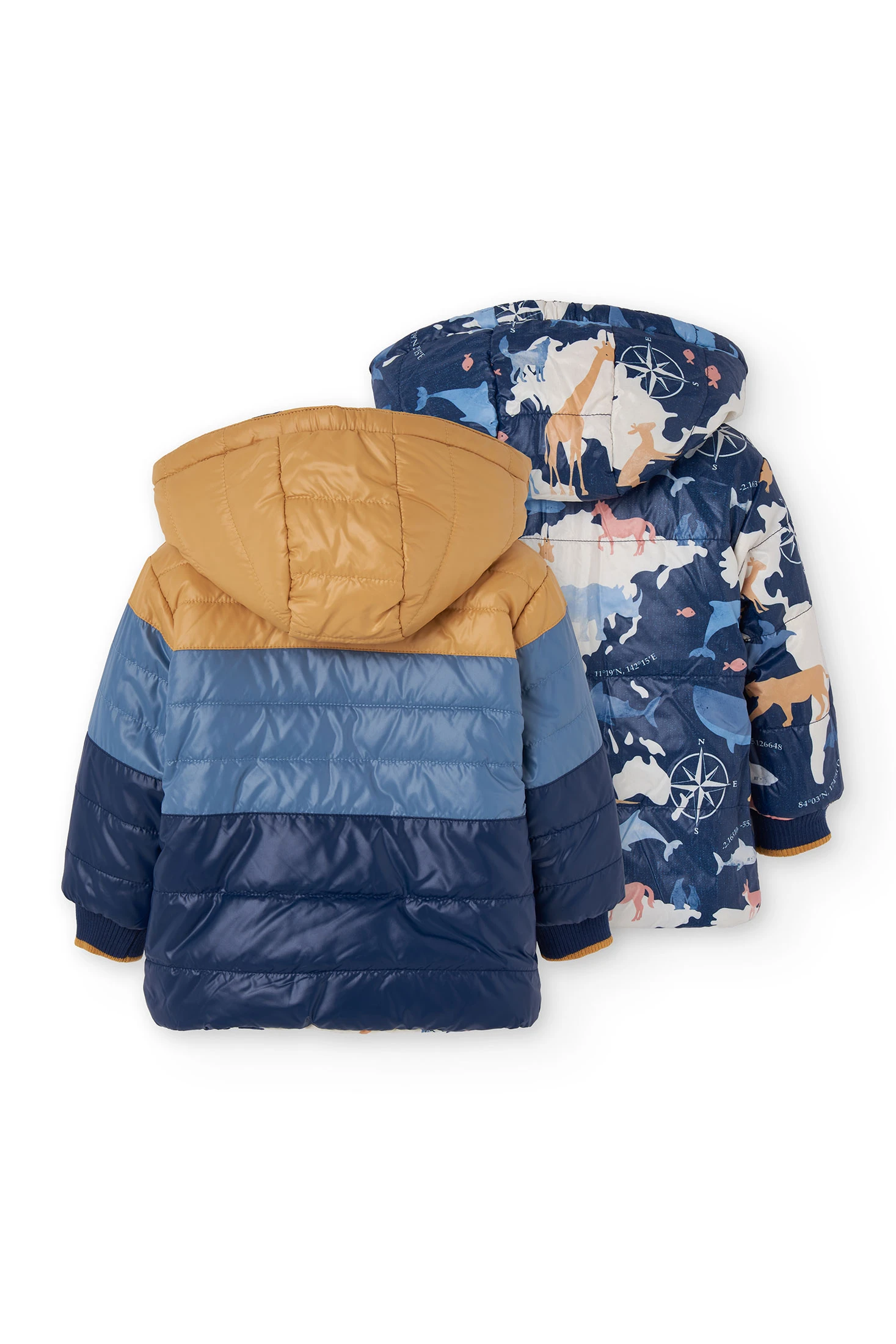 Reversible parka for boys in navy blue, perfect for autumn and winter, featuring an animal print on the inside that allows for an easy change of style. With a detachable hood and front zip, this garment provides protection and comfort against the cold. Made with weather-resistant materials, it ensures warmth on the chilliest days. Available in sizes from 12 months to 10 years, it is ideal for pairing with casual outfits, ensuring that little ones stay warm and stylish while playing outdoors.