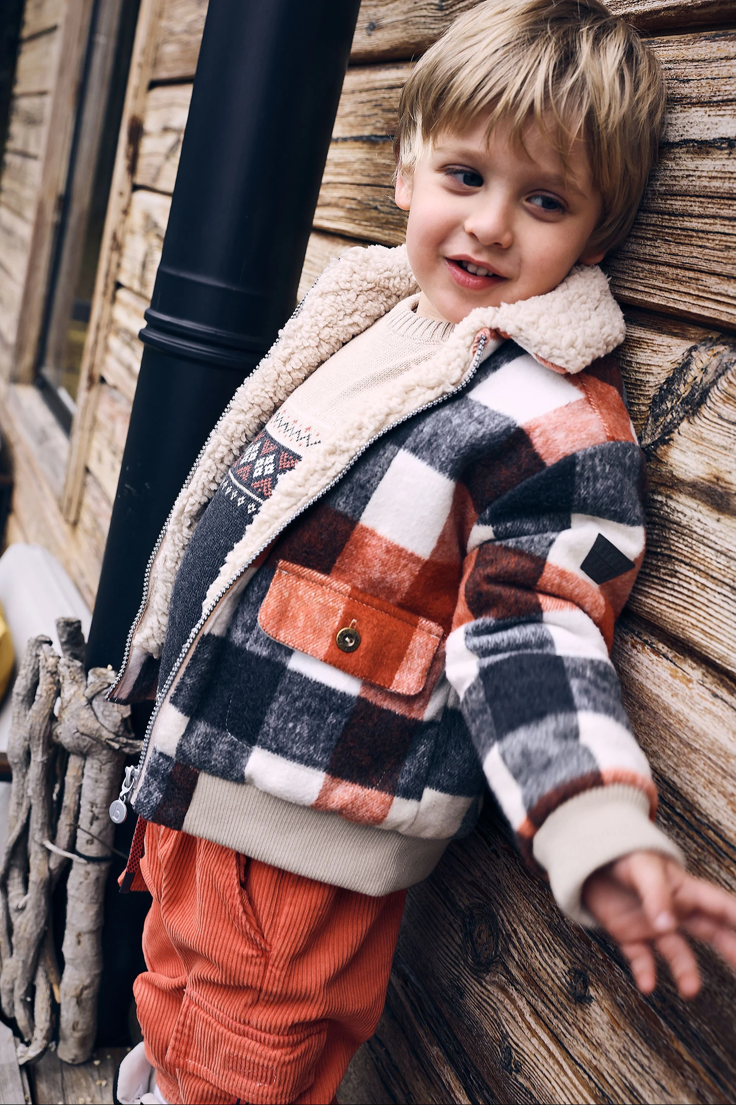 Knitted jacket for boys with a checkered design, ideal for the autumn and winter months. Crafted from warm and soft materials, it features a classic pattern in shades of brown, black, and white that ensures style and comfort. The shearling collar adds a cosy and sophisticated touch, while the zip closure makes it easy to wear. Designed with long sleeves, it effectively protects against the cold. Available in sizes from 12 months to 10 years, this jacket is a versatile garment that pairs easily with jeans or casual trousers.