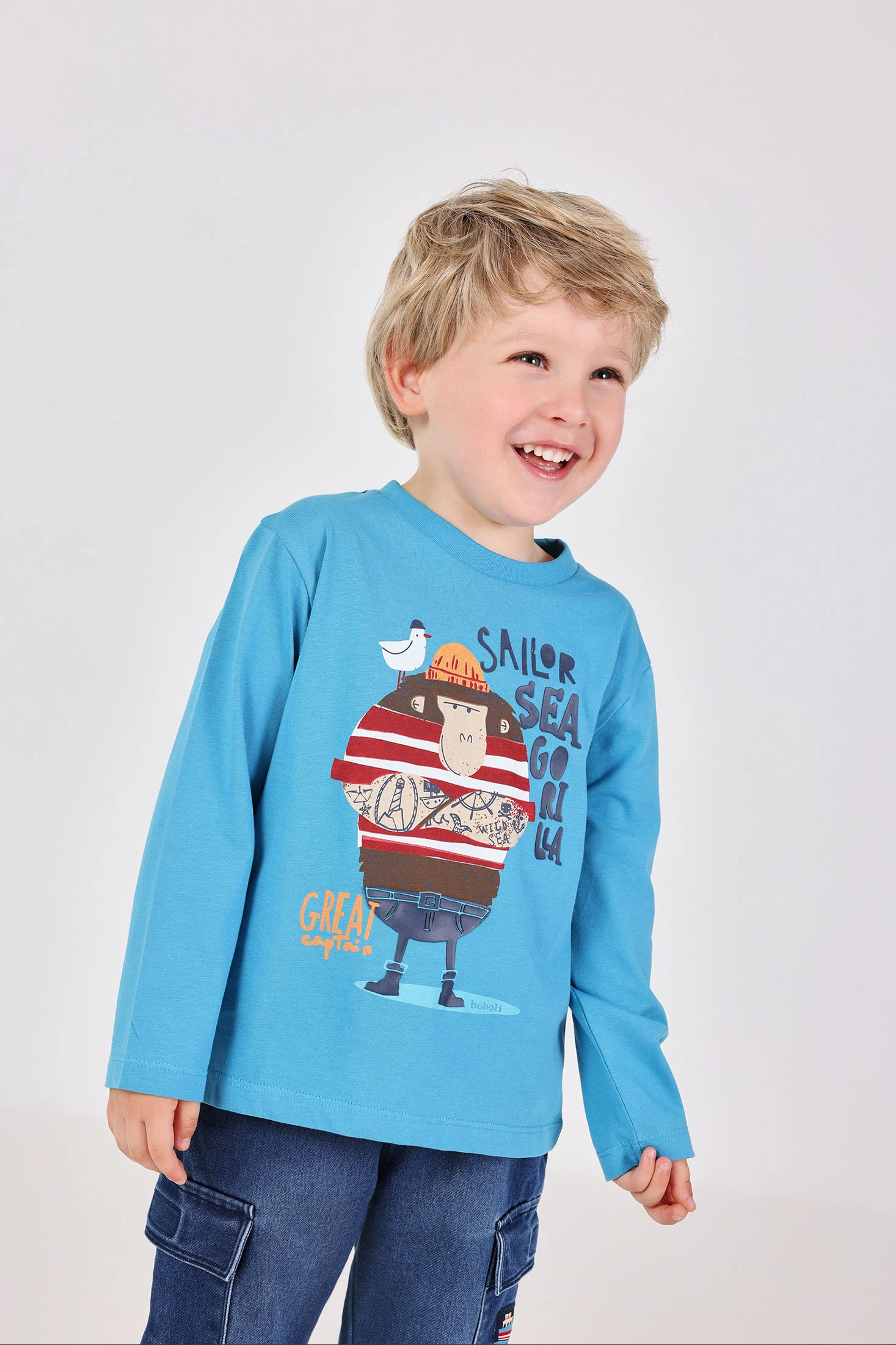 Blue knit T-shirt for boy with sailor gorilla