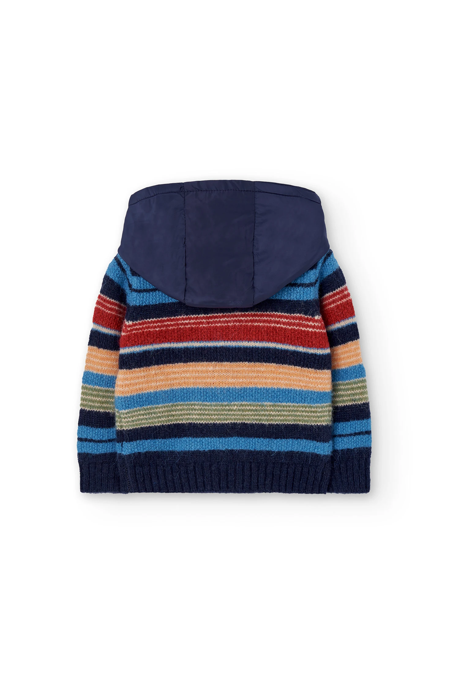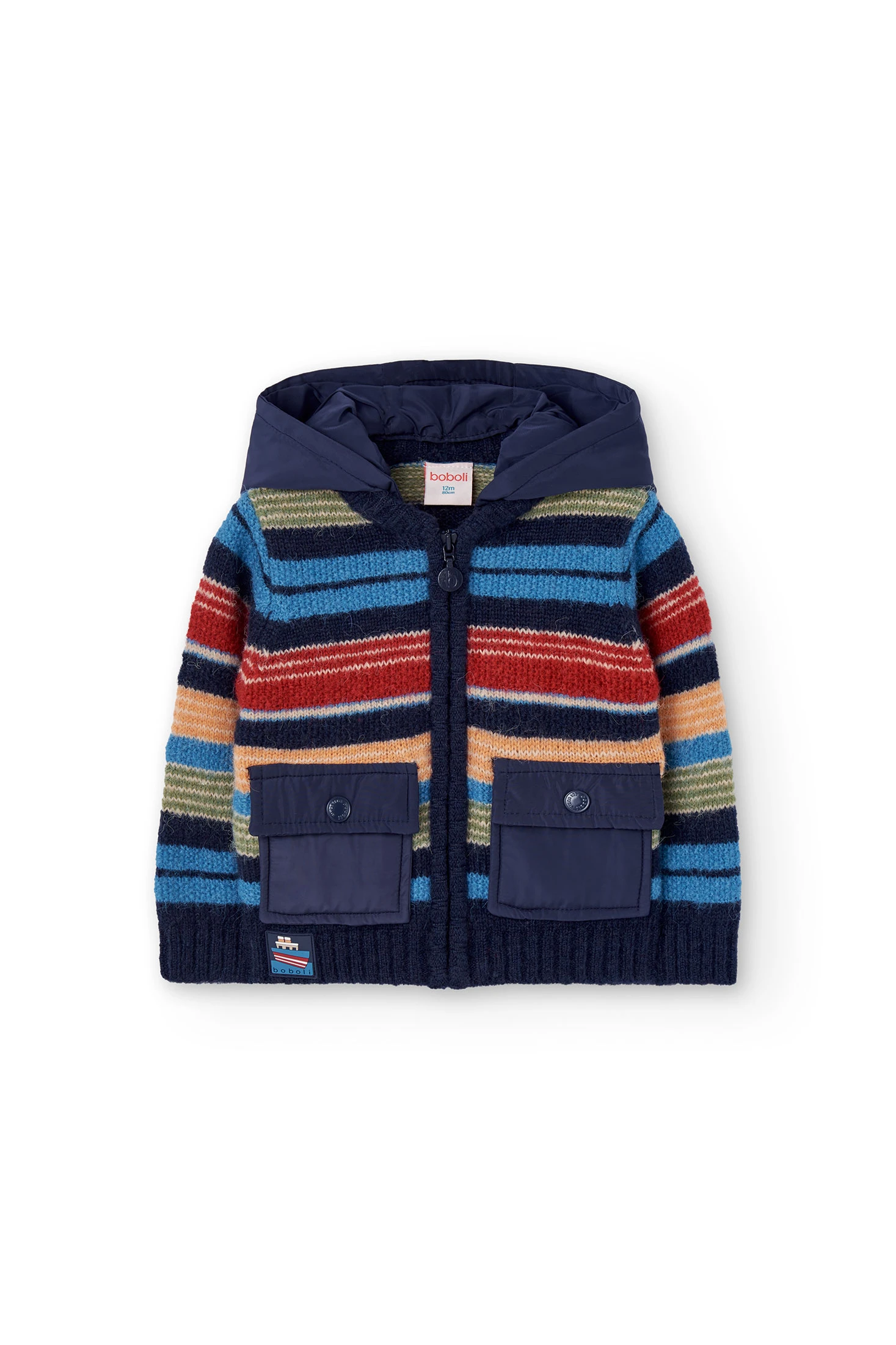 Knitted jacket for boys in blue with a charming horizontal stripe design, ideal for the autumn and winter seasons. Made from a soft knit fabric, it ensures comfort and warmth. Practical zip closure and hood offer extra protection against the cold. Available in sizes from 12 months to 10 years, this jacket is perfect for pairing with trousers and basic T-shirts, adding a touch of style and colour to the little one's wardrobe.