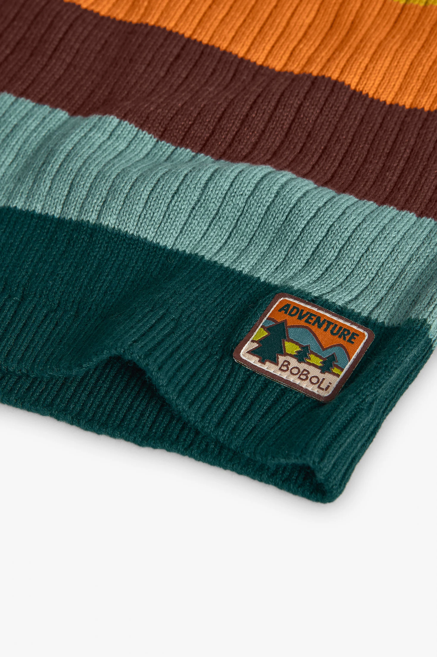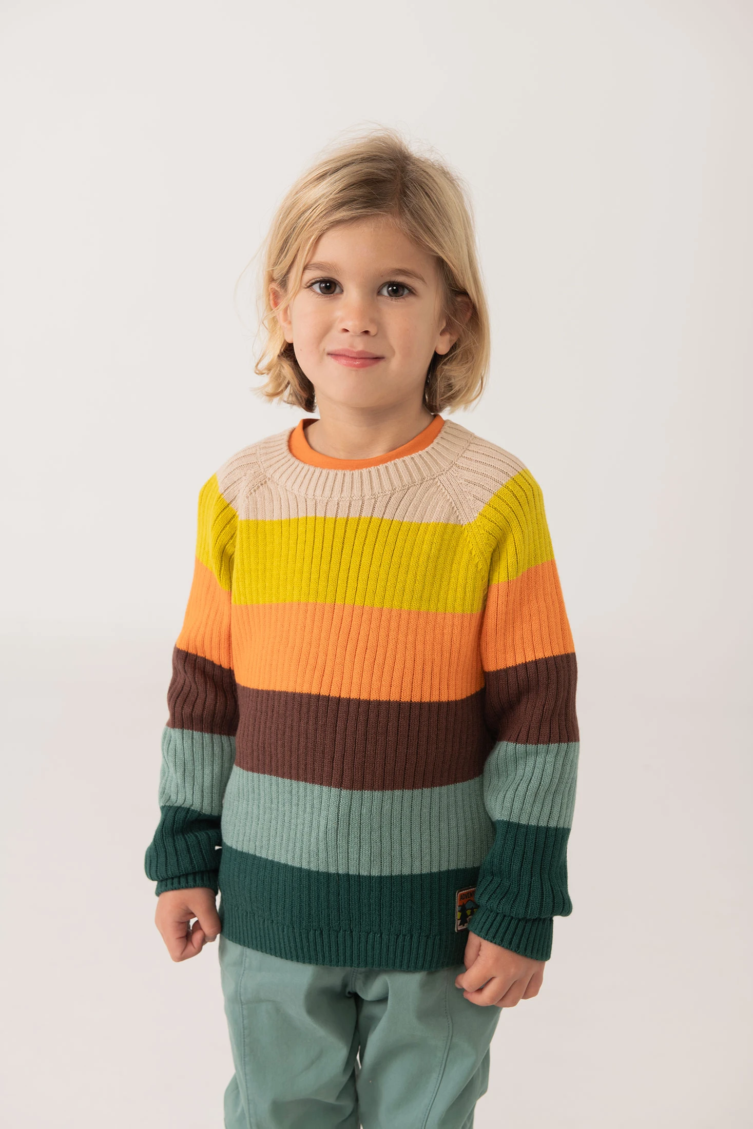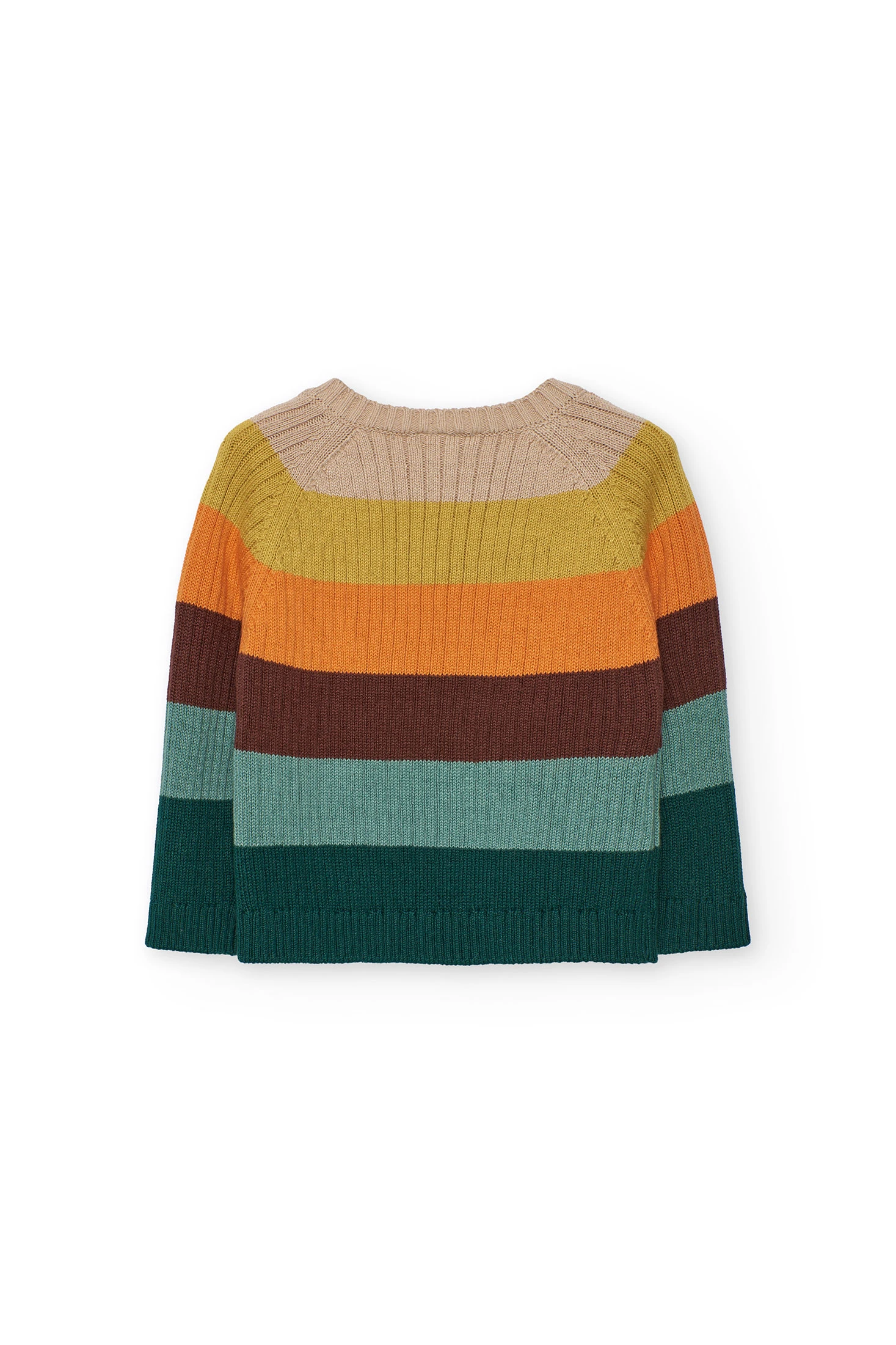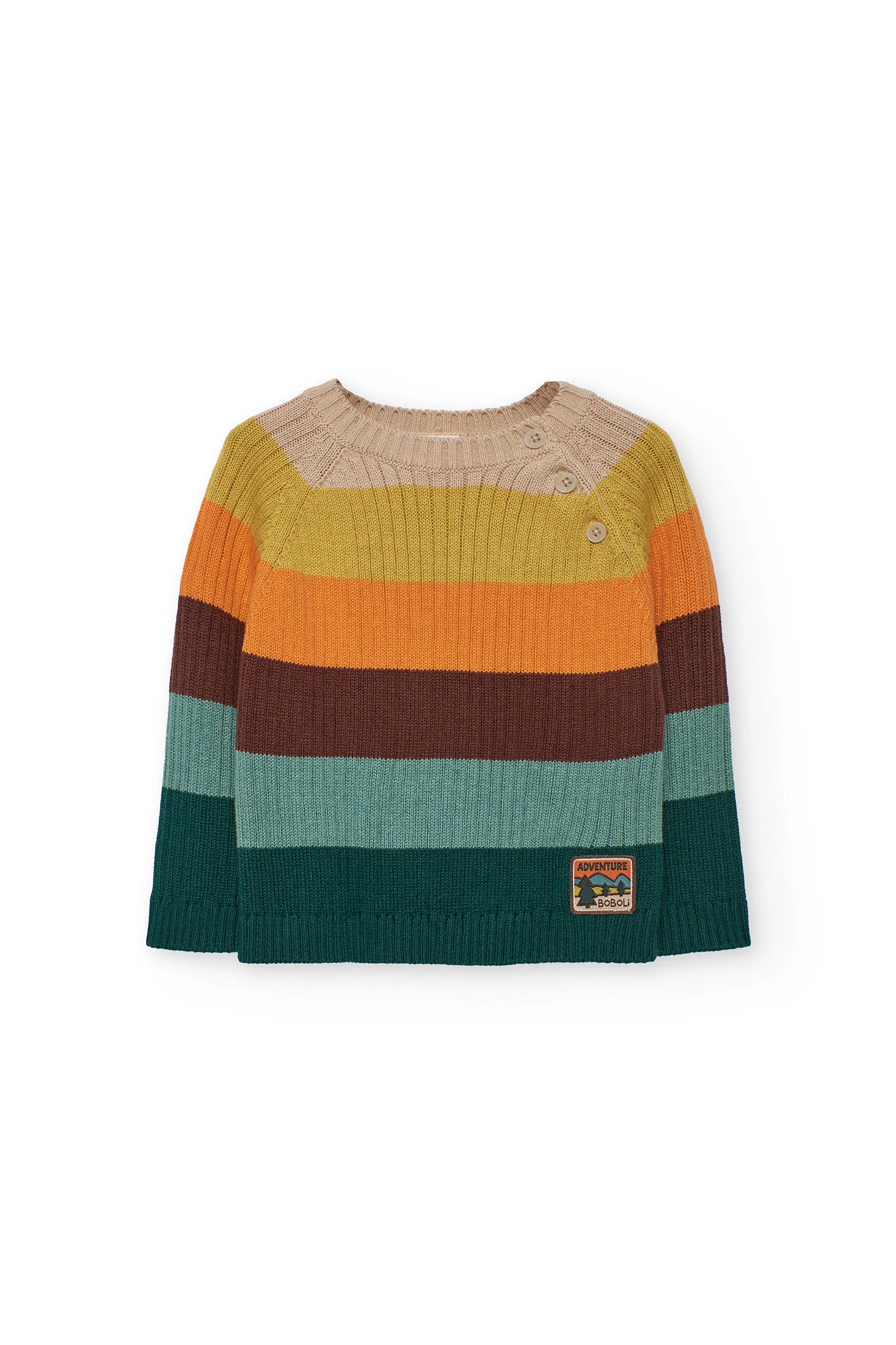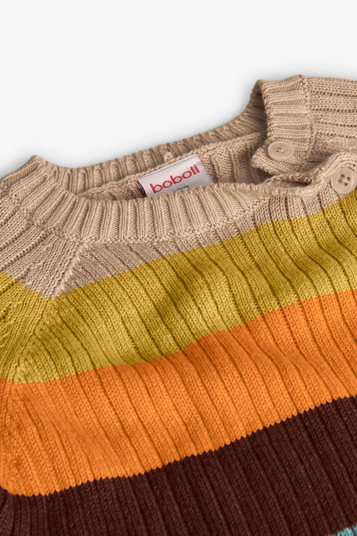 Knitted jumper for boys with stripes in beige tones, ideal for the autumn and winter seasons. Made from knitted fabric, it provides warmth and comfort, keeping little ones snug during cold days. Designed with a round neckline and practical buttons on the shoulder for easy dressing. Available in sizes from 12 months to 10 years, the jumper perfectly pairs with jeans or dark trousers to achieve a classic and elegant look.