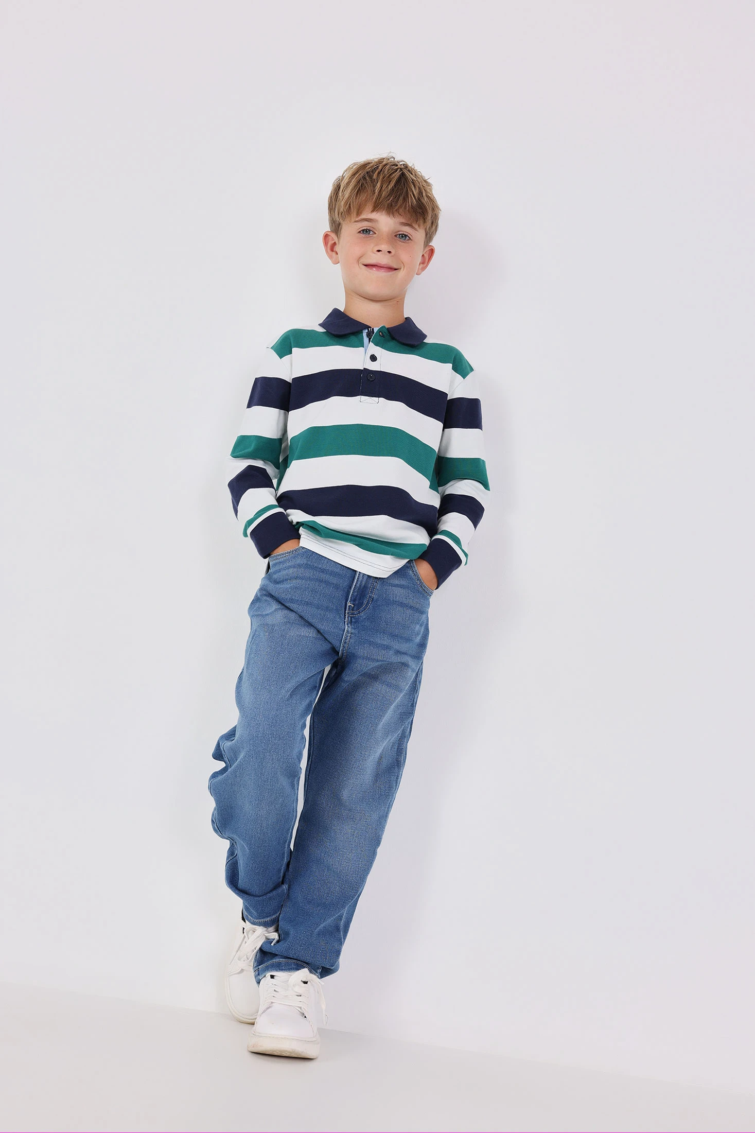 Blue denim trousers for boys, ideal for the transitional seasons, providing comfort and style. Made from soft cotton, they ensure a pleasant feel on the skin all day long. The modern design makes it easy to pair them with T-shirts and sweatshirts, suitable for various occasions. Available in sizes from 2 to 14 years, they are perfect for refreshing a child's wardrobe with a versatile and easy-to-coordinate piece.