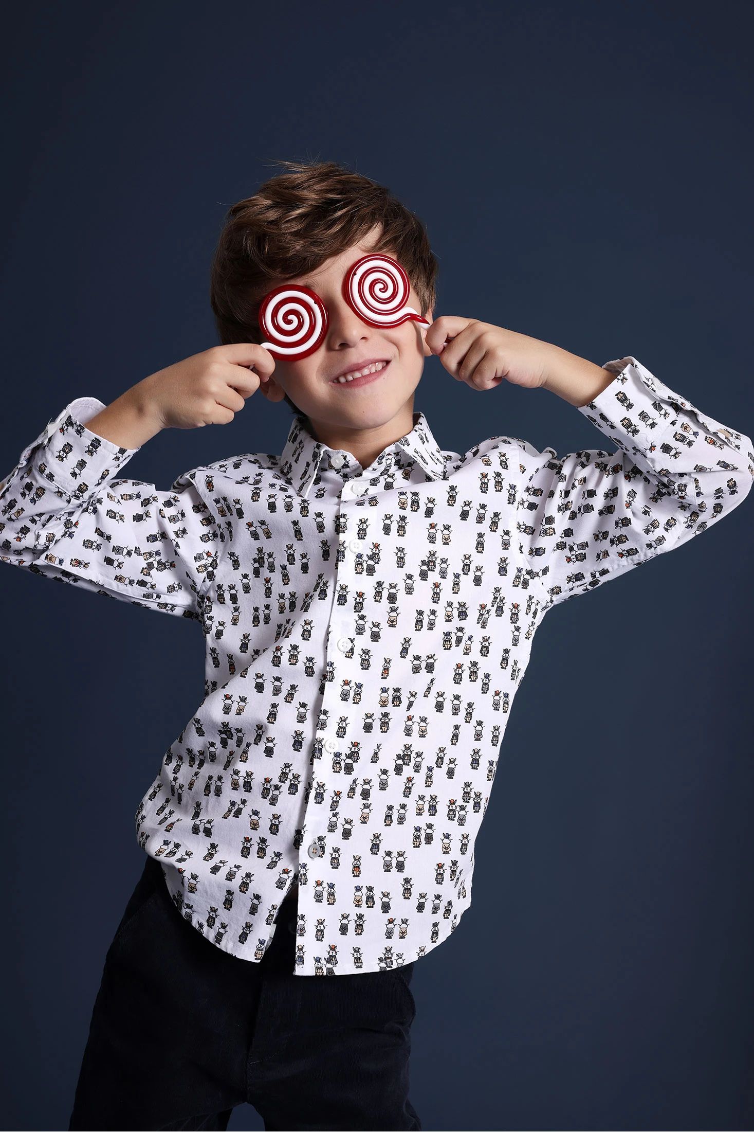 Poplin shirt for boys in white with an animal print, ideal for adding a playful touch to your little one's wardrobe. Made from poplin, it offers a soft and comfortable texture, perfect for the delicate skin of young children. Designed with long sleeves and a classic collar, it's available in sizes from 12 months to 10 years, ensuring a perfect fit at every stage of growth. A versatile piece that can be easily paired with formal trousers for an elegant outfit or with jeans for a casual everyday look.