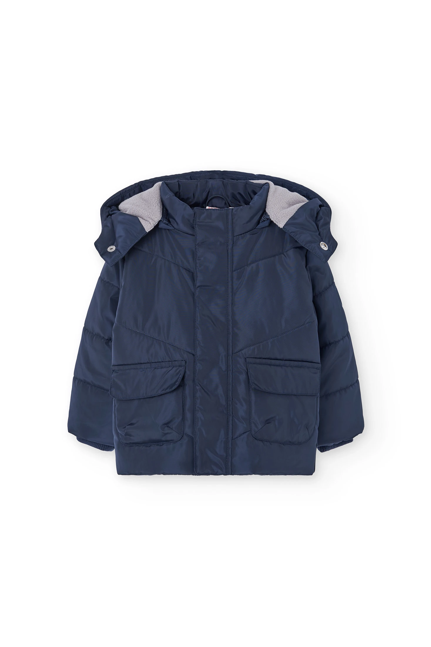 Technical fabric parka for boys in navy blue, ideal for the low temperatures of autumn and winter. Made with high-quality insulating material, it ensures warmth and comfort at all times. It includes a detachable hood that provides additional protection against the wind, as well as two practical front pockets. Available in sizes from 12 months to 10 years, it combines style and functionality, making it perfect for keeping your little one warm during outdoor activities.