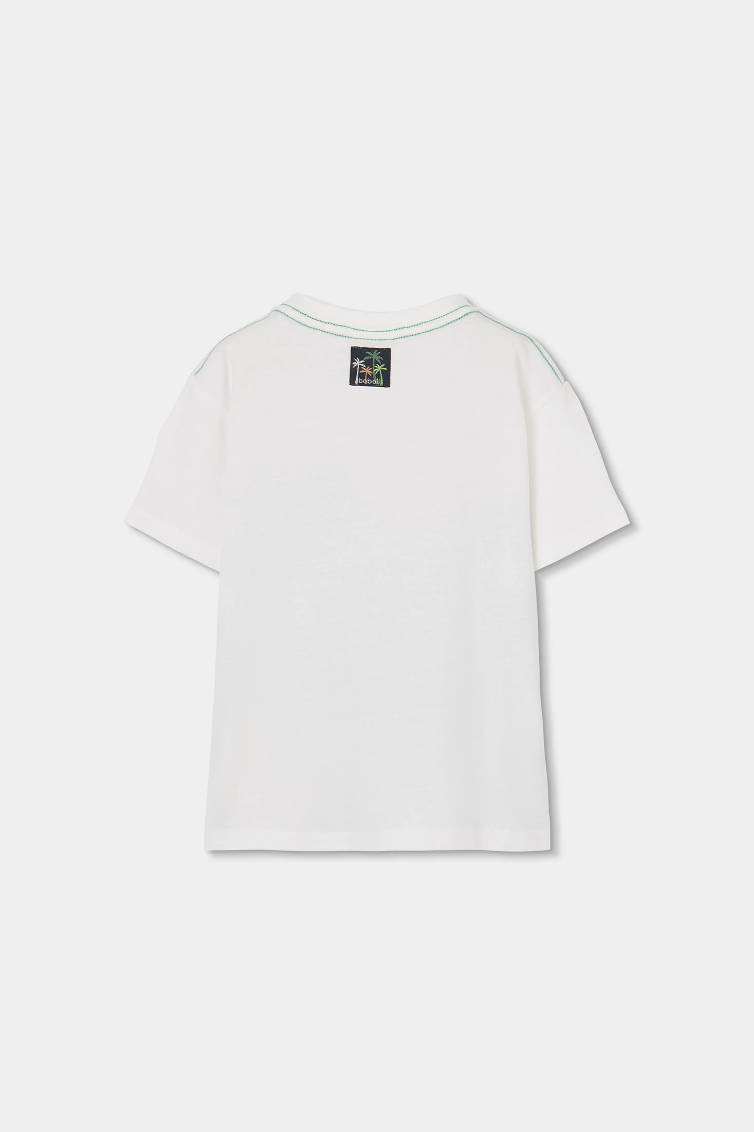 White cotton T-shirt for boys. Featuring a large fun print with applied details. Its cotton fabric ensures freshness and comfort, perfect for everyday use. Available in sizes from 12 months to 10 years, it offers flexibility to adapt to your child?s growth. The classic cut and round neck make it easy to pair with different clothing styles, adding a playful touch to their daily outfit.