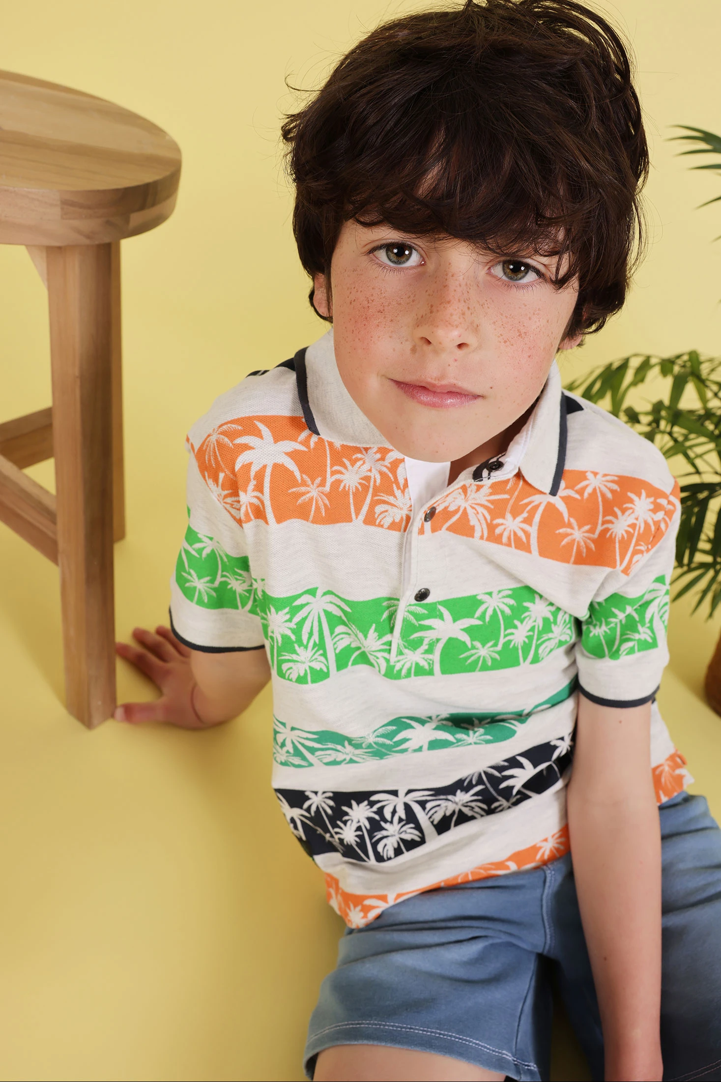 Piqu? polo shirt in raw melange colour, featuring a print of palm trees in vibrant stripes of green, orange, and dark grey. With a short sleeve design and classic collar, it is ideal for warm climates. Available in sizes from 12 months to 10 years, it pairs perfectly with shorts for a fresh, summery look. Its cotton material provides comfort and breathability, being a practical and versatile garment for children's daily wear.