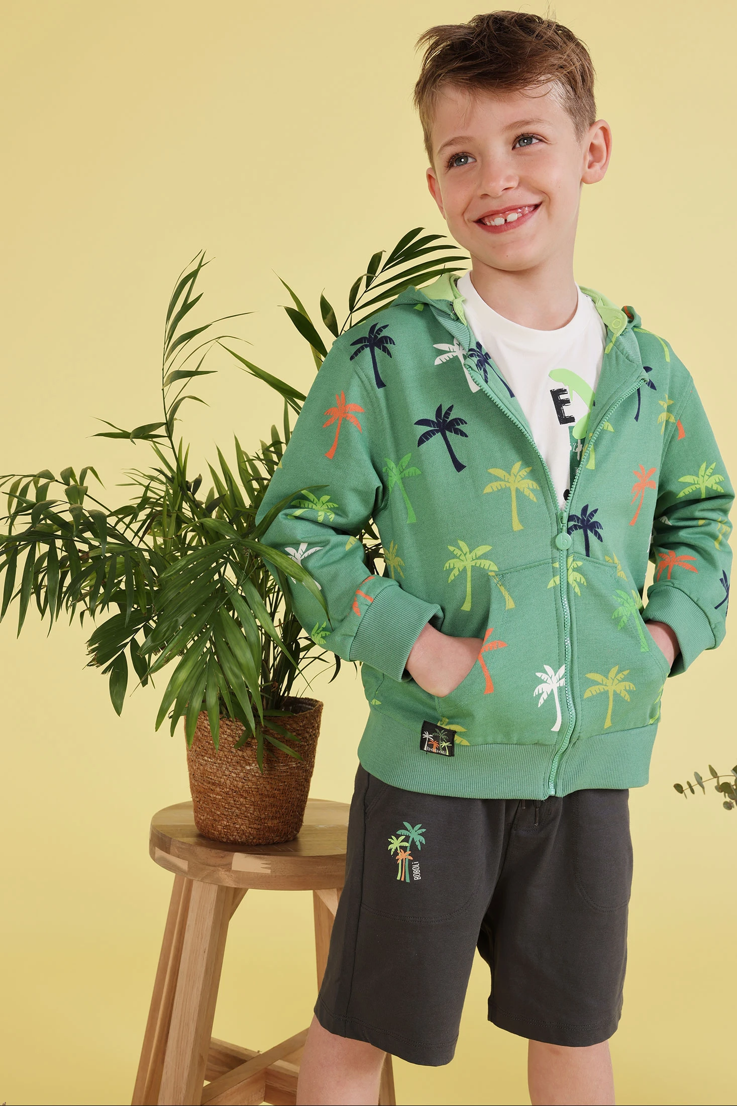 Plush jacket for boy. In green, it features a fun palm tree print in various shades. Its design includes a detachable hood and a zip closure for added practicality. Made from a soft material, it is comfortable and warm. Available in sizes from 12 months to 10 years, it is perfect for pairing with jeans or casual trousers, offering style and comfort with every wear.