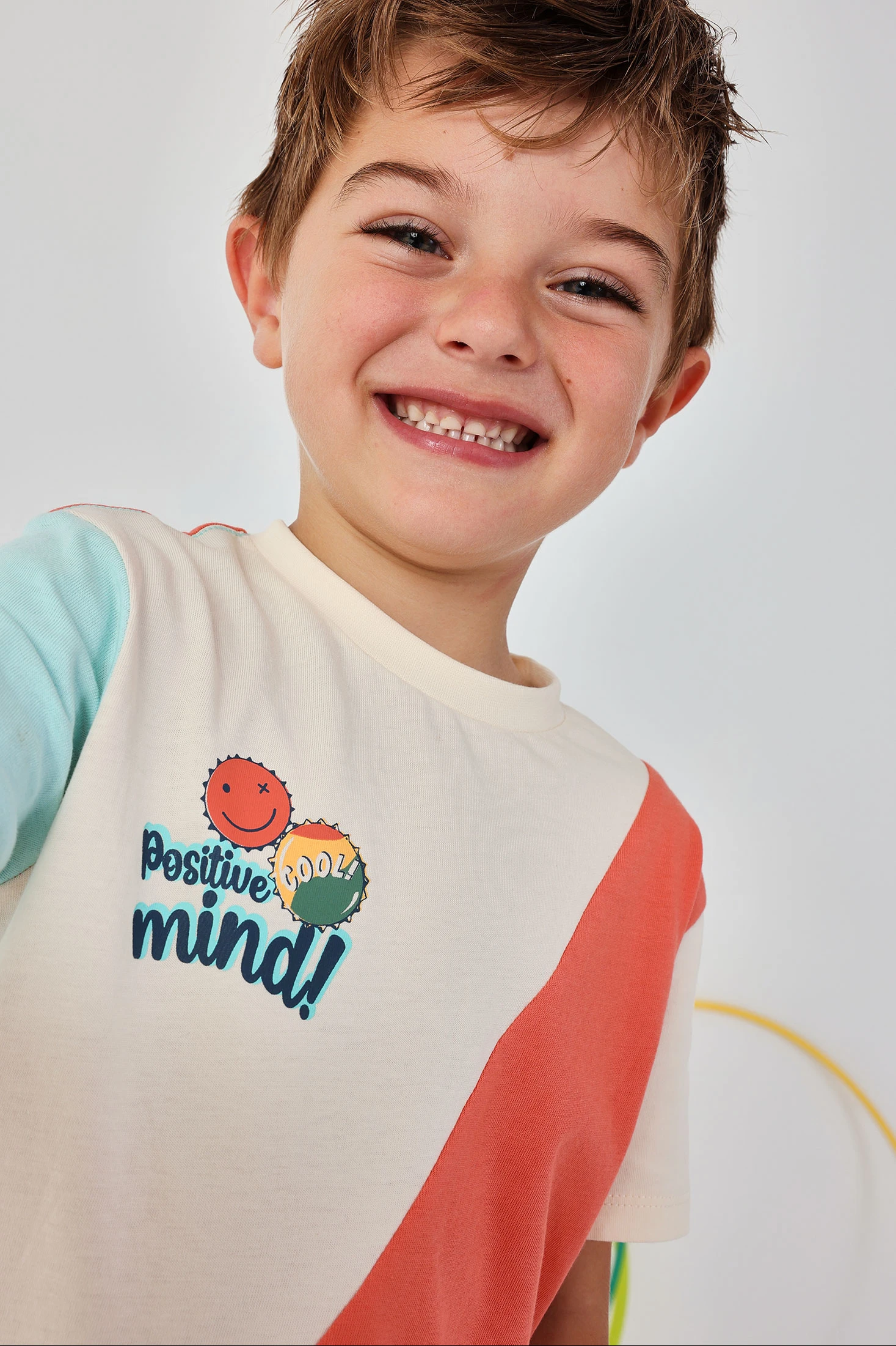Three-colour cotton T-shirt for boys with a modern and cheerful design, combining orange, blue, and off-white. Featuring prints with positive phrases, it is ideal for a casual and fun look. Available in sizes from 12 months to 10 years, catering to different stages of growth. The cotton material ensures softness and comfort for daily wear. Its versatile style allows for easy pairing with trousers or shorts, making it perfect for any informal occasion.