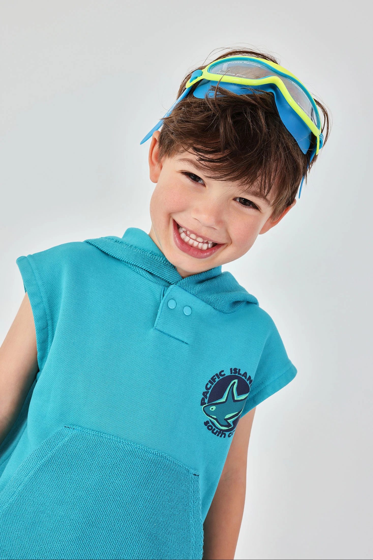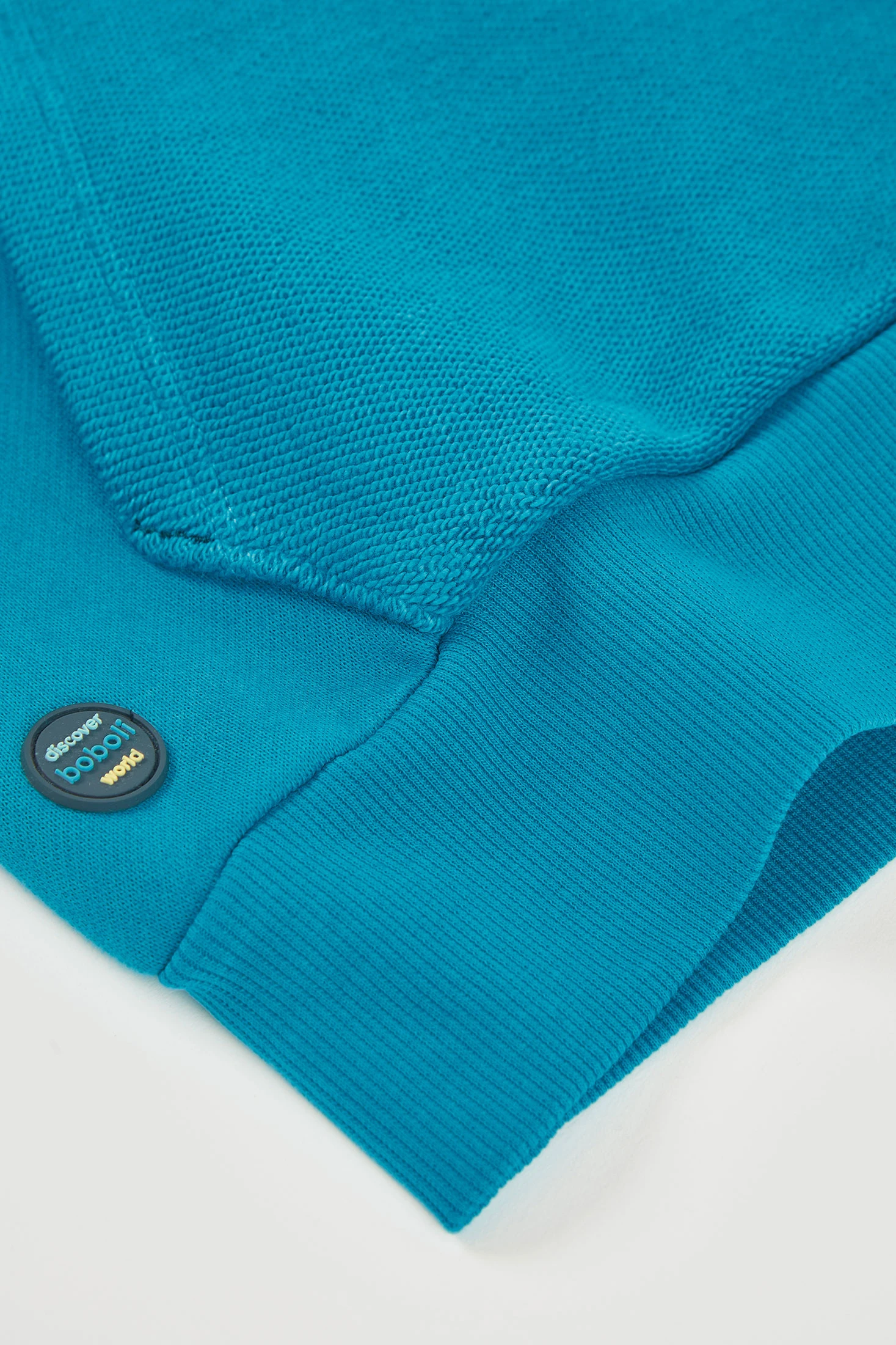 Blue fleece sweatshirt for boys, perfect for the summer season. It is made from a material that provides warmth and comfort. It features a hooded design with a shark print, adding a fun touch. It is available in sizes from 12 months to 10 years. Ideal to pair with jeans or sports trousers, it's a versatile and practical option for warm days. Its casual style makes it suitable for everyday wear, ensuring a comfortable and modern look.