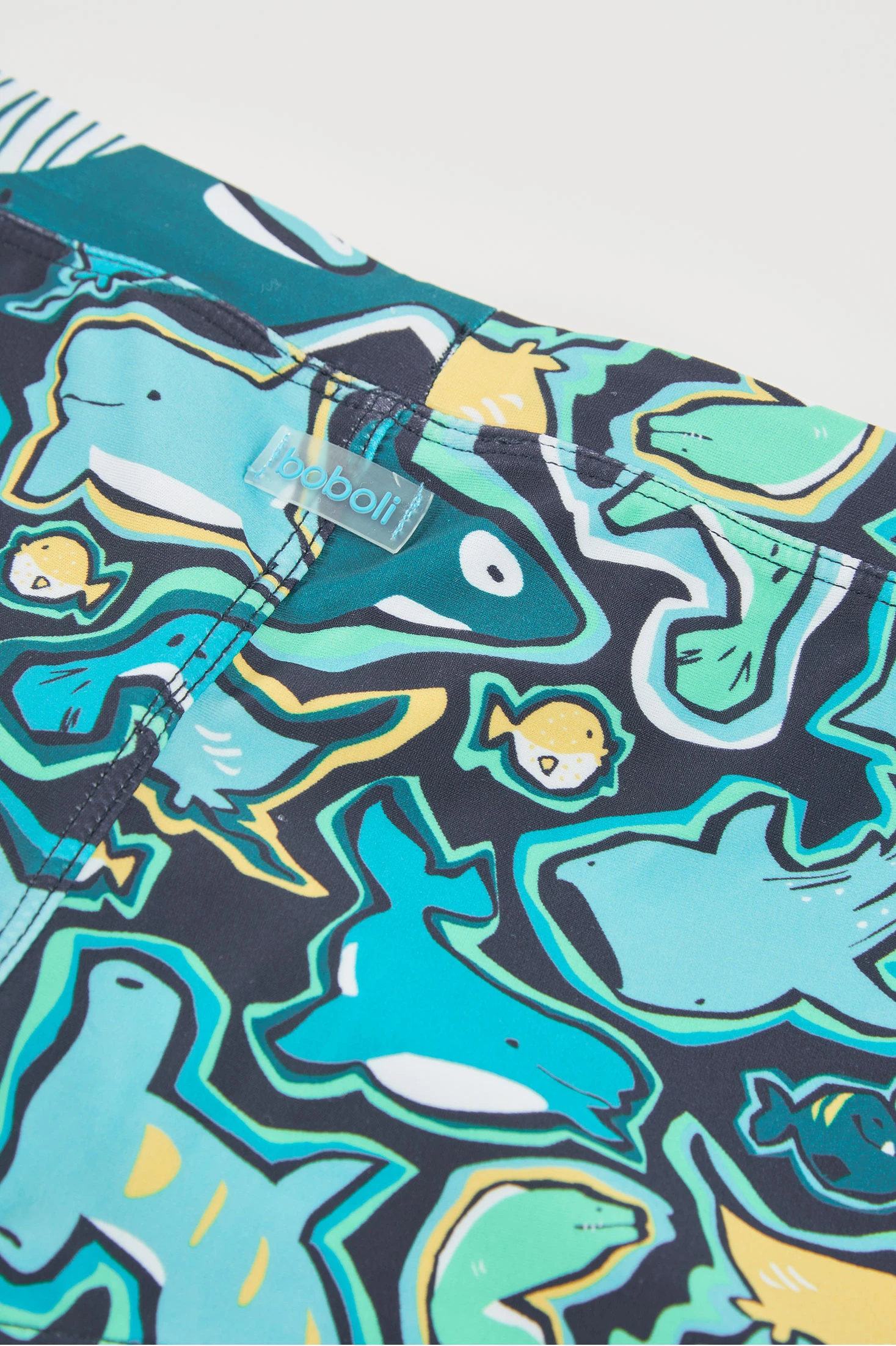 Printed swimsuit for boys, ideal for enjoying the summer. Its design features a fun pattern of marine animals in blue and green tones, perfect for young explorers. Made from water-resistant material, it ensures comfort and durability. Available in sizes from 12 months to 10 years, guaranteeing an ideal fit as they grow. This swimsuit combines style and functionality, making it a practical choice for the pool or beach.