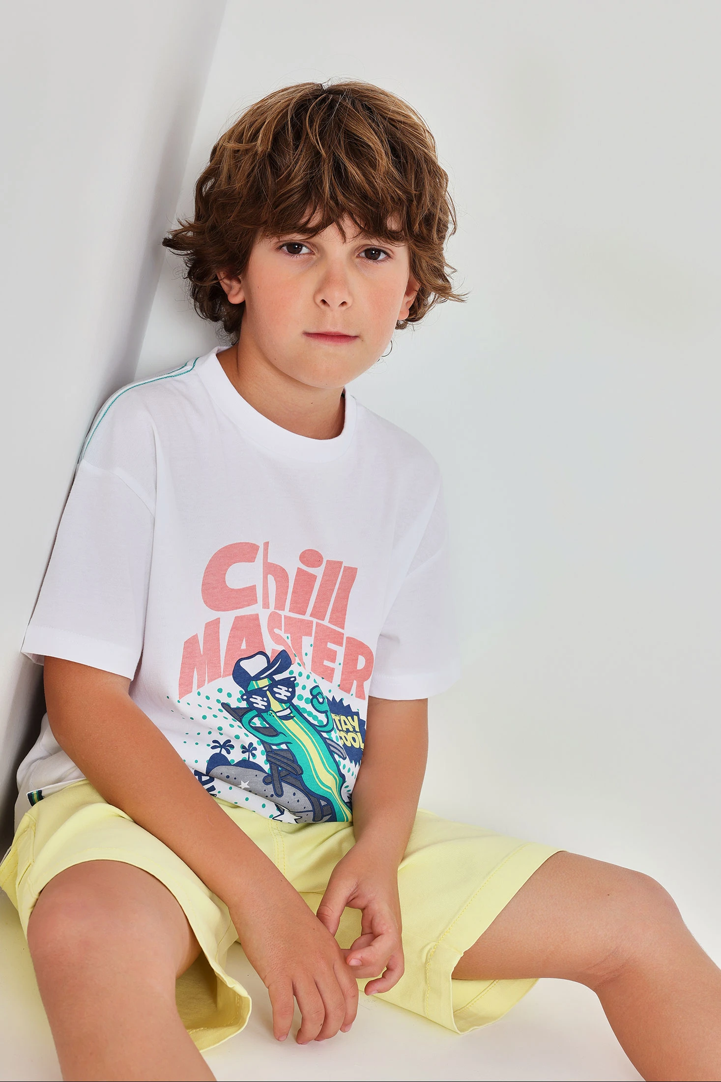 Short-sleeved T-shirt for boys, made from white cotton knit, ideal for providing comfort and style. Features a surfboard design and text that adds a fun, summery touch. Perfect for children aged 2 to 14 years, offering a versatile option to pair with trousers or shorts. Its soft material is ideal for everyday wear, providing warmth during more summery seasons. A garment that is not only functional but also adds a trendy element to a child's wardrobe.