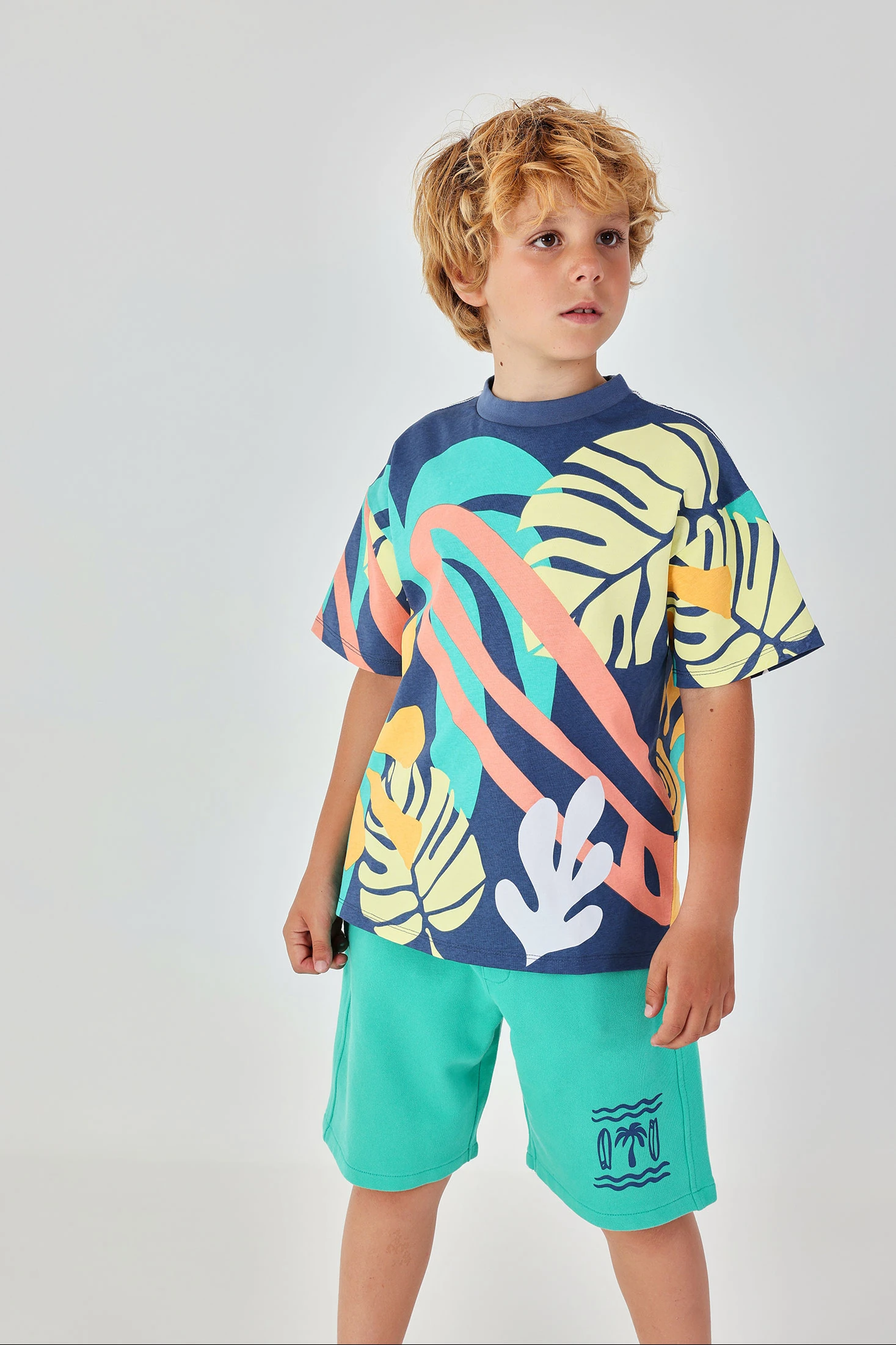 Fleece shorts for boys, perfect for the summer, crafted from soft and comfortable fabric. Presented in a vibrant green colour, they add freshness to any outfit. Featuring a fun print of blue palm trees, ideal for adding a touch of beach style. The adjustable drawstring waistband ensures a perfect fit. Available in sizes from 2 years to 14 years, these shorts are a versatile option to pair with t-shirts or lightweight sweatshirts in warm weather.
