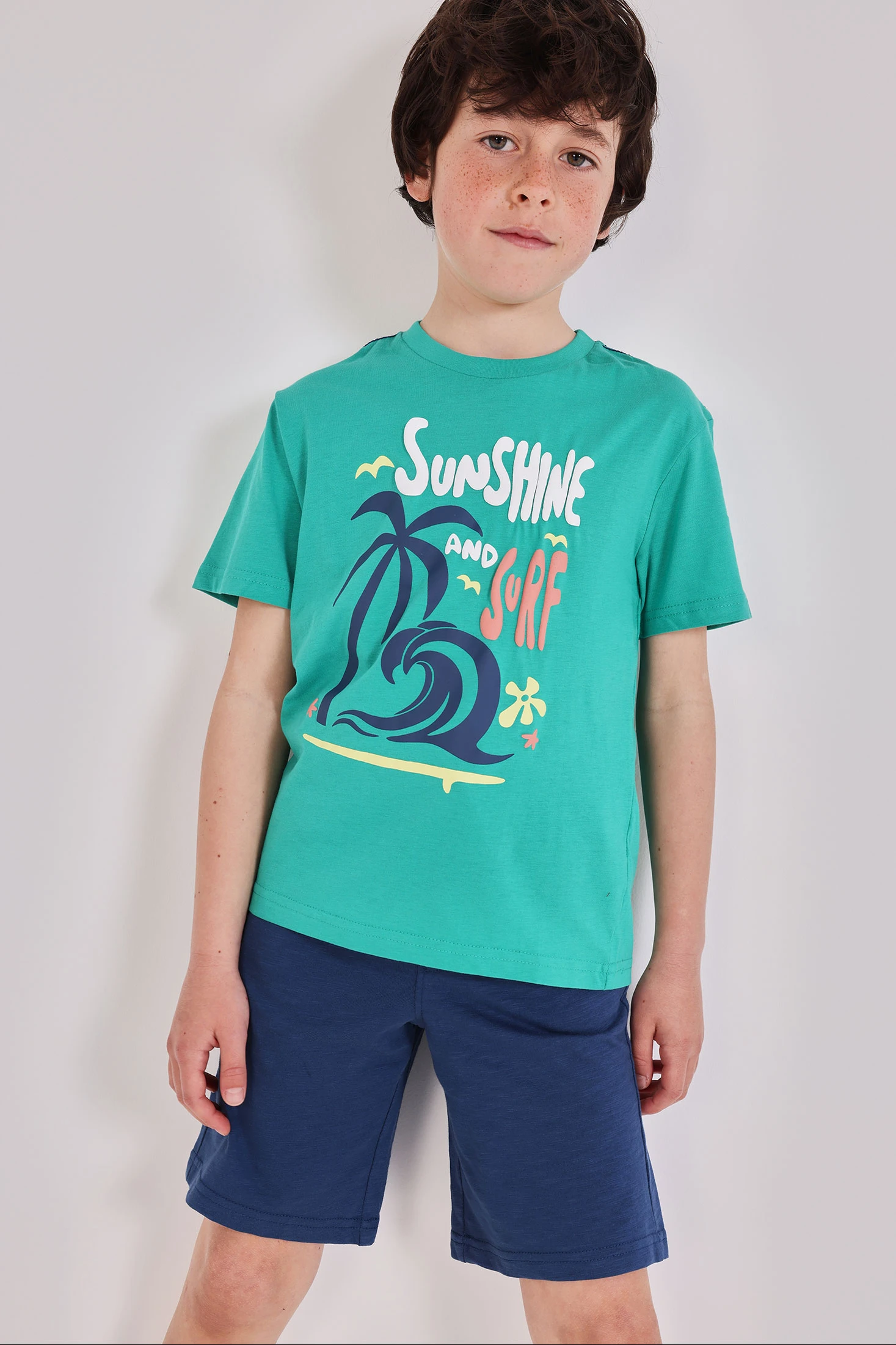 Blue T-shirt set for boys, perfect for summer. Crafted from cotton, it provides freshness and comfort. The T-shirt features a design with palm trees and waves, adding a fun and beachy touch. Available in sizes from 2 years to 14 years, this set is ideal for play and fun days. The short sleeves facilitate movement, and the vibrant colour makes it easy to pair with other casual styles for a relaxed and comfortable look.