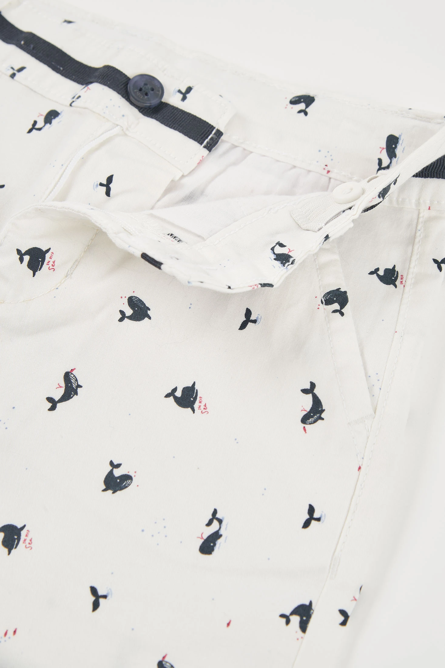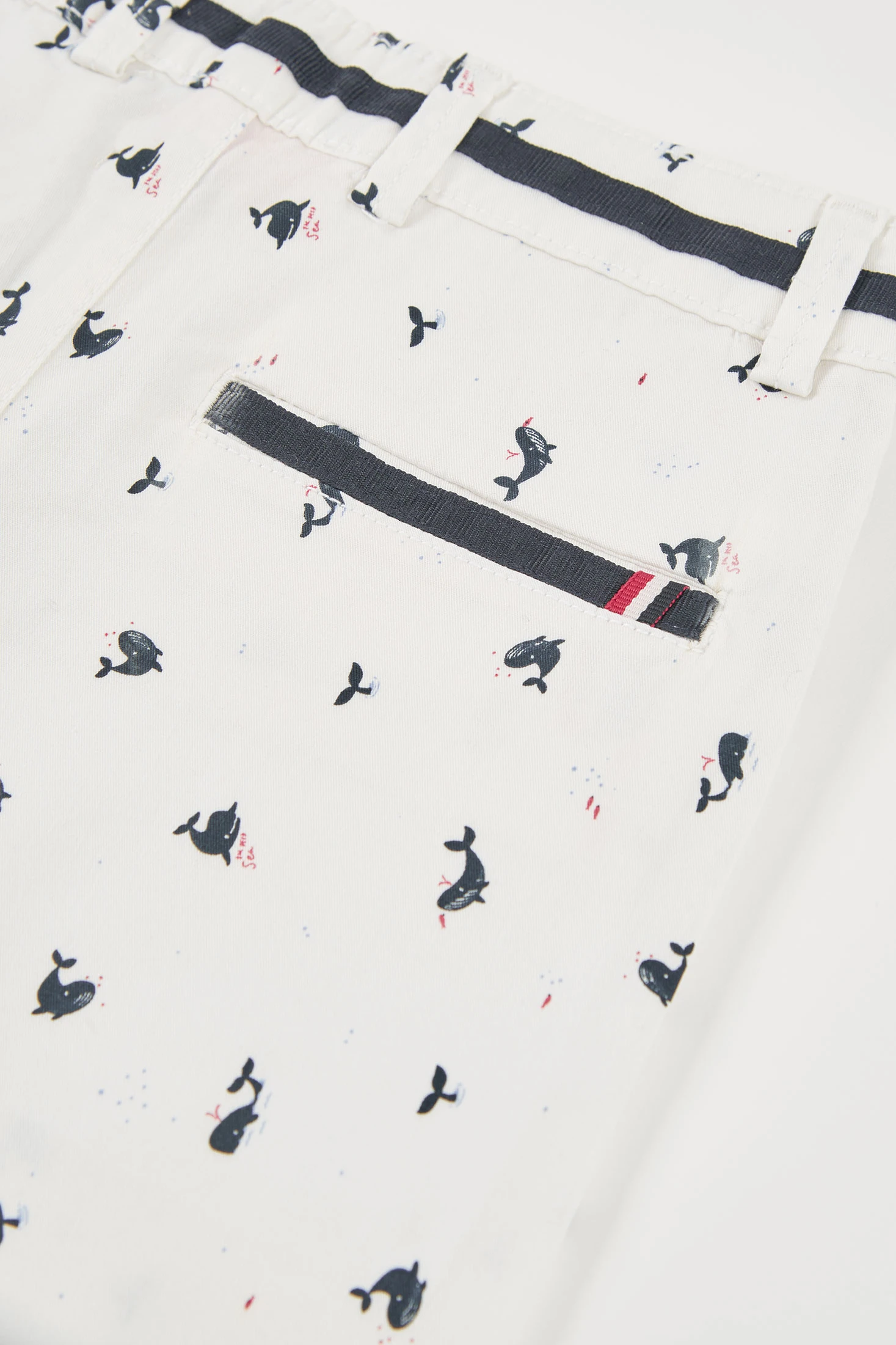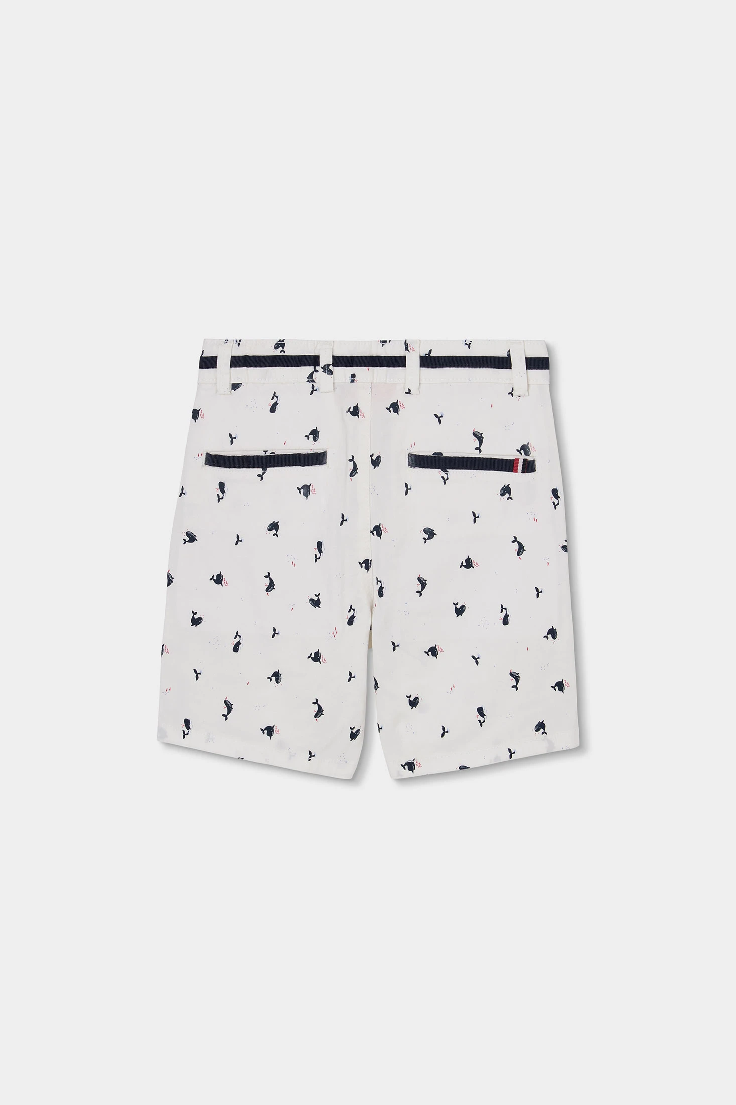Printed cotton Bermuda shorts ideal for the little ones, designed to provide comfort and freshness during the warmer months. They feature animal silhouettes that add a fun and original touch. The base colour is white, making it easy to pair with other garments. Available in sizes from 12 months to 10 years, they are perfect for any casual occasion. A versatile staple to add to children's wardrobes, ensuring style and practicality in their daily lives.