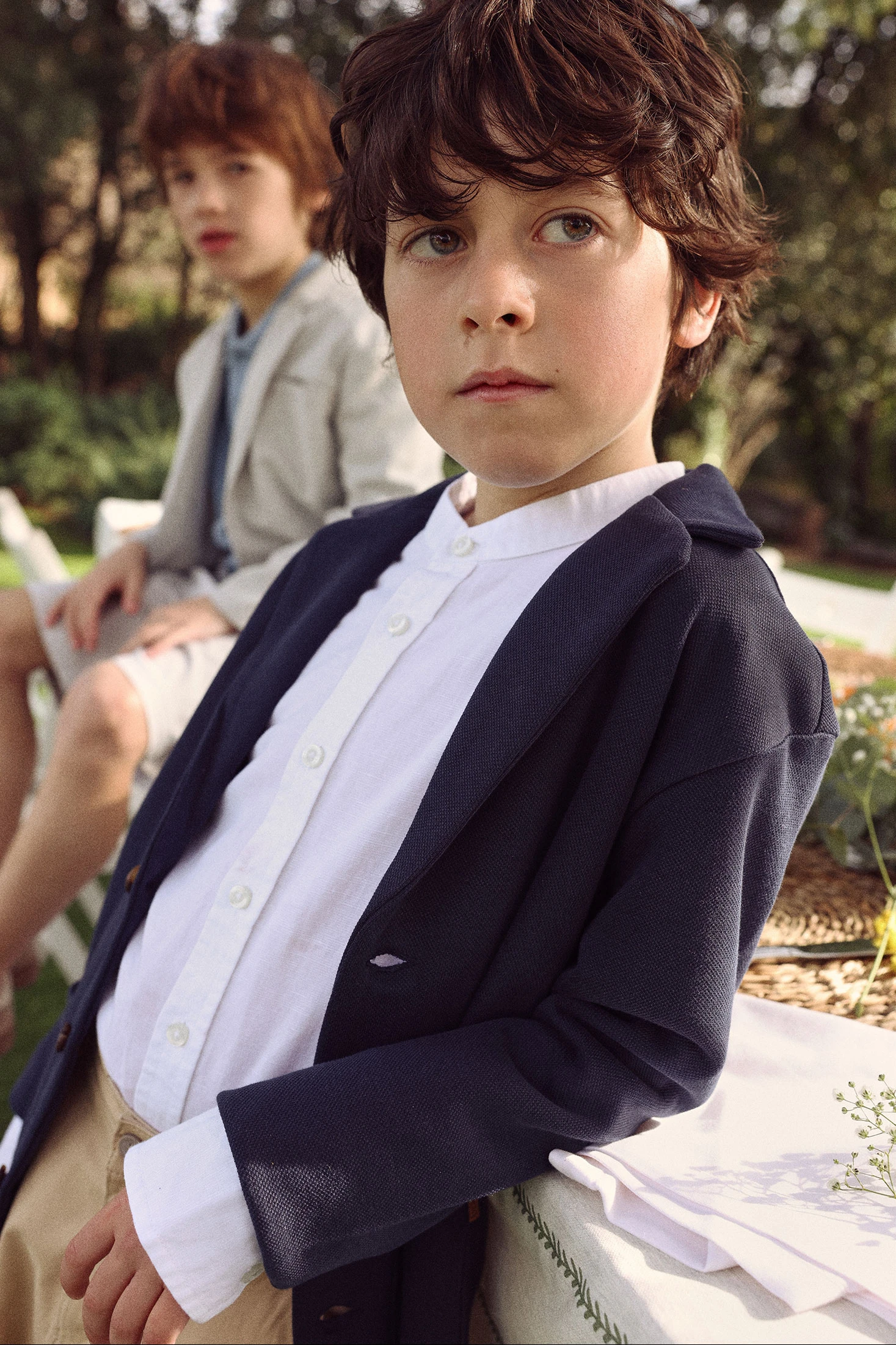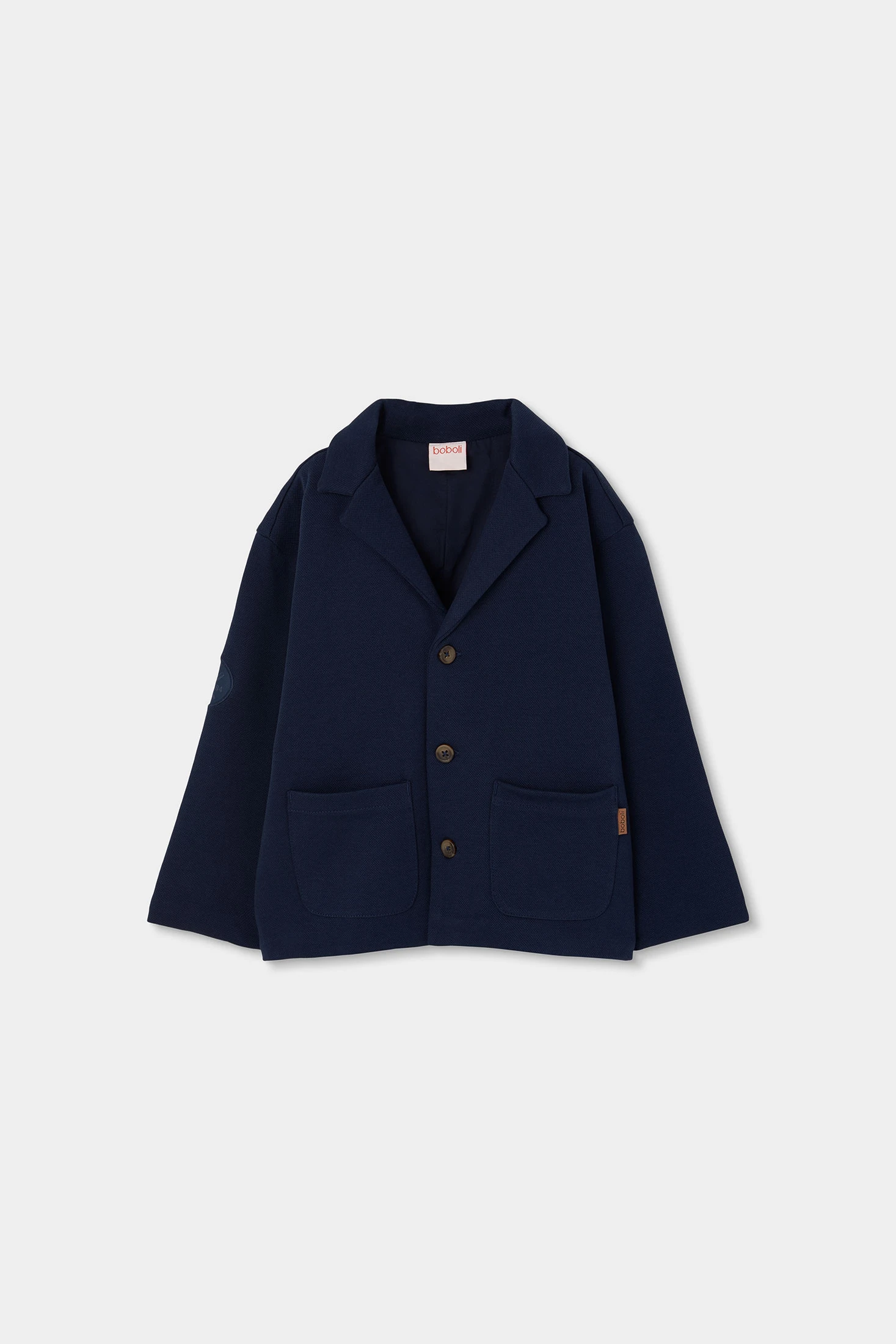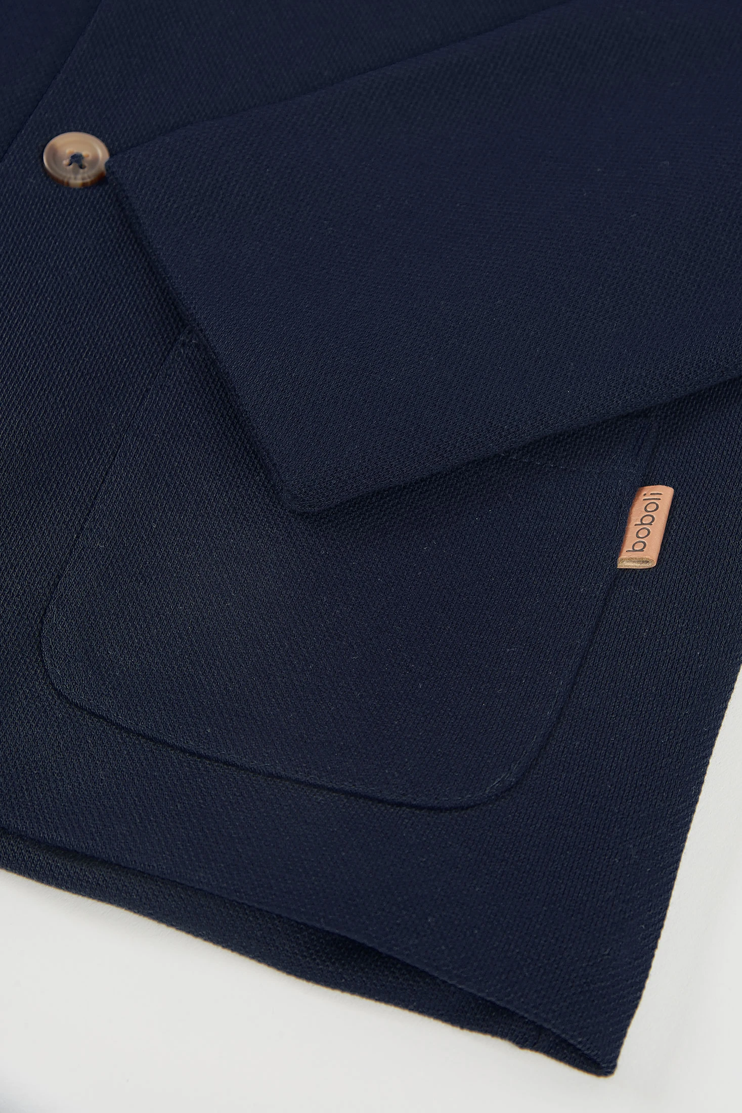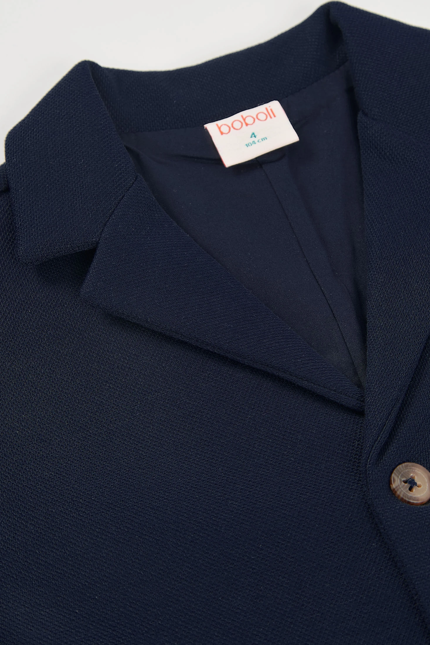 Navy blue knitted blazer for boys, ideal for the spring season. With a classic design, it features a front button closure and lapels, providing an elegant touch. Its knitted fabric ensures comfort and warmth, suitable for ages 2 to 14 years. The long sleeves make it perfect for chilly days, and its practical pockets add functionality. This jacket is easily pairable with trousers or jeans, making it a versatile piece in any child?s wardrobe.