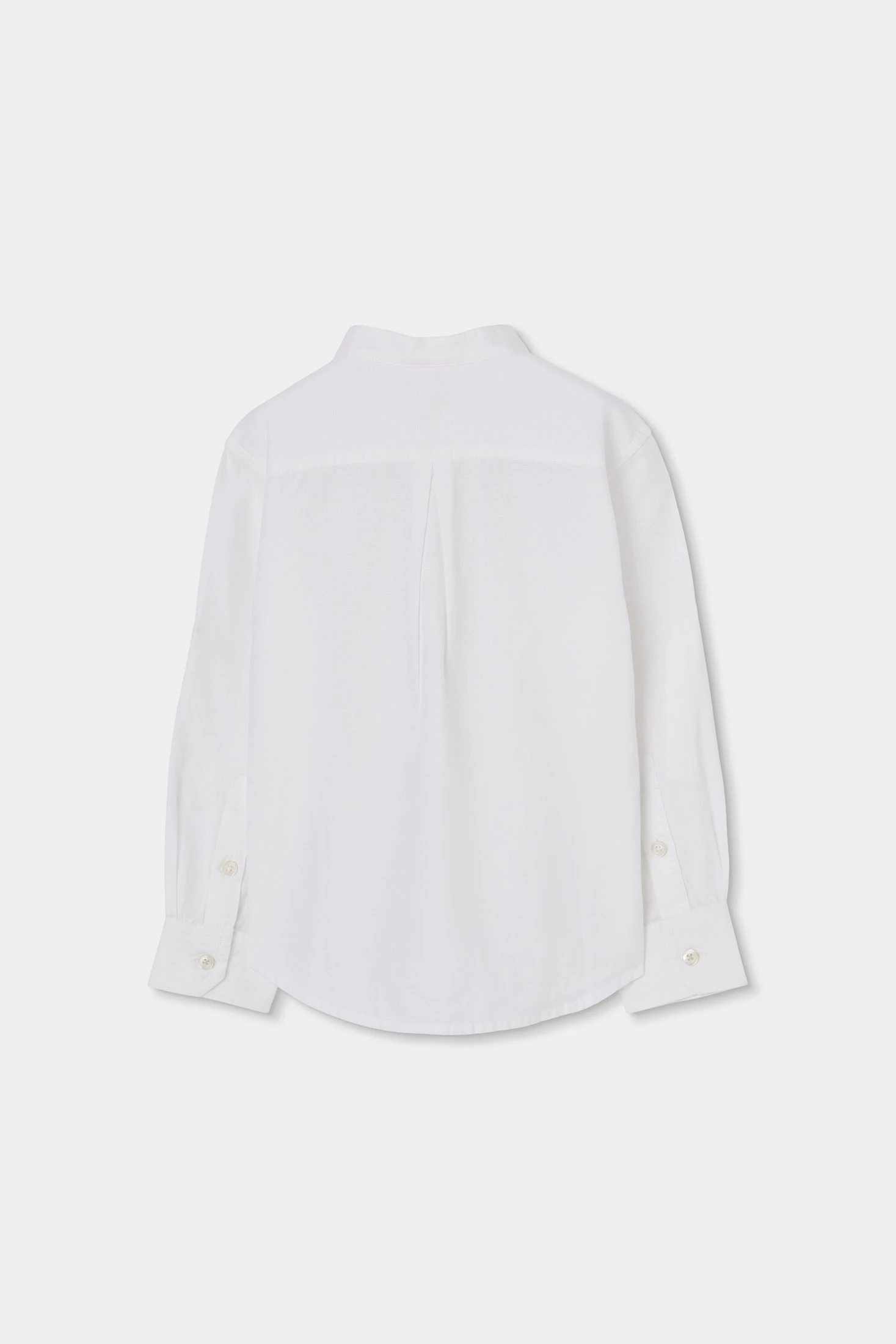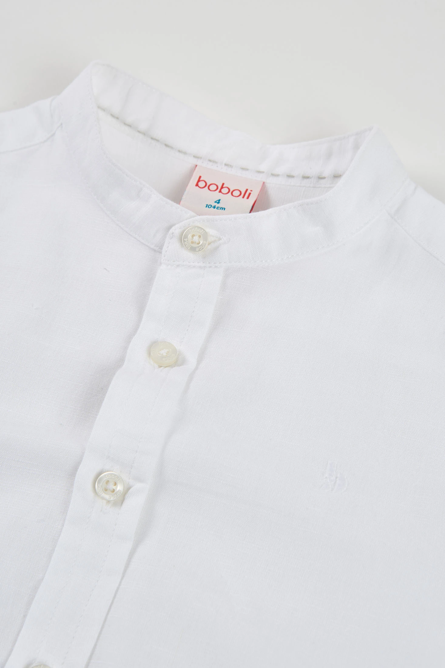 White linen shirt for boys, perfect for an elegant and fresh style. Made from lightweight material, it ensures comfort in warm climates. Featuring a long sleeve design and a button closure for easy use. The classic collar adds a sophisticated touch. Available in sizes from 12 months to 14 years, it is ideal to accommodate the child?s growth. Its white colour makes it extremely versatile to pair with trousers of various styles, creating both formal and casual looks.