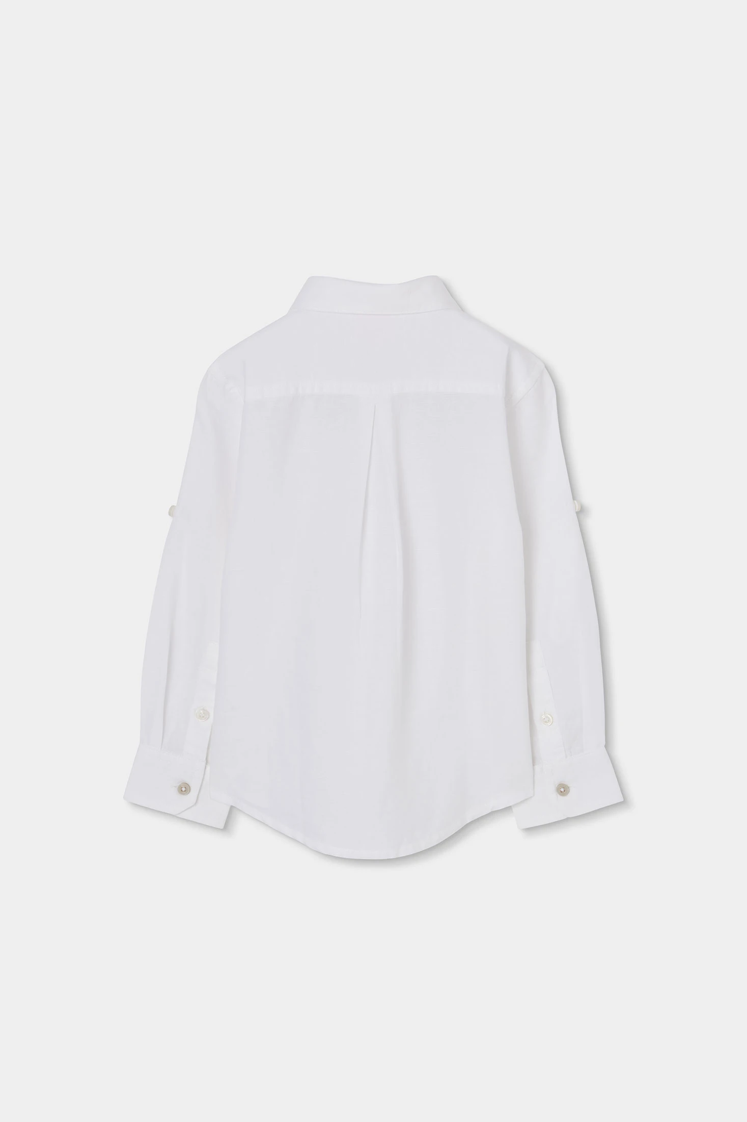White linen shirt for boys, elegant and fresh, ideal for special occasions or everyday wear. Its plain and classic design features a traditional collar and front buttons, offering a neat style. The long sleeves can be adjusted for added comfort. Available in sizes from 12 months to 14 years, it adapts to children?s growth. Its neutral colour makes it easy to pair with trousers or shorts of various colours, adding a sophisticated touch to any outfit.