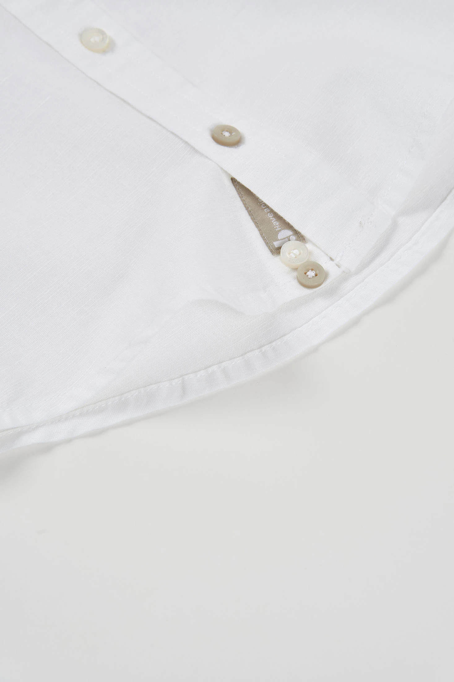 White linen shirt for boys, perfect for any occasion, offering an elegant and comfortable style. Its simple design, with a classic collar and short sleeves, makes it ideal for summer. Made from a fresh material that allows breathability, it ensures comfort on warm days. Available in sizes from 12 months to 14 years, it adapts to the child?s growth. Its versatile white colour pairs with both shorts and trousers, allowing for a variety of casual or formal styles. An essential garment for a clean and sophisticated look.