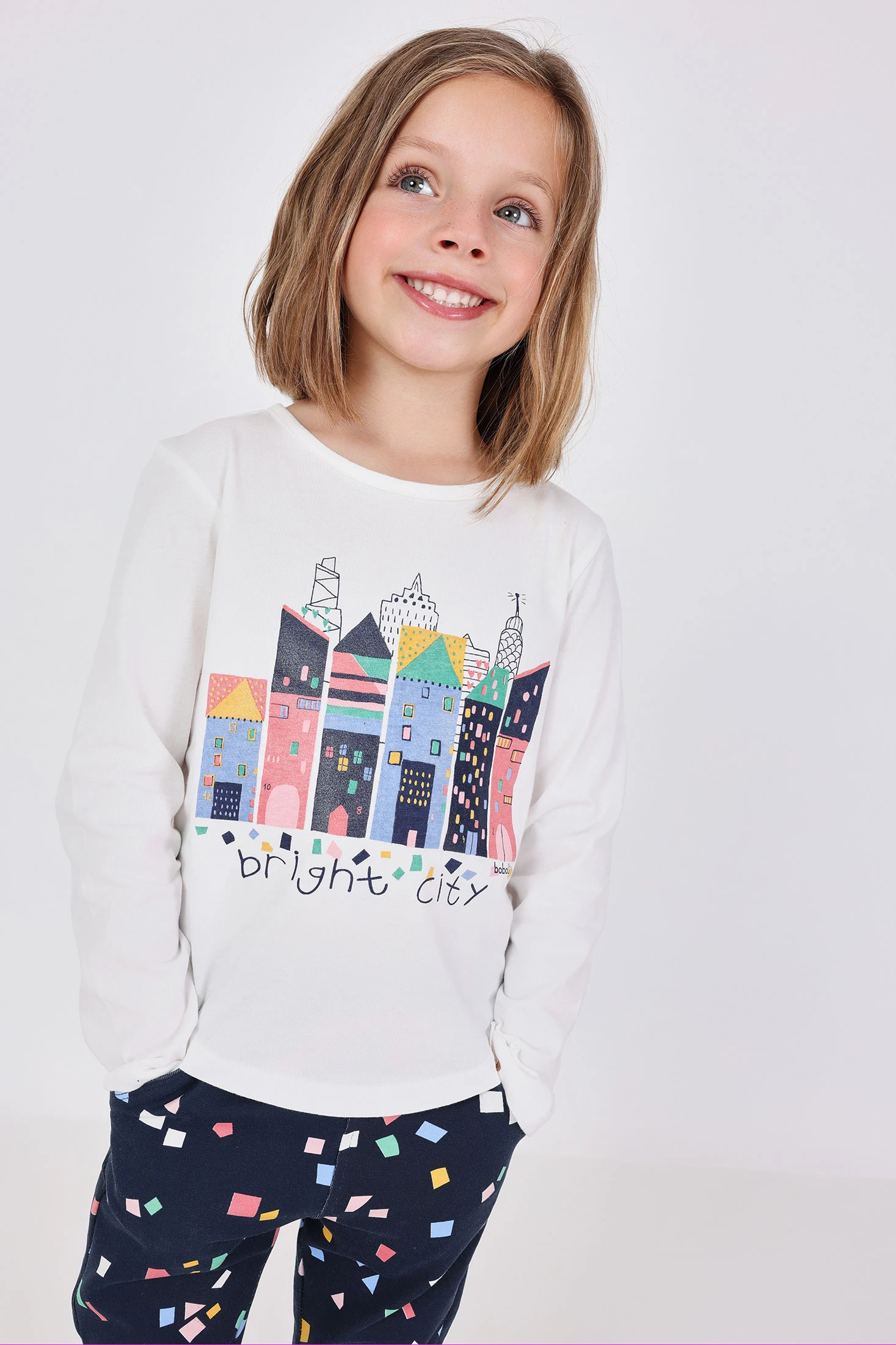 White knitted T-shirt for girls featuring a design of buildings in vibrant shades, perfect for the autumn and winter seasons. Crafted from a knit fabric that ensures comfort and freedom of movement. It has a round neck and long sleeves to provide warmth on cooler days. Available in sizes ranging from 12 months to 10 years. Ideal for pairing with jeans or skirts, it adds an urban and colourful touch to your girl's wardrobe.