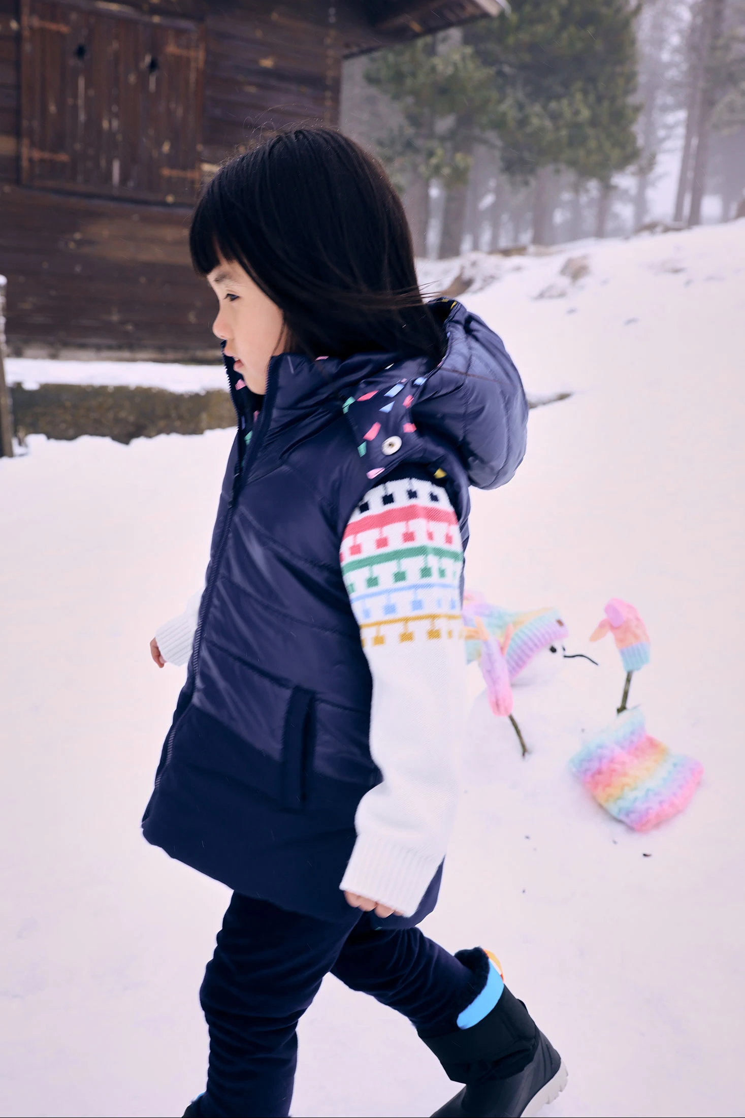 Reversible gilet in navy blue technical fabric with a multicoloured geometric design for girls, this charming garment adds a touch of joy to your little one's wardrobe. Made from a soft and lightweight material, it is ideal for transitional seasons, keeping your baby comfortable without overheating. Available in sizes from 12 months to 10 years, it pairs perfectly with long-sleeved shirts or tops to create an adorable and versatile outfit. The buttons and front zip allow for easy adjustment, while its sleeveless design facilitates the baby's mobility. An essential garment for any child's wardrobe, providing both style and comfort.