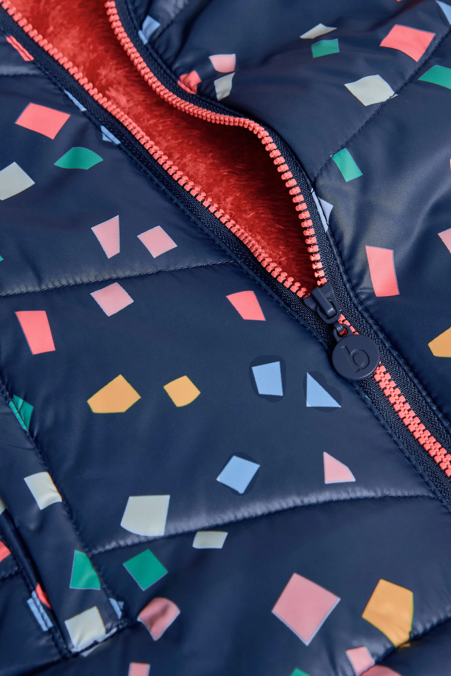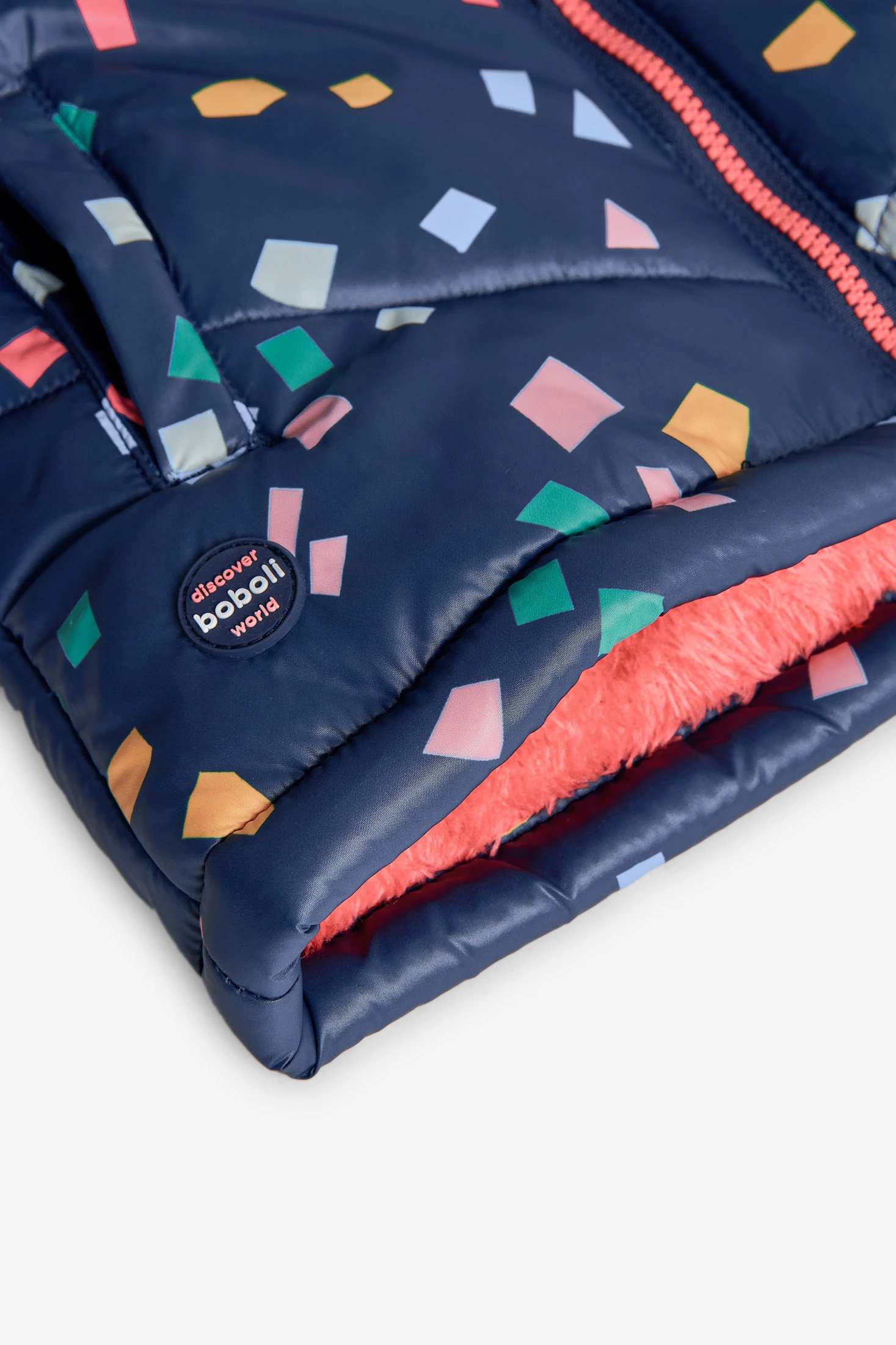 Technical fabric parka with a multicolour geometric design for girls, ideal for the winter season, providing warmth and a modern, cheerful style. Crafted with a geometric design that stands out against its blue background, this garment offers a wind and moisture-resistant outer layer. Removable hood and soft pink faux fur lining ensure extra comfort, while the front zip closure makes it easy to wear. Elastic cuffs and long sleeves guarantee a comfortable and secure fit. Available in sizes from 12 months to 10 years, perfect for pairing with jeans or leggings, offering a versatile and warm option for chilly days.