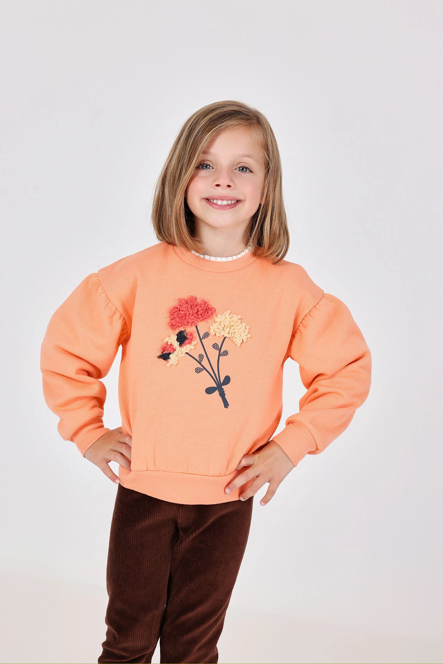Knitted sweatshirt for girls, featuring a charming floral print that brings a cheerful and youthful vibe. Crafted from high-quality material, it is perfect for the autumn and winter seasons, providing warmth and comfort. Available in sizes from 12 months to 10 years, it perfectly adapts to your daughter's growth. Ideal to pair with jeans or leggings, this sweatshirt offers versatility and style for any occasion.