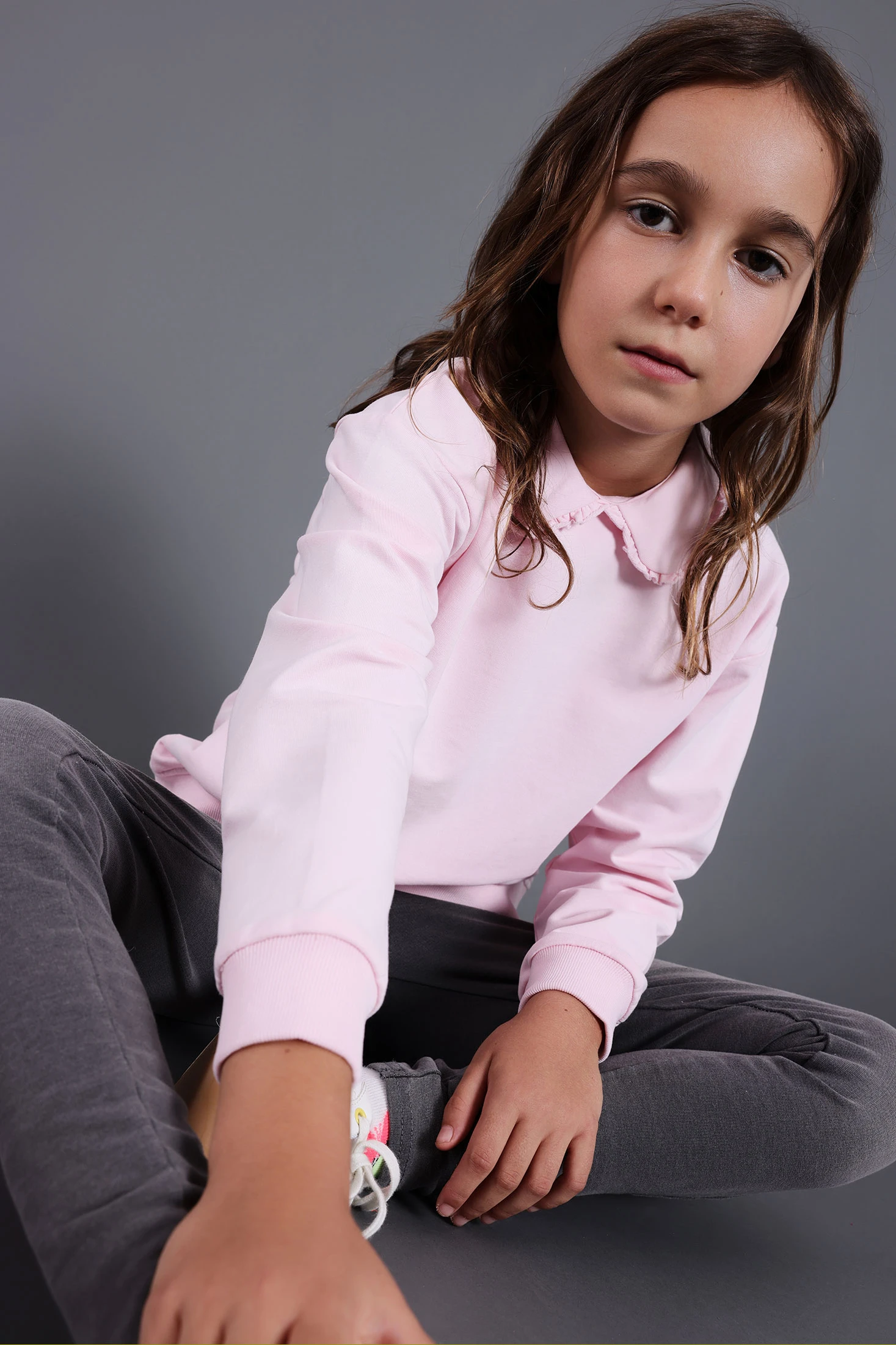 Pink fleece sweatshirt for girls, ideal for the autumn and winter months, made from a soft and warm fabric that provides comfort and warmth. A charming ruffled collar adds an elegant touch to the design. Long sleeves ensure good protection against the cold, while the back closure makes dressing easy. Available in sizes ranging from 2 to 14 years, it is perfect for pairing with jeans or leggings on various occasions.
