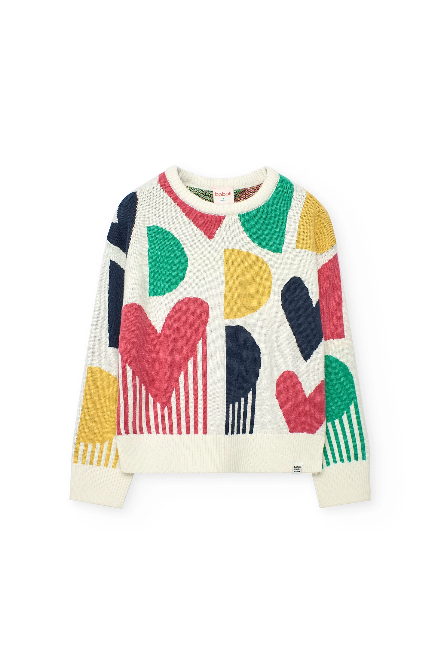 White knit jumper for girls, designed for the autumn and winter season, features a heart decoration in various colours. Crafted in soft knitted fabric, it ensures warmth and comfort, complemented by a round neck and long sleeves. Available in sizes from 2 to 14 years, this jumper is ideal for pairing with trousers or skirts, offering a modern and cosy style for any occasion.