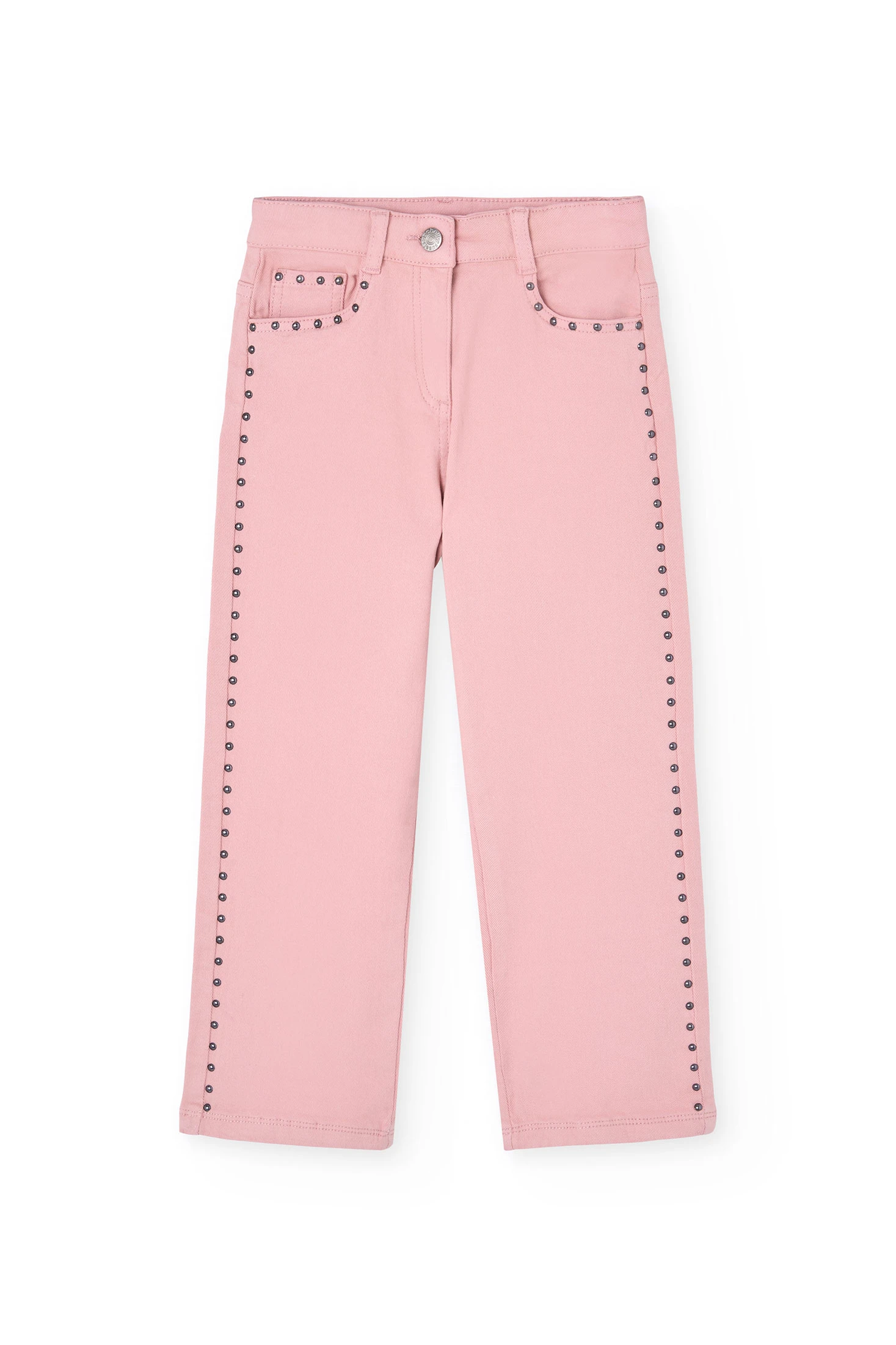 Girls' trousers with studs designed to offer comfort and style all year round. Made from a blend of cotton and elastane, they provide flexibility and durability, perfect for everyday wear. Available in various sizes, they fit your little one's body perfectly, ensuring freedom of movement. Ideal for pairing with t-shirts, blouses, or jackets, they are an essential item in any modern girl's wardrobe. A versatile choice that can elegantly complement any outfit.