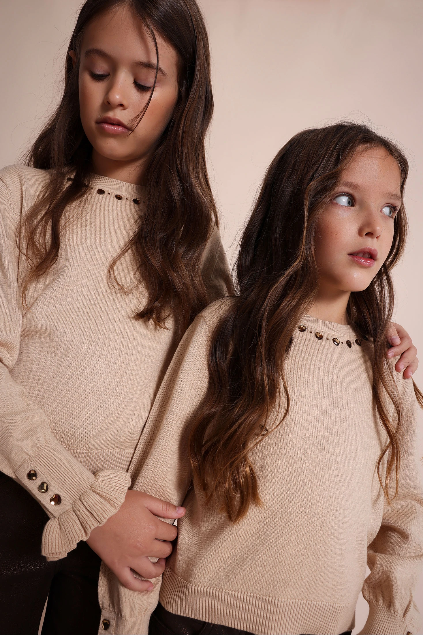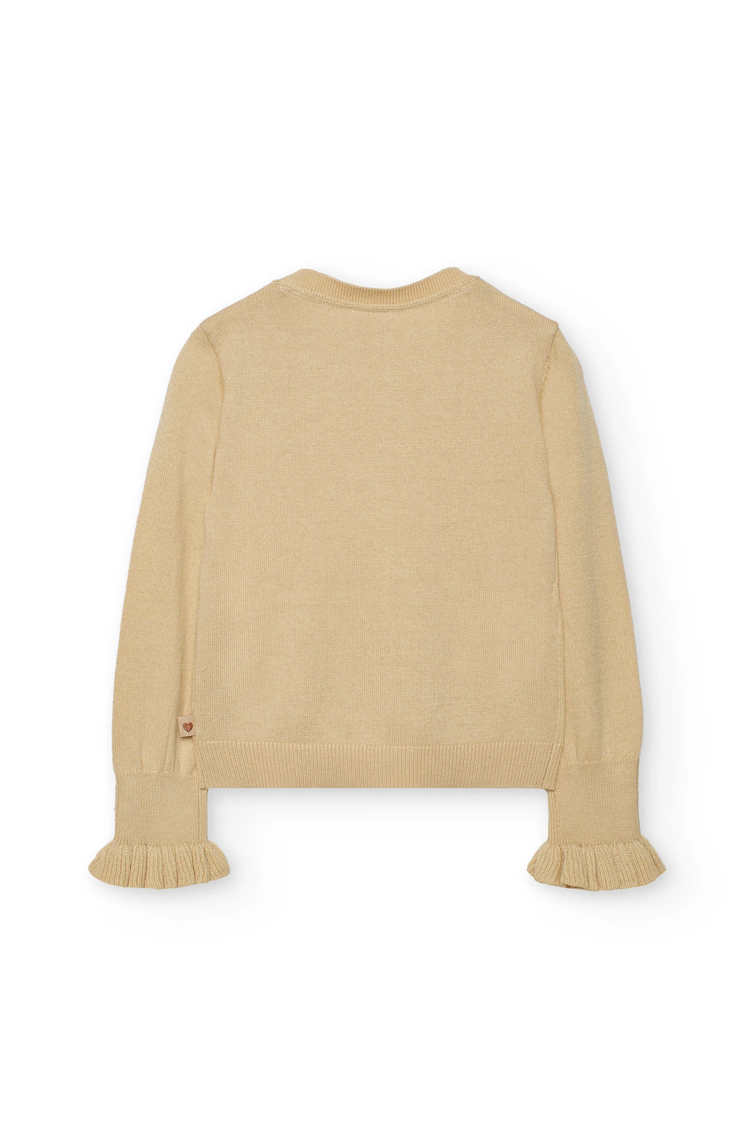 Knitted jumper for girls designed to provide warmth and style during the autumn and winter. In a sophisticated beige tone, it features charming decorative hearts distributed throughout the fabric. The garment has long sleeves with a ruffled hem, adding a modern and feminine detail. Available in sizes from 2 to 14 years, this jumper is soft to the touch and suitable for pairing with other elements of children's wardrobe, such as skirts or trousers, on various occasions.