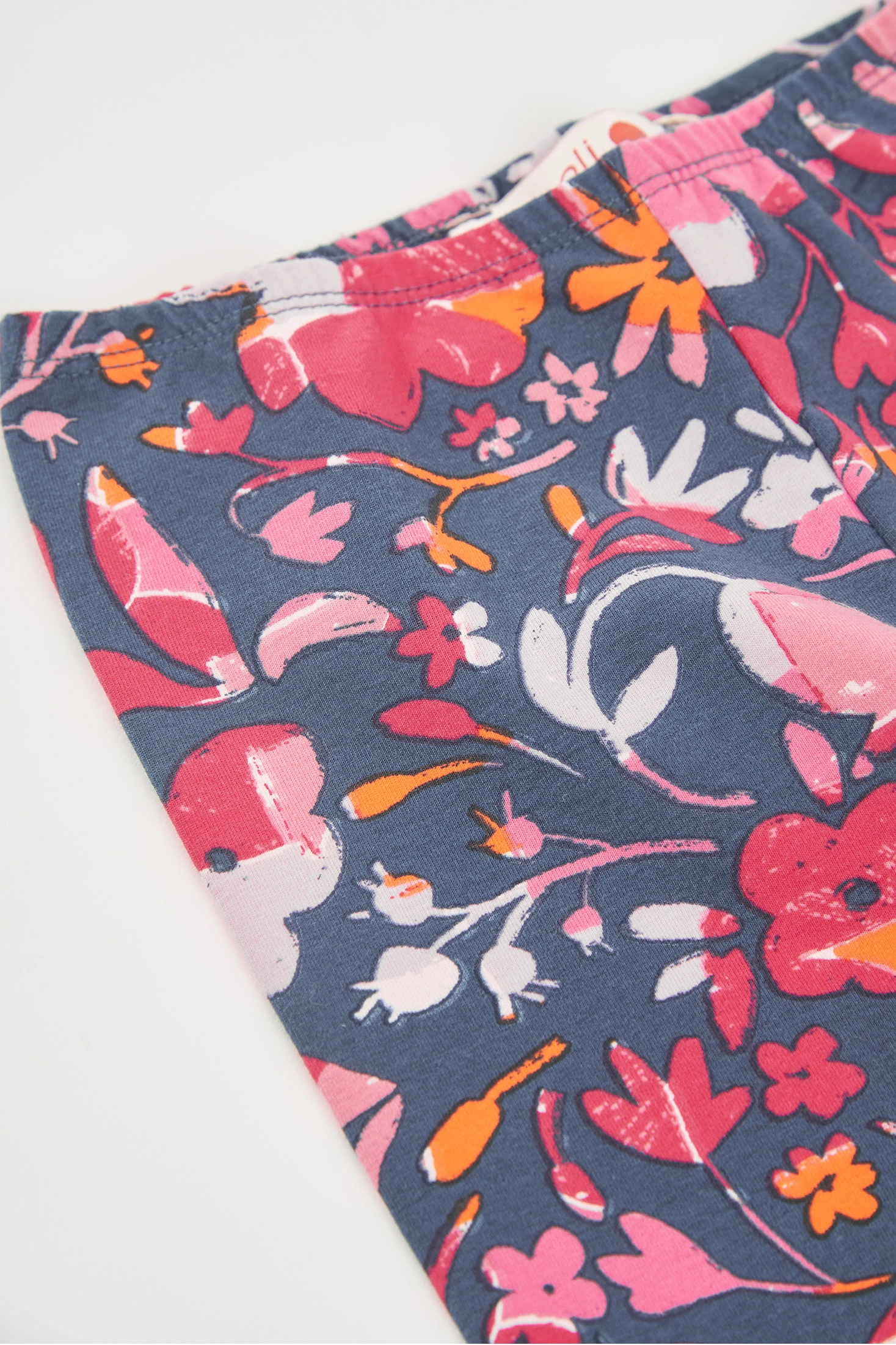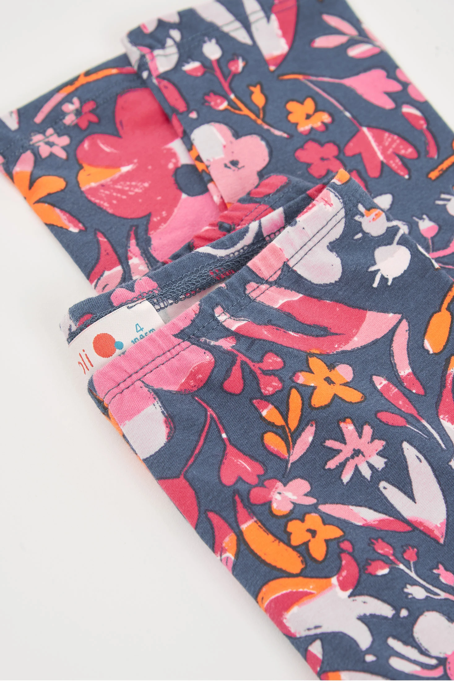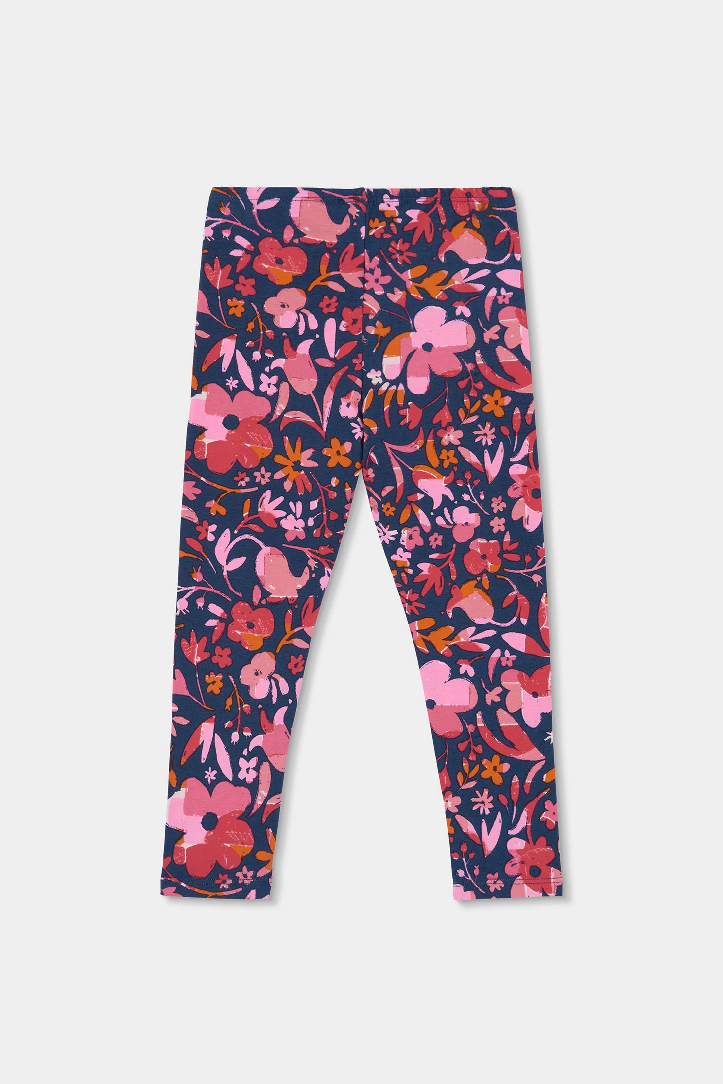 Printed knitted leggings perfect for girls, ideal for keeping them comfortable in their everyday activities. Featuring a colourful floral design on a dark blue background, they add a vibrant and cheerful touch. Their stretchy material offers comfort and allows freedom of movement. Available in sizes from 12 months to 14 years. A versatile garment that can be easily paired with plain T-shirts for a casual and stylish look.