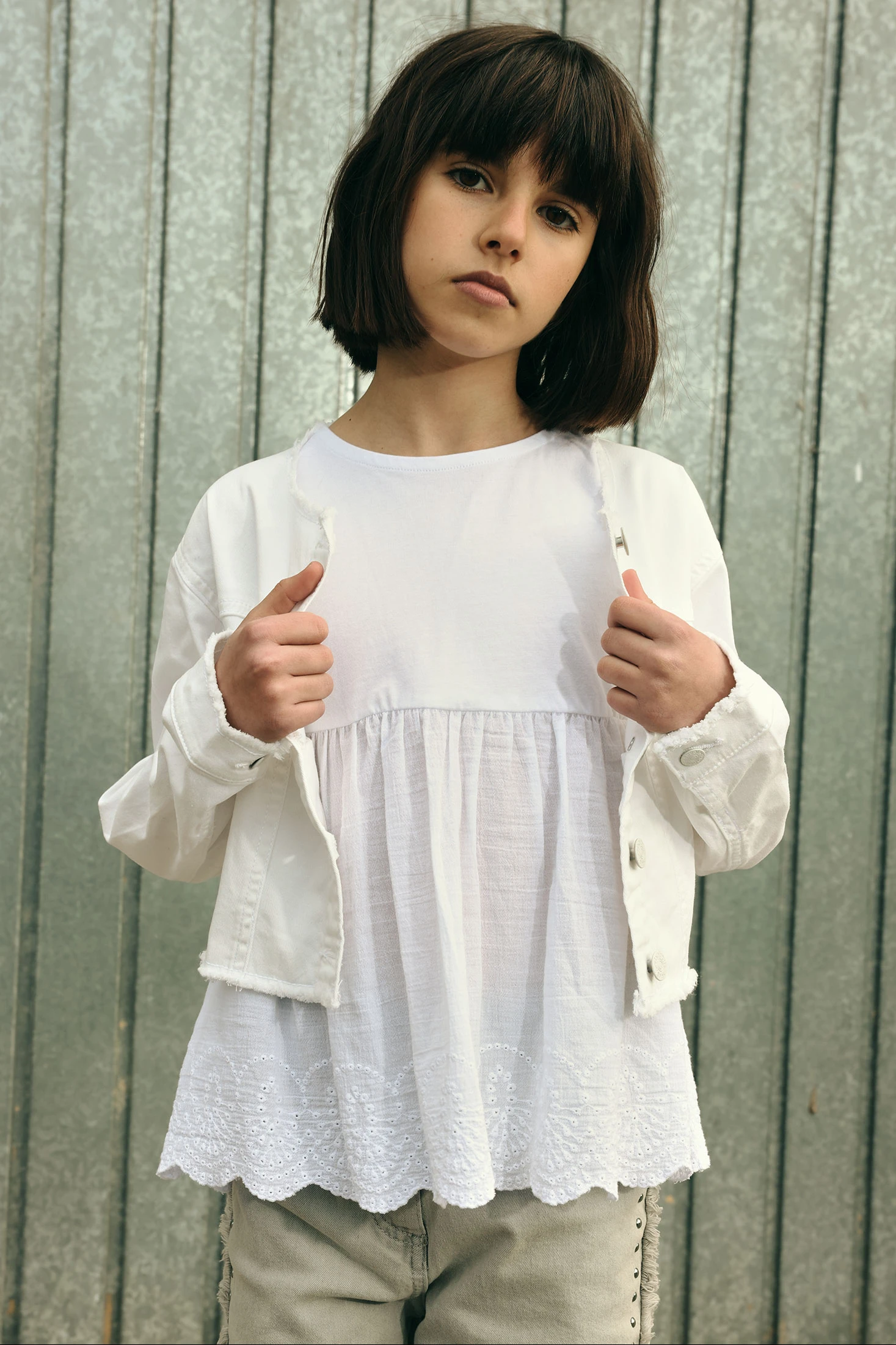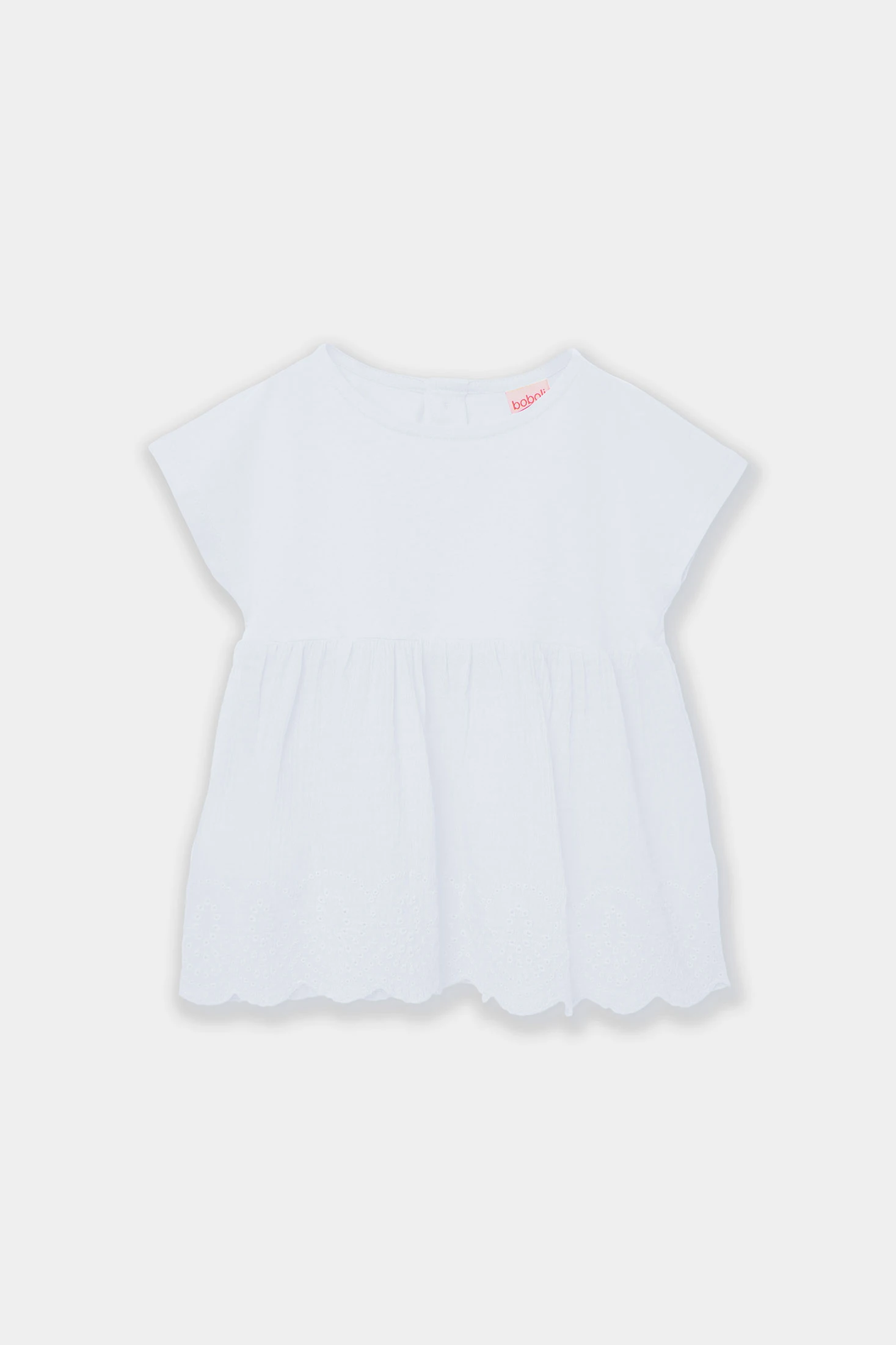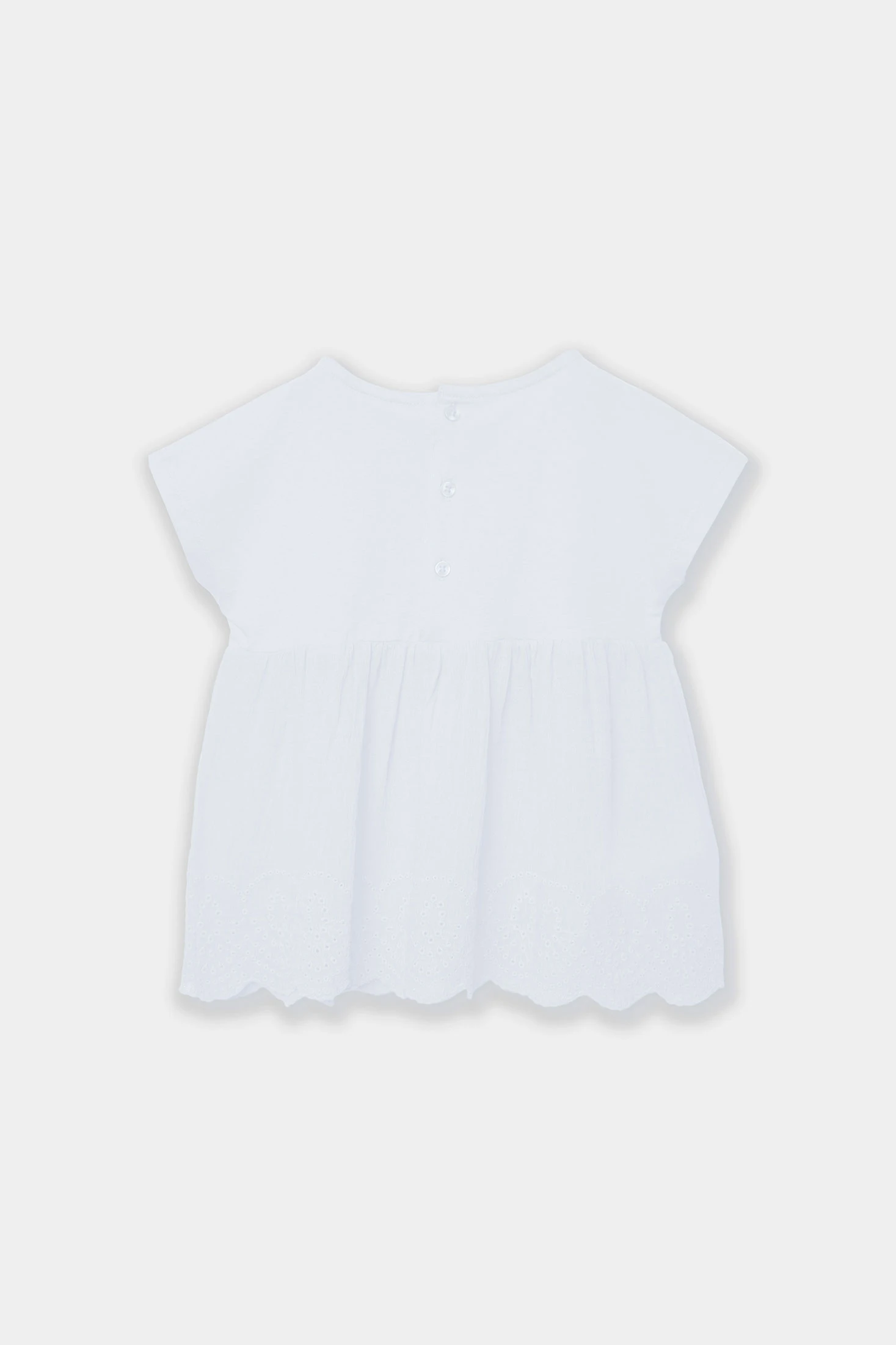Combined knitted T-shirt for girls, made from soft white cotton, ideal for the spring and summer season. Its design includes a delicate trim at the hem, adding an elegant touch. Perfect for babies from 12 months to girls aged 14 years. The loose fit provides comfort and freshness, making it suitable for everyday wear or special occasions. Its neutral colour allows for easy pairing with various styles and colours of bottom garments. A versatile and practical option that adds a touch of classic style to children?s wardrobes.