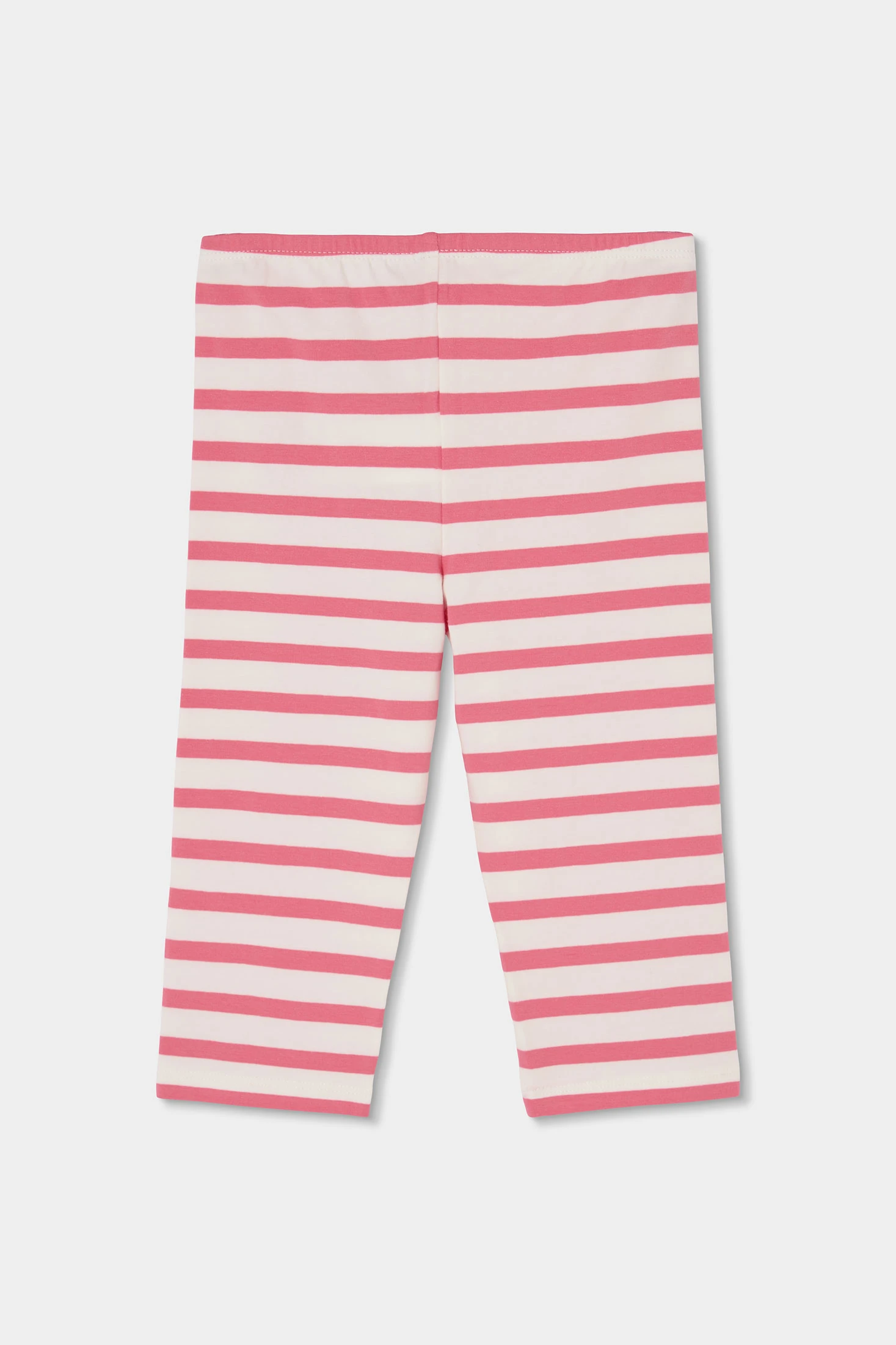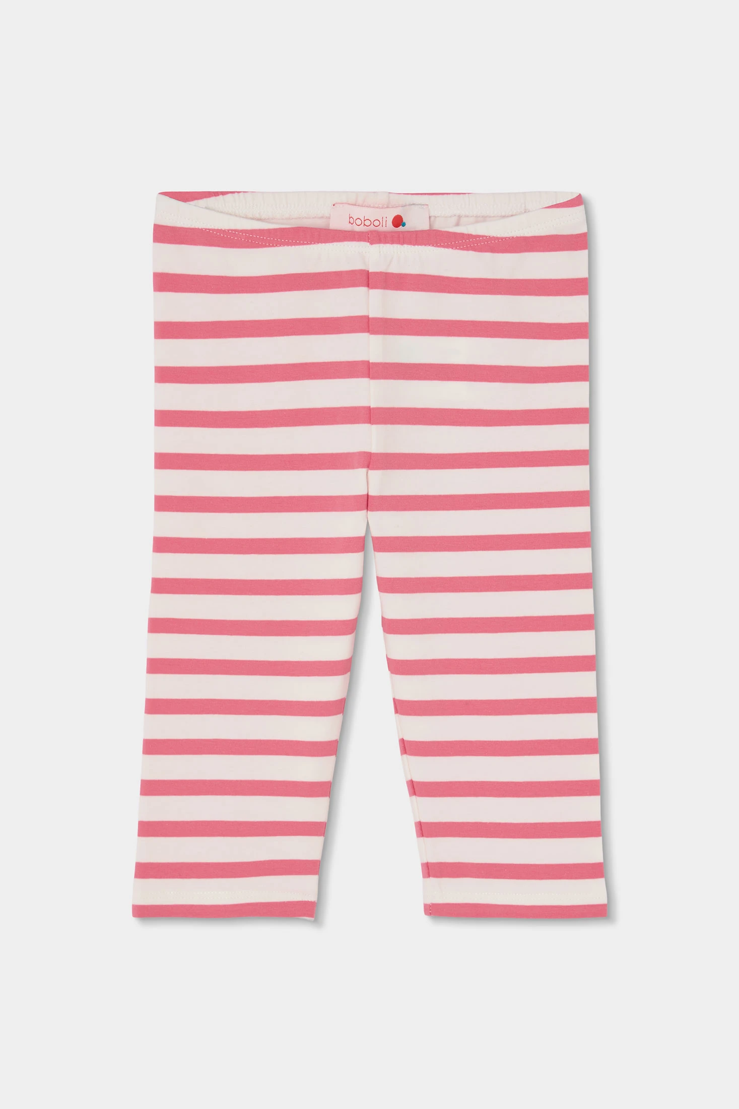 Cotton knit set for girls, ideal for the summer. It features a pink t-shirt with a multicoloured palm tree print and the phrase "good vibes", paired with striped white and pink leggings. Perfect softness and comfort for play and relaxation days. Available in sizes from 12 months to 12 years. Cheerful and colourful design that adds a touch of freshness and youthful style, making this set a versatile and charming option for the season.